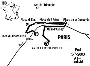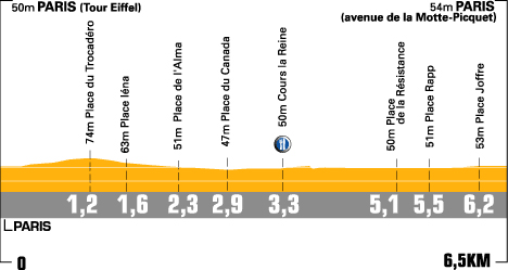 Paris / Tour Eiffel (km 0) - Boulevard Delessert - Place du Trocadéro (km 1.2) - Place d'Iéna (km 1.6) - Place de l'Alma - Place du Canada (km 2.9) - Place de la Concorde - Cours-la-Reine (km 3.3) - Quai d'Orsay