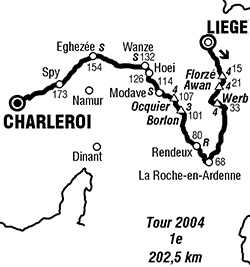 - Derrière l'échappée, Fassa-Bortolo roule fort pour Petacchi dans les rues de Huy et l'écart fond rapidement et passe sous les 30" au sprint de Modave (km 114), remporté par Eisel devant Voigt. Il reste un peu moins de 88 km à parcourir. Derrière le rythme élevé scinde le peloton et un paquet de 30 coureurs s'est détaché. On trouve les Euskaltel, Cipollini et McGee dans un groupe de chasse à 10" derrière. Sous l'impulsion des Euskaltel, le deuxième groupe recolle juste au moment où O'Grady crève. Il parviendra quand même à revenir avec ses co-équipiers de Cofidis après une chasse de 10 kilomètres.
