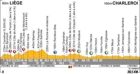 12h35 (BELGIQUE) - (Liège) : N30 Liège (km 0) - Côte de Florzé (km 15-GPM4) - Aywaille (km 18) - N86 Côte d'Awan (km 21-GPM4) - My (km 27.5) - N66 Ferrières (km 31) - Côte de Werbomont (km 33.5-GPM4) - N30 Harre (km 40) - (Luxembourg) : Manhay (km 49) - Dochamps (km 58) - D841 Samrée (km 59.5) - N89 La-Roche-en-Ardenne (km 68.5) - N833 Vecpré (km 72) - Rendeux-Bas (km 80-ravitaillement) - Durbuy (km 97) - Palenge (km 99.5) - Côte de Borlon (km 101.5-GPM3) - (Liège) : Ocquier (km 105) - N641 Côte d'Ocquier (km 107-GPM4) - Modave (km 114.5-sprint) - Huy (km 126) - N164 Wanze (km 132.5-sprint) - D643a Moha (km 133) - N643 Couthuin (km 135) - (Namur) : Bierwart (km 144) - Eghezée (km 154.5-sprint) - N912 Longchamps (km 156) - Temploux (km 172) - Jemappes - (Hainaut) : N29 Fleurus (km 190.5) - Farciennes - N572 Montigny-sur-Sambre (km 197) - N575 Charleroi (km 200.5) - Charleroi / Rte de Philippeville (km 202.5).