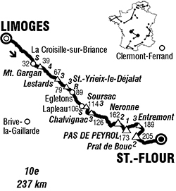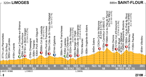 11h05 (Haute-Vienne) : D98 Limoges (km 0) - D65 Eyjeaux (km 6.5) - Saint-Paul (km 11) - Linards (km 22.5) - La Croisille-sur-Briance (km 32.5-sprint) - Surdoux (km 39) - Le Mont-Gargan (km 39.5-GPM4) - (Corrèze) : D16 Chamberet (km 44) - Treignac (km 55.5) - Lestards (km 65.5) - Col de Lestards (km 67-GPM3) - Saint-Yriex-le-Déjalat (km 79-GPM3) - Égletons (km 89-ravitaillement) - Lapleau (km 106.5-sprint) - Côte de Soursac (km 114.5-GPM3) - Soursac (km 115) - (Cantal) : D105 Barrage de l'Aigle (km 122.5) - Côte de Chalvignac (km 126.5-GPM3) - D678 Mauriac (km 132.5) - D122 Anglards-de-Salers (km 141.5) - D22 Nuzerolles (km 146) - Salers (km 152.5) - D680 Col de Néronne (km 162-GPM2) - Col du pas de Peyrol/Le Puy-Mary (km 173.5-GPM1) - Dienne (km 185.5) - D3 Col d'Entremont (km 189-GPM3) - Murat (km 194.5) - D39 Albepierre-Bredons (km 200) - Col du Prat-de-Bouc/Plomb du Cantal (km 205.5-GPM2) - Bélinay (km 210) - Paulhac (km 216) - Villedieu (km 230.5) - Saint-Flour / Allée Georges Pompidou (km 237).