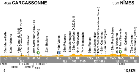 12h50 (Aude) : D610 Carcassonne (km 0) - Marseillette (km 7.5) - Puichéric (km 15) - D5 Pouzols-Minervois (près de) (km 33.5) - Cabezac (km 38) - (Hérault) : D11 La Croisade (km 45) - D11 Capestang (km 53-sprint) - Montady (km 59) - Béziers (km 65) - N9 La Bégude-de-Jordy (km 80.5) - Valros (km 81.5-ravitaillement) - Tourbes (près de) (km 87.5) - D913 Pézenas (km 89.5) - N113 Montagnac (km 96.5) - D5 Villeveyrac (km 108) - D5 Montbazin (km 114.5) - Cournonterral (près de) (km 121.5) - Pignan (près de) (km 124.5) - Lavérune (km 127.5) - Montpellier (km 132) - N113 Castelnau-le-Lez (km 139.5) - Le Cres (km 143) - N110 Vendargues (km 146) - Castries (km 148.5) - Restinclières (km 155.5) - Boisseron (km 162) - (Gard) : Sommières (km 164) - D40 Villevieille (km 166.5-sprint) - Congénies (km 171.5) - Calvisson (près de) (km 174) - Saint-Dionisy (près de) (km 178.5) - Langlade (près de) (km 181) - Caveirac (km 183) - Nîmes / Pl. Jules Guesde (km 192.5).