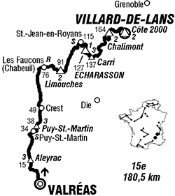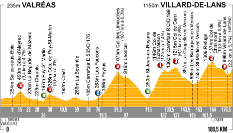 D24 Salles-sous-Bois (km 9) - D9 Côte d'Aleyrac (km 15-GPM3) - La Bégude-de-Mazenc (km 22) - Châteauneuf-de-Mazenc (près de) (km 23.5) - Charols (km 28) - Cléon d'Andran (km 30.5) - D6 Puy-Saint-Martin (km 38-sprint) - Côte de Puy-Saint-Martin (km 38-GPM3) - La Répara-Auriples (km 41.5) - D538 Lambres (km 47.5) - D888 Crest (km 49.5) - D538 Vaunaveys-la-Rochette (km 56) - La Paillette (km 63.5) - D68 Les Faucons (km 76-ravitaillement) - Peyrus (km 79.5) - Col des Limouches (km 91.5-GPM2) - D70 La Vacherie (km 94.5) - Léoncel (km 97) - Oriol-en-Royans (km 112.5) - Saint-Jean-en-Royans (km 115-sprint) - Col de l'Écharasson (km 127-GPM1) - D199 Col de Carri (km 137-GPM3) - D178 La Chapelle-en- Vercors (km 143.5) - D518 Les Baraques-en-Vercours (km 149) - D103 Saint-Martin-en-Vercors (km 153) - D221 Col de Chalimont (km 164) - (Isère) : D215c Col d'Herbouilly (km 165) - D531 Villard-de-Lans (km 176.5) - D215b Villard-de-Lans / Côte 2000 (km 180.5-GPM2).