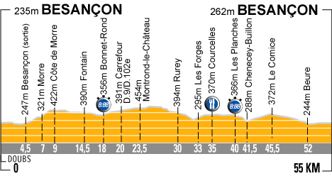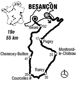 11h00 à 16h37 (Doubs) : N57 Besançon (km 0) - Morre (km 7) - Côte de Morre (km 9) - N57 Carr. D104 (km 9) - D104 Fontain (près de) (km 14) - Pugey (près de) (km 17.5) - D141 Bonnet-Rond (km 18-chrono) - D9 - D102E Montrond-le-Château (km 23.5) - D102 Épeugney (km 27) - D101 Rurey (km 30) - Les Forges (km 33) - Courcelles (km 35-ravitaillement) - D110 Charnay (km 39) - D40 Les Planches (km 40-chrono) - Chenecey-Buillon (km 41.5) - D110 Carr. N83 (km 44.5) - N83 Le Comice (km 45.5) - Larnod (km 47.5) - Beure (km 52) - N273 Besançon / Bd. Ouest (km 55).