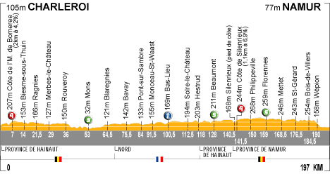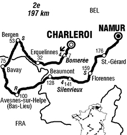 12h53 (BELGIQUE) - (Hainaut) : N53 Charleroi (km 0) - Côte du M de Bomerée (km 7-GPM4) - Biesmes-sous-Thuin (km 14) - N561 Ragnies (km 21.5) - Erquelinnes (km 32) - N40 Grand-Reng (km 35.5) - Saint-Symphorien (km 50) - Mons (km 53-sprint) - N543 Genly (km 60.5) - (FRANCE) - (Nord) : D932 Malplaquet (km 69) - Bavay (km 75.5) - Aulnoye-Aymeries (km 87.5) - D951 Montceau-Saint-Waast (km 91.5) - Avesnes-sur-Helpe (km 99) - N2 Bas-Lieu (km 100.5-ravitaillement) - D962 Beugnies (km 107) - L'Écrevisse (km 114.5) - (BELGIQUE) - (Hainaut) : N596 Grandrieu (km 119.5) - N597 Leval-Chaudeville (km 125) - N53 Beaumont (km 126.5-sprint) - N40 Beaumont (km 128-sprint) - (Namur) : Côte de Silenrieux (km 141.5-GPM4) - Philippeville (km 150) - N97 Vodecée (km 153.5) - N98 Florennes (km 159-sprint) - N933 Pont-au-Ri (km 172) - Saint-Gérard (km 176.5) - N951 Lesve (km 181.5) - Wépion (km 190) -
