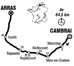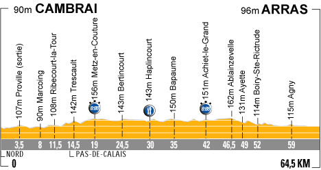 Noyelles-sur-Escaut (km 5.5) - Marcoing (km 8) - Ribécourt-la-Tour (km 11.5) - (Pas-de-Calais) : Trescault (km 14.5) - Metz-en-Couture (km 19-chrono) - Ruyaulcourt (km 22.5) - Bertincourt (km 24.5) - Haplincourt (km 30-ravitaillement) - Bancourt (km 32.5) - Bapaume (km 35) - Avesne-lès-Bapaume (km 37) - Biefvillers-lès-Bapaume (km 38.5) - Bihucourt (km 40.5) - Achiet-le-Grand (km 42-chrono) - Ablainzevelle (km 46.5) - D919 Ayette (km 49) - Boiry-sainte-Rictrude (km 52) - Mercatel (km 56.5) - Agny (près de) (km 59) - Beaurains (km 60) - Achicourt (km 60.5) - Arras / entrée (km 61.5) - Arras /Grand'Place (km 64.5).