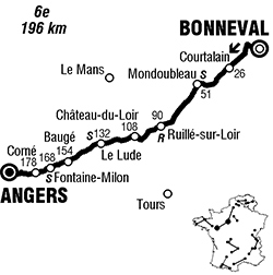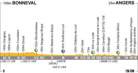 Dangeau (près de) (km 6.5) - D941 Cormeray (km 7.5) - Logron (km 13) - D17 Villardon (km 16) - Châtillon-en-Dunois (km 20) - D927 Courtalain (km 26) - (Loir-et-Cher) : Droué (km 33.5) - La Chapelle-Vicomtesse (km 40) - D106 Mondoubleau (km 51.5-sprint) - D921 Cormenon (km 53) - Montplaisir (km 62) - Savigny-sur-Braye (km 66) - (Sarthe) : D8 Bessé-sur-Braye (km 74) - Pont-de-Braye (km 82) - D305 Poncé-sur-le-Loir (km 85) - Ruillé-sur-Loir (km 90-ravitaillement) - La Charte-sur-le-Loir (km 92) - N138 Coémont (km 107.5) - Château-du-Loir (km 108) - D305 Les Moriers (km 114.5) - Aubigné-Racan (près de) (km 125) - Le Lude (km 132-sprint) - Savigné-sous-le-Lude (km 139.5) - (Maine-et-Loire) : D817 Baugé (km 154.5) - D61 Le Vieil-Baugé (km 157) - Fontaine-Milon (km 168) - Le Point-du-Jour (km 175) - N147 Corné (près de) (km 178) - D61 Saint-Barthélémy-d'Anjou (km 187.5) - Angers / Bd. de la Résisitance (km 196).