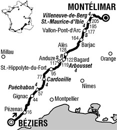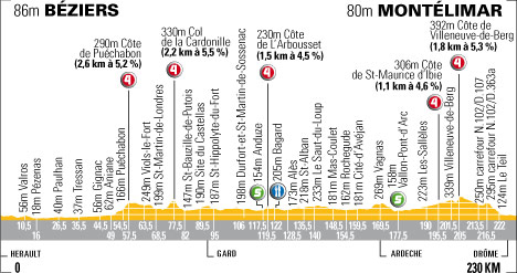 ![]() samedi 15 juillet 2006 ![]() 11h45 (Hérault) : N9 Béziers (km 0) - Valros (km 10.5) - N913 Pézénas (km 16) - Paulhan (km 26.5) - D30 Carr. D32 (km 30) - D32 Bélarga (km 31.5) - Tressan (km 35.5) - Gignac (km 44.5) - Aniane (km 49) - Puéchabon (km 55.5) - Côte de Puéchabon (km 57.5-GPM4) - Saint-Martin-de-Londres (km 58.5) - Viols-le-Fort (km 67.5) - Col de la Cardonille (km 77.5-GPM4) - Saint-Bauzille-de-Putois (km 82) - Site du Castellas (km 89.5) - (Gard) : D195 Carr. D999 (km 92.5) - D999 Saint-Hyppolite-du-Fort (km 95) - D999 Carr. D982 (km 98) - D982 Dufort et Saint-Martin-de-Sossenac (km 106) - D907 Anduze (km 117.5-sprint) - D910a Côte de l'Arboussef (km 119.5-GPM4) - Bagard (km 122-ravitaillement) - Saint-Christol-les-Alès (km 125.5) - N110 Alès (km 128.5) - Saint-Alban (km 135.5) - Le-Saut-du-Loup (km 140) - Mas-Coulet (km 148.5) - D16 Moulin de Peyrolle (km 150) - Rochegude (km 154.5) - D979 Saint-Jean-de-Maruéjols (km 157.5) - Cité d'Avéjan (km 159.5) - Barjac (km 164.5) - (Ardèche) : Vagnas (km 169.5) - Vallon-Pont-d'Arc (km 177.5-sprint) - D1 Tabias (km 179.5) - D1 Carr. D558 (km 180.5) - Les Sallèles (km 190) - Saint-Maurice d'Ibie (km 194.5) - Côte de Saint-Maurice d'Ibie (km 195.5-GPM4) - Villeneuve-de-Berg (km 201.5) - D202 Carr. N102 (km 203) - Côte de Villeneuve-de-Berg (km 205-GPM4) - Saint-Jean-le-Centenier (près de) (km 205) - N102 Carr. D107 (km 213.5) - Le Teil (km 222) - (Drôme) : Montélimar / entrée (km 227.5) - Montélimar / Av. J.F. Kennedy (km 230). ![]() ![]() ![]() 160 partants. Météo : temps ensoleillé et très chaud. - Sous une grosse chaleur, les candidats à l'échappée se manifestent dès le départ, notamment Garcia Acosta & Verbrugghe au km 5 puis Martinez au km 11 mais tous sont repris. Au km 21, six coureurs sortent du peloton : Voigt, Pereiro, Chavanel, Coyot, Grivko & Quinziato alors qu'il reste 200 kilomètres à parcourir. L'écart n'est pas encore creusé quand Coyot se relève. Il reste 5 coureurs en tête. - Dès lors, le peloton se désintéresse de l'échappée et l'écart se creuse dans des proportions inhabituelles : 19'50" au ravitaillement de Bagard (km 122). L'équipe Phonak ne prend pas ses responsabilités, le "trou" devient béant : 28'20" à une quarantaine de kilomètres de la ligne. Pereiro est le mieux placé des cinq (46ème à 28'50") et les suiveurs commencent à lorgner sur le classement général. - Au km 205, Grivko tente de filer dans la côte de Villeneuve-de-Berg mais il va payer cet effort et se faire décrocher du groupe. Après plusieurs autres attaques, Voigt attaque aux 4000 mètres et il est suivi de Pereiro. Chavanel et Quinziato se regardent et perdent le contact. Jens Voigt remporte l'étape en force devant l'Espagnol. Chavanel et Quinziato arrivent 40" plus tard. Grivko est à 6'24". McEwen règle le peloton à... 29'57" du vainqueur ! Les Rabobank avaient un moment assuré une poursuite mais les Phonak, reprenant le tempo, ont volontairement ralenti l'allure. - A la surprise générale, Oscar Pereiro s'empare du maillot jaune avec 1'29" sur Landis et 1'37" sur Dessel toujours bien placé. La totalité du peloton était hors-délais (9% du temps du vainqueur) mais les commissaires l'augmentent à 10% (une clause permettant de le faire lorsque plus de 20% du peloton est éliminé). Du coup Hunter et Nicolas Jalabert, arrivés encore plus tard que le peloton, en profitent également ! La morale sportive aurait été l'élimination des 155 coureurs mais les pressions médiatique et financière ne le permettent pas. On se souvient pourtant du Trreno-Adriatico 1998 où 125 coureurs avaient été éliminés. ![]() Étape : ![]() 1. Jens Voigt (All) en 5h24'36" (moy : 42.514 km/h) 2. Oscar Pereiro (Esp) 3. Sylvain Chavanel (Fra) à 40" 4. Manuel Quinziato (Ita) 5. Andriy Grivko (Ukr) à 6'24" 6. Robbie McEwen (Aus) à 29'57" 7. Bernhard Eisel (Aut) 8. Tom Boonen (Bel) 9. Carlos Da Cruz (Fra) 10. Arnaud Coyot (Fra) 11. Marco Velo (Ita) 12. Thor Hushovd (Nor) 13. Francisco José Ventoso (Esp) 14. Luca Paolini (Ita) 15. Erik Zabel (All) 16. Gert Steegmans (Bel) 17. Daniele Bennati (Ita) 18. David Kopp (All) 19. Björn Schröder (All) 20. Nicolas Portal (Fra) 21. Philippe Gilbert (Bel) 22. Sebastian Lang (All) 23. Julian Dean (Nzl) 24. Christophe Laurent (Fra) 25. Miguel Angel Martin Perdiguero (Esp) 26. Cyril Dessel (Fra) 27. Matej Mugerli (Slo) 28. Jimmy Casper (Fra) 30. Iñaki Isasi (Esp) 31. Denis Menchov (Rus) 32. Johan Van Summeren (Bel) 33. Matteo Tosatto (Ita) 34. Bert Grabsch (All) 35. Marzio Bruseghin (Ita) 36. Georg Totschnig (Aut) 37. Fabian Wegmann (All) 38. Moises Dueñas (Esp) 39. Christophe Moreau (Fra) 40. Christian Knees (All) 41. Andreas Klöden (All) 42. Magnus Bäckstedt (Sue) 43. Bram De Groot (Hol) 44. Christophe Brandt (Bel) 45. Markus Fothen (All) 46. Yaroslav Popovych (Ukr) 47. Cadel Evans (Aus) 48. Axel Merckx (Bel) 49. Kjell Carlström (Fin) 50. Stuart O'Grady (Aus) 51. Thomas Voeckler (Fra) 52. Carlos Sastre (Esp) 53. Christian Vandevelde (Usa) 54. Haimar Zubeldia (Esp) 55. Mirko Celestino (Ita) 56. Peter Wrolich (Aut) 57. George Hincapie (Usa) 58. Steven De Jongh (Hol) 59. Benoît Salmon (Fra) 60. Alexandre Botcharov (Rus) 61. Tadej Valjavec (Slo) 62. Koos Moerenhout (Hol) 63. José Luis Arrieta (Esp) 64. Levi Leipheimer (Usa) 65. Juan Miguel Mercado (Esp) 66. Bram Tankink (Hol) 67. Filippo Pozzato (Ita) 68. Wim Vansevenant (Bel) 69. David Arroyo (Esp) 70. Patrik Sinkewitz (All) 71. Salvatore Commesso (Ita) 72. Gustav-Erik Larsson (Sue) 73. Fränk Schleck (Lux) 74. Christophe Mengin (Fra) 75. Thomas Lövkvist (Sue) 76. Samuel Dumoulin (Fra) 77. Unai Etxebarria (Ven) 78. Anthony Geslin (Fra) 79. Mario Aerts (Bel) 80. David Cañada (Esp) 81. Pieter Weening (Hol) 82. Ralf Grabsch (All) 83. Benoît Vaugrenard (Fra) 84. Stéphane Goubert (Fra) 85. Christophe Rinero (Fra) 86. Beat Zberg (Sui) 87. José Luis Rubiera (Esp) 88. José Azevedo (Por) 89. Michael Boogerd 