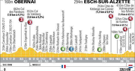 Ottrott (km 0.5) - Klingentahl (km 2.5) - D204 Carr. D217 (km 6) - D717 Dinsheim-sur-Bruche (km 13) - Urmatt (près de) (km 25) - Oberhaslach (km 23) - Col des Pandours (km 35.5-GPM3) - D218 Carr. D143 (km 45.5) - D143 Obersteige (km 46) - Col de Valsberg (km 50-GPM3) - (Moselle) : Dabo (km 57) - D96 Buhl-Lorraine (km 74) - Sarrebourg (km 76.5) - D27 haut-Clocher (km 82) - Rorbach-les-Dieuze (km 98) - Marimont-lès-Bénestroff (km 107-sprint) - Bermering (km 115) - Morhange (km 120-ravitaillement) - N74 Baronville (km 123) - Faulquemont (km 135) - Fouligny (km 146) - Bionville-sur-Nied (km 148.5) - Boulay-Moselle (km 159) - Holling (km 169.5-sprint) - Remelfang (km 170.5) - Côte de Kédange-sur-Canner (km 187.5-GPM4) - Metzervisse (km 189.5) - Yutz (km 198.5-sprint) - D935a Thionville (km 199) - N53 Manom (km 202) - Hettange-Grande (km 204.5) - Côte de Kanfen (km 212.5-GPM4) - Côte de Volmerange-les-Mines (km 213-GPM4) - Ottange (km 217.5) - (LUXEMBOURG) - N33 Rumelange (km 218.5) - Esch-sur-Alzette / Bd. Grande Duchesse Charlotte (km 228.5).