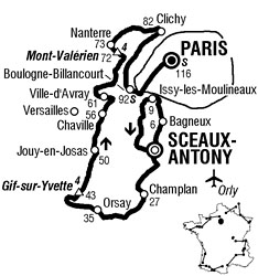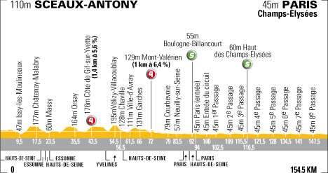 13h50 (Hauts-de-Seine) : D60 Antony (km 0) - Sceaux (km 2.5) - Châtillon (km 5) - Malakoff (km 7) - D71 Vanves (km 8.5) - Issy-les-Moulineaux (km 9.5) - Châtenay-Malabry (km 17.5) - (Essonne) : Massy (km 23.5) - D156 Palaiseau (km 25.5) - D118 Villebon-sur-Yvette (km 33.5) - D218 Les Ullis (km 34) - N446 Orsay (km 35.5) - N306 Côte de Gif-sur-Yvette (km 43.5-GPM4) - D446 Saclay (km 48.5) - (Yvelines) : D53 Vélizy-Villacoublay (km 54.5) - (Hauts-de-Seine) : Chaville (km 56.5) - D910 Sèvres (km 59.5) - D907 Garches (km 66) - D3 Mont-Valérien (km 72-GPM4) - Nanterre (km 72) - D908 Courbevoie (km 79) - D1 Levallois-Perret (km 82) - (Hauts-de-Seine) : D907 Boulogne-Billancourt (km 92-sprint) - (Paris) : Pont de l'Alma (km 97.5) - Rue de Rivoli (km 101) - Place de la Concorde (km 102) - 1er passage (km 102.5) - 3ème passage (km 115.5-sprint) - 9ème passage (km 147.5) - Paris / Champs-Élysées (km 154.5).