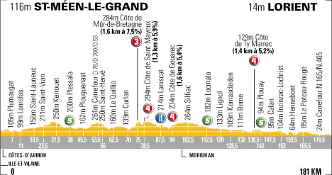 12h33 (Ile-et-Vilaine) : D125 Saint-Méen-le-Grand (km 0) - (Côtes-d'Armor) : D19 Plumaugat (km 7) - D76 Saint-Launeuc (km 18.5) - Saint-Vran (km 23.5) - D22 Plessala (km 38-sprint) - Plouguenast (km 45.5) - D76 Carr. D700-D53 (km 53.5) - D7 Uzel (près de ) (km 56.5) - Mûr-de-Bretagne (km 71.5) - Côte de Mûr-de-Bretagne (km 75-GPM3) - Côte de Saint-Mayeux (km 78.5-GPM4) - Saint-Mayeux (près de) (km 78.5) - D76 Laniscat (km 87.5-ravitaillement) - D5 Gouarec (km 92) - Côte de Gouarec (km 94-GPM4) - (Morbihan) : D15 Silfiac (près de) (km 102.5) - Locmalo (km 112.5-sprint) - Guémené-sur-Scorff (km 113.5) - D50 Berné (près de) (km 132) - D50 Carr. D204 (km 136.5) - D769 Côte de Ty-Marrec (km 138.5-GPM4) - D769bis Plouay (km 142-sprint) - Kerchopine (km 127) - D113 Calan (km 147.5) - Inzinzac-Lochrist (km 153) - D145 Lochrist (km 155.5) - D23 Kerpotence (km 157.5) - D724 Hennebont (km 159.5) - D769bis Le Poteau Rouge (km 165.5) - D26 Saint-Séverin (km 167.5) - D769 Caudan (km 172) - D769 Carr. N165 (km 173.5) - N165 Carr. N465 (km 174.5) - N465 Lorient / entrée (km 179) - N162bis Carr. D162 (km 180) - Lorient / Av. Jean Jaurès (km 181).