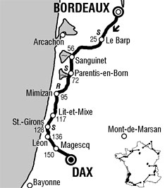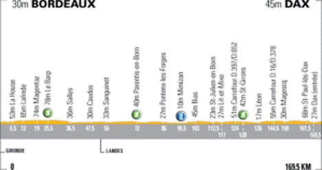 13h35 (Gironde) : N10 Bordeaux (km 0) - Gradignan (km 1) - La House (km 6.5) - Réjouit (km 8.5) - Lalinde (km 12) - Jauge (km 14) - Le Barp (km25.5-sprint) - Lavignolle (km 29.5) - D108 Salles (km 36.5) - La Caplanne (km 41) - Caudos (km 47.5) - (Landes) : D45 Carr. D652 (km 55.5) - D652 Sanguinet (km 56) - D46 Parentis-en-Born (km 72-sprint) - D46 Eyslet (km 77) - Pontenx-les-Forges (km 86) - D626 Saint-Paul-en-Born (km 89.5) - Aureilhan (km 93) - Mimizan (km 95.5-ravitaillement) - D652 Bias (km 103) - Saint-Julien-en-Born (km 112.5) - Lit-et-Mixe (km 117) - Mixe (km 122) - Saint-Girons (km 128-sprint) - Bourg-de-Vielle (km 132) - Léon (km 136) - D16 Magescq (km 150) - Saint-Paul-lès-Dax (km 161.5) - D459 Carr. D70 (km 164.5) - D70 Dax / entrée (km 165.5) - Dax / Rte de Tercis (km 169.5).