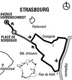 13h15 à 16h10 (Bas-Rhin) : Strasbourg / Ohmacht (km 0) - Bd. Jacques Preiss (km 0.5) - Bd. de la Dordogne (km 0.7) - Allée de la Robertsau (km 0.8) - Bd. du Président Edwards (km 1.2) - Bd. de l'Orangerie (km 1.7) - Rue François-Xavier Richter (km 2) - Rue du Conseil des Quinze (km 2.2) - Rue Boussingault (km 2.3) - Rue du Général Conrad (km 2.6) - Rue du Général Picquart (km 3.3) - Quai des Belges (km 3.7) - Rue de Kehl (km 4) - Rue Tarade (km 4.2) - Av. de la Forêt Noire (km 4.4) - Bd. de la Marne (km 4.8) - Bd. d'Anvers (km 5.1) - Bd. Tauler (km 5.6) - Bd. de la Dordogne (km 5.9) - Bd. Jacques Preiss (km 6) - Place de Bordeaux (km 6.7) -