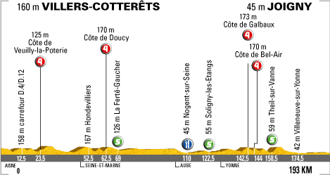12h50 (Aisne) : Villers-Cotterêts (km 0) - La Ferté-Millon (km 7.5) - D11 Chézy-en-Orxois (km 16.5) - Côte de Veuilly-la-Poterie (km 23.5-GPM4) - Marigny-en-Orxois (km 26.5) - Charly-sur-Marne (km 38) - D82 Pavant (près de) (km 41.5) - D86 Nogent-l'Artaud (km 43.5) - (Seine-et-Marne) : D222 Hondevilliers (km 52.5) - D6 Bellot (km 60) - Côte de Doucy (km 62.5-GPM4) - La Ferté-Gaucher (km 69-sprint) - D71 Saint-Mars-Vieux-Maisons (km 75) - Cerneux (km 82.5) - D15 Auger-en-Brie (km 84) - Villiers-Saint-Georges (km 89.5) - D72 Beauchery-Saint-Martin (km 93.5) - Chennetron (km 97) - Chalautre-la-Grande (km 104) - (Aube) : D40a Nozeaux (km 106) - D951a Port-Saint-Nicolas (km 108) - Nogent-sur-Seine (km 110-ravitaillement) - D374 Fontaine-Mâcon (km 115) - Soligny-les-Étangs (km 122.5-sprint) - Trancault (km 126) - (Yonne) : D25 Saint-Maurice-aux-Riches-Hommes (km 129) - D939 Thorigny-sur-Oreuse (km 140.5) - D40 Côte de Galbaux (km 144-GPM4 ) - Voisines (km 146.5) - Côte de Bel-Air (km 148.5-GPM4) - Le Petit-Villiers (km 157) - D905 Theil-sur-Vanne (km 158.5-sprint) - Les Bordes (km 168) - Villeneuve-sur-Yonne (km 174.5) - N6 Armeau (km 180.5) - N2006 Villecien (km 186) - Saint-Aubin-sur-Yonne (km 187.5) - Joigny (km 190.5) - D943 Quai du Premiers-Dragons / Joigny (km 193).