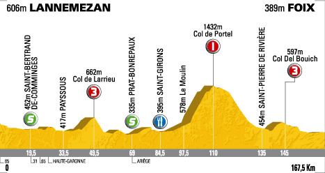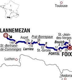 ![]() mercredi 16 juillet 2008 ![]() 12h45 (Hautes-Pyrénées) : Lannemezan (km 0) - Escala (km 0.5) - D938 Tuzaguet (km 4.5) - Anères (km 6.5) - D26 Nestier (km 8.5) - Montegut (km 10.5) - Aventignan (km 12) - Tibiran-Jaunac (km 15.5) - (Haute-Garonne) : Saint-Bertrand-de-Comminges (km 19.5-sprint) - (Hautes-Pyrénées) : Sarp (près de) (km 21.5) - D122 Izaourt (km 22) - Loures-Barousse (km 22.5) - (Haute-Garonne) : Barbazan (km 24.5) - D26 Garnère (km 28.5) - D9 Sauveterre-de-Comminges (km 29.5) - D26 Bagen (km 30.5) - Ilhan (km 32) - Payssous (km 33.5) - D34 Cabanac-Cazaux (km 36) - Izaut-de-l'Hôtel (km 38) - Girosp (km 40.5) - Aspet (km 42.5) - Col de Larrieu (km 49.5-GPM3) - Barat (km 54) - D13 La Ribereuille (km 55) - Castelbiague (km 58) - D60 Saleich (km 62.5) - (Ariège) : Prat-Bonrepaux (km 69-sprint) - D33a Cazavet (km 74) - Montgauch (km 77) - Saint-Lizier (km 82) - D117 Saint-Girons (km 84.5-ravitaillement) - Riverenert (km 93.5) - Le Moulin (km 97.5) - Le Lauch (km 99.5) - Rougé (km 100.5) - Les Cabesses (km 101) - D18 Col de la Crouzette (km 106.5) - D72 Col de Portel (km 110-GPM1) - Col de Péguère (km 113.5) - D17 Col des Marrous (km 122) - Burret (km 127) - La Mouline (km 131) - La Coupière (km 132) - Saint-Pierre-de-Rivière (km 135) - Mouragues (km 136.5) - Foix (km 139) - Cos (près de) (km 142.5) - D117 Col del Bouich (km 145-GPM3) - D11 Patau (km 154.5) - D919 Les Vergès (km 160.5) - Saint-Jean-de-Verges (km 161.5) - Foix / entrée (km 164) - Foix / Av. Gabriel Fauré (km 167.5). ![]() ![]() ![]() 168 partants Météo : temps chaud. Moises Dueñas (Esp-Barloworld) a été contrôlé positif à l'E.P.O. et mis hors-course. Barloworld annonce très rapidement qu'elle ne continuera pas dans le cyclisme. - De nombreuses attaques en début d'étape : Voeckler est le plus virulent mais l'allure rapide du peloton ne permet pas aux combatifs de réussir. Il faut attendre le km 39 pour voir se détacher : Arvesen, Wegmann, Ballan, Botcharov, Fofonov, Steegmans, Elmiger, Moerenhout, Velo, Vaugrenard & Moinard. Fédrigo et Pozzato les prennent en chasse et les rejoignent au km 44, soit 13 coureurs à l'avant. Isasi et Garcia Acosta tenteront eux-aussi de contrer mais ils échouent. Le ralentissement du peloton permet aux groupe de tête d'augmenter leur avance qui se monte à 15'15" au pied du col de Portel. Botcharov est le mieux placé au C.G à 20'47" - Dans l'ascension de ce col, Moinard se porte à l'avant à 8 kilomètres du sommet (km 102). Il passe le col (km 110) avec 1'50" sur Fédrigo qui mène le groupe d'échappés, 14'35" sur Pereiro intercalé et 16'30" sur le peloton. Dans la descente, Moinard augmente son avantage à 2'15". Pereiro se relève après le col Del Bouich, à 20 kilomètres du but et attend le peloton. A 4000 mètres de la ligne d'arrivée à Foix, Moinard est repris par ses anciens compagnons d'échappée. Aussitôt Arvesen attaque mais il est suivi par Elmiger puis Ballan. Le trio s'observe et permet le retour de Moerenhout. Le sprint est lancé et Arvesen l'emporte d'un demi-boyau. Il faudra la photo-finish pour le départager avec Elmiger et Ballan. Hushovd règle le peloton à 14'51". Journée tranquille pour Evans qui conserve le maillot jaune. ![]() Étape : ![]() 1. Kurt-Asle Arvesen (Nor) en 3h58'13" (moy: 42.188 km/h) 2. Martin Elmiger (Sui) 3. Alessandro Ballan (Ita) 4. Koos Moerenhout (Hol) à 2" 5. Alexandre Botcharov (Rus) à 11" 6. Pierrick Fedrigo (Fra) à 14" 7. Filippo Pozzato (Ita) 8. Benoît Vaugrenard (Fra) 9. Fabian Wegmann (All) 10. Marco Velo (Ita) 11. Dmitriy Fofonov (Kaz) 12. Amaël Moinard (Fra) à 29" 13. Thor Hushovd (Nor) à 14'51" 14. Erik Zabel (All) 15. Leonardo Duque (Col) 16. Oscar Freire (Esp) 17. Kim Kirchen (Lux) 18. Xavier Florencio (Esp) 19. Christian Vandevelde (Usa) 20. Juan Antonio Flecha (Esp) 21. Yaroslav Popovych (Ukr) 22. Arnaud Gérard (Fra) 23. Daniele Righi (Ita) 24. William Bonnet (Fra) 25. Frederik Willems (Bel) 26. George Hincapie (Usa) 27. Cadel Evans (Aus) 28. Fränk Schleck (Lux) 29. Denis Menchov (Rus) 30. Andy Schleck (Lux) 31. John-Lee Augustyn (Afs) 32. Sebastian Lang (All) 33. Dario-David Cioni (Ita) 34. Juan José Cobo (Esp) 35. Carlos Sastre (Esp) 36. Tadej Valjavec (Slo) 37. David Millar (Gbr) 38. Bram Tankink (Hol) 39. Aliaksandr Kuschynski (Blr) 40. Trent Lowe (Aus) 41. Christian Knees (All) 42. Kanstantsin Siutsou (Blr) 43. Maxime Monfort (Bel) 44. Thomas Lövkvist (Sue) 45. Jens Voigt (All) 46. Matteo Carrara (Ita) 47. Damiano Cunego (Ita) 48. Sylvain Chavanel (Fra) 49. Markus Fothen (All) 50. Björn Schröder (All) 51. Christophe Le Mével (Fra) 52. Eduardo Gonzalo (Esp) 53. Vladimir Efimkin (Rus) 56. Jesus Del Nero (Esp) 57. Joost Posthuma (Hol) 58. Haimar Zubeldia (Esp) 59. Stéphane Goubert (Fra) 61. Hubert Dupont (Fra) 62. Ruben Perez (Esp) 63. Pieter Weening (Hol) 64. Cyril Dessel (Fra) 65. Mikel Astarloza (Esp) 66. Simon Gerrans (Aus) 67. Amets Txurruka (Esp) 68. Paolo Tiralongo (Ita) 69. Laurens Ten Dam (Hol) 70. Ryder Hesjedal (Can) 71. Samuel Sanchez (Esp) 72. Marzio Bruseghin (Ita) 73. Rémi Pauriol (Fra) 74. Roman Kreuziger (Tch) 75. Stef Clement (Hol) 76. Volodymir Gustov (Ukr) 77. Ronny Scholz (All) 78. José Ivan Gutierrez (Esp) 79. Sandy Casar (Fra) 80. Oscar Pereiro (Esp) 81. Egoi Martinez (Esp) 82. Vincenzo Nibali (Ita) 83. Alejandro Valverde (Esp) 84. Rémy Di Gregorio (Fra) 85. Giampaolo Cheula (Ita) 86. David Arroyo (Esp) 87. Juan José Oroz (Esp) 88. Stijn Devolder (Bel) 89. Matteo Tosatto (Ita) 90. Marco Marzano (Ita) 91. Jérôme Pineau (Fra) 92. Jürgen Van de Walle (Bel) 93. David Moncoutié (Fra) 94. Mario Aerts (Bel) 95. Laurent Lefèvre (Fra) 96. Sylwester Szmyd (Pol) 97. Nicolas Vogondy (Fra) 99. Johann Tschopp (Sui) 100. David Lopez Garcia (Esp) 101. Yoann Le Boulanger (Fra) 102. Luis Leon Sanchez (Esp) 103. David De la Fuente (Esp) 104. Thomas Voeckler (Fra) 105. Fabian Cancellara (Sui) à 15'56" 106. Johan Van Summeren (Bel) à 16'42" 107. 