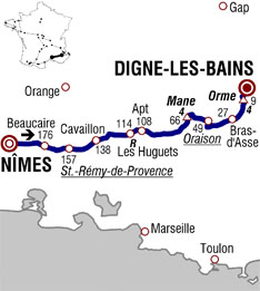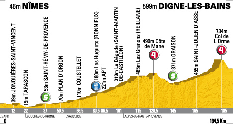 ![]() samedi 19 juillet 2008 ![]() 12h25 (Gard) : D999 Nîmes (km 0) - Rodilhan (près de) (km 2.5) - Manduel (près de) (km 6.5) - Redessan (près de) (km 7) - Jonquières-Saint-Vincent (km 12) - Beaucaire (km 18) - (Bouches-du-Rhône) : D99 Tarascon (km 22) - Saint-Étienne-du-Grès (km 27.5) - Mas-Blanc-des-Alpilles (km 31) - Saint-Rémy de Provence (km 37-sprint) - Mollèges / Gare (km 47.5) - Plan d'Orgon (km 50.5) - (Vaucluse) : D2 Cavaillon (km 56) - Taillades (km 60.5) - Robion (km 62.5) - Coustellet (km 66.5) - D900 Lumières (km 74.5) - Les Huguets (km 80.5-ravitaillement) - Apt (km 86.5) - La Bégude (km 101) - (Alpes de Haute-Provence) : D4100 Cereste (km 107) - Les Granons (km 115) - Mane (km 127) - Côte de Mane (km 128.5-GPM4) - Forcalquier (km 129.5) - Niozelles (près de) (km 136.5) - La Brillanne (km 140.5) - Oraison (km 145-sprint) - D907 La Julienne (km 157) - Trabaye (Brunet) (km 158.5) - Saint-Julien-d'Asse (km 165) - Bras d'Asse (km 167.5) - La Bégude-Blanche (km 168.5) - Estoublon (km 172.5) - Mézel (km 179.5) - Châteauredon (près de) (km 182.5) - N85 Col de l'Orme (km 185-GPM4) - Digne-les-Bains / entrée (km 191) - Digne-les-Bains / Front de Bléone (km 194.5). ![]() ![]() ![]() 158 partants Météo : temps chaud, vent favorable. - Au km 5, un groupe de 21 coureurs se détache parmi lesquels Voeckler, Casar, Velo etc. Seules les équipes Cofidis, Barloworld et Silence-Lotto ne sont pas représentées. Néanmoins le peloton se rapproche quand 4 hommes parviennent à s'en extraire peu après le sprint de St-Rémy de Provence au km 41 : Gutierrez, Casar, Tankink & Bonnet. Le peloton se calme alors et l'écart grandit pour atteindre son maximum de 6'50" au km 85. Plusieurs équipes se mettent déjà à l'ouvrage (Liquigas,Milram, Bouygues) et les fuyards ne possèdent plus que 1'20" au km 151. - A 28 bornes de la ligne d'arrivée, Gutierrez passe à l'attaque et trois kilomètres plus loin, il précède de 20" Casar et Tankink, de 50" Bonnet, de 1' le peloton qui reprend petit à petit les anciens compagnons de l'Espagnol. Voeckler contre-attaque dans le col de l'Orme. Il échoue mais cette accélération condamne Gutierrez au km 183. Dans cette bosse, Cavendish est décroché. - Dans le descente, Gilbert puis Sylvain Chavanel (km 188) tentent leur chance sans succès, Chavanel est repris aux 1800 mètres. Le sprint, qui concerne un peloton de 90 coureurs, est réglé par Oscar Freire qui remporte ainsi la dernière étape avant la montagne. Situatuion inchangée en tête, Cadel Evans conserve le maillot jaune. ![]() Étape : ![]() 1. Oscar Freire (Esp) en 4h13'08" (moy: 46.102 km/h) 2. Leonardo Duque (Col) 3. Erik Zabel (All) 4. Julian Dean (Nzl) 5. Steven De Jongh (Hol) 6. Alessandro Ballan (Ita) 7. Ruben Perez (Esp) 8. Jérôme Pineau (Fra) 9. Matteo Tosatto (Ita) 10. Thor Hushovd (Nor) 11. Xavier Florencio (Esp) 13. Martin Elmiger (Sui) 14. Sebastian Lang (All) 15. Filippo Pozzato (Ita) 16. Geoffroy Lequatre (Fra) 17. John-Lee Augustyn (Afs) 18. Christopher Froome (Ken) 19. Iñaki Isasi (Esp) 20. Kim Kirchen (Lux) 21. Christian Vandevelde (Usa) 22. Gerald Ciolek (All) 23. Oscar Pereiro (Esp) 24. Fabian Cancellara (Sui) 25. Alejandro Valverde (Esp) 26. Dmitriy Fofonov (Kaz) 27. Romain Feillu (Fra) 28. Cadel Evans (Aus) 29. Kanstantsin Siutsou (Blr) 30. Peter Velits (Svq) 31. Yaroslav Popovych (Ukr) 33. Christian Knees (All) 34. Fränk Schleck (Lux) 35. Eduardo Gonzalo (Esp) 36. Mario Aerts (Bel) 37. Matteo Carrara (Ita) 38. Samuel Sanchez (Esp) 39. Nicolas Portal (Fra) 40. Maxime Monfort (Bel) 41. Kurt-Asle Arvesen (Nor) 42. Roman Kreuziger (Tch) 43. George Hincapie (Usa) 44. Alexandre Botcharov (Rus) 45. Marzio Bruseghin (Ita) 46. Jürgen Van de Walle (Bel) 47. Juan Antonio Flecha (Esp) 48. Niki Terpstra (Hol) 49. Philippe Gilbert (Bel) 50. Markus Fothen (All) 51. Samuel Dumoulin (Fra) 52. Thomas Lövkvist (Sue) 53. Damiano Cunego (Ita) 54. Vladimir Efimkin (Rus) 55. Andy Schleck (Lux) 56. Mikel Astarloza (Esp) 57. Simon Gerrans (Aus) 58. Tadej Valjavec (Slo) 59. Rémi Pauriol (Fra) 60. Vincenzo Nibali (Ita) 61. Danny Pate (Usa) 62. Christophe Le Mével (Fra) 63. Carlos Sastre (Esp) 64. Denis Menchov (Rus) 65. Sandy Casar (Fra) 66. Koos Moerenhout (Hol) 67. Pieter Weening (Hol) 68. Murilo Antonio Fischer (Bre) 69. Haimar Zubeldia (Esp) 70. Cyril Dessel (Fra) 71. Stéphane Goubert (Fra) 72. Benoît Vaugrenard (Fra) 73. Laurens Ten Dam (Hol) 74. Amets Txurruka (Esp) 75. Volodymir Gustov (Ukr) 76. David Arroyo (Esp) 77. Hubert Dupont (Fra) 78. Sylwester Szmyd (Pol) 79. Egoi Martinez (Esp) 80. Amaël Moinard (Fra) 81. David Le Lay (Fra) 82. David Millar (Gbr) 83. Laurent Lefèvre (Fra) 84. Marco Velo (Ita) 85. Nicolas Vogondy (Fra) 86. Stijn Devolder (Bel) 87. David Lopez Garcia (Esp) 88. Joost Posthuma (Hol) 89. Ronny Scholz (All) 90. David Moncoutié (Fra) 91. Marco Marzano (Ita) à 17" 92. Sylvain Chavanel (Fra) 93. Marcus Burghardt (All) à 44" 94. Adam Hansen (Aus) à 49" 95. Björn Schröder (All) 96. Ryder Hesjedal (Can) à 1'04" 97. Robert Hunter (Afs) à 2'50" 98. Carlos Barredo (Esp) 99. Stéphane Augé (Fra) 100. Heinrich Haussler (All) 101. Rémy Di Gregorio (Fra) 102. Pierrick Fedrigo (Fra) 103. Freddy Bichot (Fra) 104. Paolo Tiralongo (Ita) 105. Luis Leon Sanchez (Esp) 106. Stuart O'Grady (Aus) à 3'27" 107. Jens Voigt (All) 108. Mark Cavendish (Gbr) 109. Brett Lancaster (Aus) 110. Sébastien Rosseler (Bel) 111. Nicki Sørensen (Dan) 112. Johann Tschopp (Sui) 113. Jimmy Casper (Fra) 114. Jimmy Engoulvent (Fra) 115. Arnaud Gérard (Fra) 116. Trent Lowe (Aus) 117. Daniele Righi (Ita) 118. Giampaolo Cheula (Ita) 119. Juan José Oroz (Esp) 120. Massimiliano Mori (Ita) à 4'58" 121. Martijn Maaskant (Hol) 122. Arnaud Coyot (Fra) 123. Gorka Verdugo (Esp) 124. Sebastiaan Langeveld (Hol) 125. José Luis Arrieta (Esp) 126. Jérémy Roy (Fra) 127. Fabian Wegmann (All) 128. Frederik Willems (Bel) 129. Yoann Le Boulanger (Fra) 130. Christophe Brandt (Bel) 131.