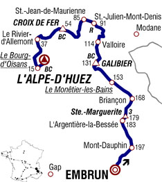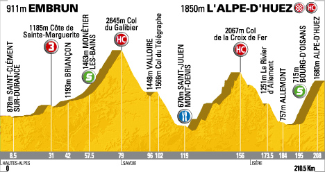 ![]() mercredi 23 juillet 2008 ![]() 11h40 (Hautes-Alpes) : N94 Embrun (km 0) - Châteauroux-les-Alpes (près de) (km 2) - Saint-Clément-sur-Durance (km 8.5) - Mont-Dauphin / Gare (km 13) - Saint-Crépin (près de) (km 17) - La Roch-de-Rame (km 22.5) - L'Argentière-la-Bessée (km 27.5) - Côte de Sainte-Marguerite (km 31-GPM3) - Queyrières (km 32.5) - Prelles (km 36) - Briançon (km 42) - D1091 Saint-Chaffrey (km 46.5) - Chantemerle - Serre-Chevalier (km 48.5) - La-Salle-les-Alpes (km 50) - Le-Monêtier-les-Bains (km 57.5-sprint) - Le-Pont-de-l'Alp (km 63) - Col du Lautaret (km 70) - D902 Col du Galibier (km 79-GPM.HC) - (Savoie) : Plan-Lachat (km 87.5) - La Rivine (km 93) - Les Verneys (km 94) - Valloire (km 96) - Choseaux (km 98) - Le Col (km 99.5) - Col du Télégraphe (km 102) - Les Seignières (km 111) - Saint-Martin d'Arc (km 113) - Saint-Michel de Maurienne (km 113.5) - D1006 Saint-Julien-Mont-Denis (km 119-ravitaillement) - D906 Saint-Jean-de-Maurienne (km 125) - Le Crêt (km 132.5) - Le Chambon (km 145.5) - Saint-Sorlin-d'Arves (km 148) - Les Choseaux (km 150.5) - Col de la Croix de Fer (km 156-GPM.HC) - (Isère) : D526 Le-Rivier-d'Allemont (km 173.5) - Articol (km 177) - Allemont (km 184) - Rochetaillée (km 188) - D1091 Les Sables (km 188.5) - La Paute (km 192) - Bourg-d'Oisans (km 195-sprint) - D211 La Ferrière (km 196.5) - La-Garde-en-Oisans (km 199) - Le Ribot (km 201.5) - Huez en Oisans (km 204.5) - Alpe d'Huez / Av. du Rif-Nel (km 210.5-GPM.HC). ![]() ![]() ![]() 151 partants Météo : très beau temps. - Velits s'échappe au km 3 en compagnie de Perez et Di Gregorio mais ils sont rejoints au km 15 par Schumacher, déjà auteur d'un long raid hier. Le peloton leur laisse malgré tout prendre 5' d'avance. Schumacher passe en tête ce col, le peloton maillo jaune est à 5'. Di Gregorio fait une faute dans la descente du Télégraphe et doit laisser filer ses 3 compagnons. Il se fera reprendre dans la 1ère partie du col de la Croix-de-Fer. - Devant, Velits reste seul en tête à partir de St-Sorlin d'Arves (km 148) soit à 62 km du but. Derrière, les CSC se contentent d'un tempo par Cancellara d'abord puis Arvesen mais c'est insuffisant pour provoquer la sélection parmi les favoris. Au col de la Croix-de-Fer (km 156), Velits passe le premier, à 1'11" Kohl qui emmène le groupe maillot jaune revenu sur le reste des échappés. - Dans la descente Pineau se lance à la poursuite de Velits avec un écart de 1' à combler. Il le rejoint avant Allemont, à 30 kilomètres de la ligne d'arrivée. Le duo aborde l'Alpe d'Huez avec 1'05" d'avance et 13,8 kilomètres de dure ascension à venir. Derrière Sastre a attaqué et déborde très vite Pineau. Menchov est décroché du groupe maillot jaune. Aux 10 kilomètres, Sastre possède 28" sur le groupe Schleck / Evans, 42" sur Menchov. Une attaque de Valverde n'est suivie que des frères Schleck dans un premier temps mais Evans revient et ça se regroupe. Sastre devient virtuel maillot jaune à 8500 mètres de la ligne avec 57" d'avance. Au panneau des 5 kilomètres l'Espagnol impressionne avec 1'50" sur le groupe maillot jaune essentiellement emmené par Goubert. A la flamme rouge Evans est à 2'27" du leader mais il va ensuite bien gérer le final. - Carlos Sastre remporte l'étape "Reine" de cette édition 2008 avec plus de deux minutes d'avance sur ses rivaux et il devient le nouveau maillot jaune... avec une avance relativement confortable. ![]() Étape : ![]() 1. Carlos Sastre (Esp) en 6h07'58" (moy: 34.324 km/h) 2. Samuel Sanchez (Esp) à 2'03" 3. Andy Schleck (Lux) 4. Alejandro Valverde (Esp) à 2'13" 5. Fränk Schleck (Lux) 6. Vladimir Efimkin (Rus) à 2'15" 7. Cadel Evans (Aus) 8. Denis Menchov (Rus) 9. Christian Vandevelde (Usa) 11. Roman Kreuziger (Tch) à 3'11" 12. Tadej Valjavec (Slo) à 3'36" 13. Stéphane Goubert (Fra) à 3'50" 14. David Moncoutié (Fra) à 4'57" 15. Nicolas Vogondy (Fra) à 5'16" 16. Sandy Casar (Fra) à 5'25" 17. Dmitriy Fofonov (Kaz) à 5'28" 18. Damiano Cunego (Ita) à 5'32" 19. Amaël Moinard (Fra) à 5'40" 20. Kim Kirchen (Lux) à 6'01" 21. Mario Aerts (Bel) 22. Kanstantsin Siutsou (Blr) à 6'08" 23. Alexandre Botcharov (Rus) à 6'59" 24. Pieter Weening (Hol) à 9'22" 25. Gorka Verdugo (Esp) 26. David Arroyo (Esp) à 10'12" 27. Laurent Lefèvre (Fra) 28. Koos Moerenhout (Hol) à 10'17" 29. Sylwester Szmyd (Pol) à 10'42" 30. Cyril Dessel (Fra) à 10'44" 31. Christopher Froome (Ken) à 11'41" 32. Laurens Ten Dam (Hol) à 12'05" 33. Jérôme Pineau (Fra) à 12'10" 34. David Lopez Garcia (Esp) à 14'21" 35. Johan Van Summeren (Bel) à 16'08" 36. Yaroslav Popovych (Ukr) 37. Pierrick Fedrigo (Fra) 38. Mikel Astarloza (Esp) 39. Peter Velits (Svq) à 17'10" 40. Erik Zabel (All) 41. Vincenzo Nibali (Ita) à 17'21" 42. Ryder Hesjedal (Can) à 18'19" 44. Volodymir Gustov (Ukr) à 19'10" 45. Marzio Bruseghin (Ita) à 20'24" 46. Gert Steegmans (Bel) 47. Fabian Cancellara (Sui) à 22'13" 48. Kurt-Asle Arvesen (Nor) 49. Martin Elmiger (Sui) à 23'08" 50. Hubert Dupont (Fra) 51. Christophe Le Mével (Fra) à 24'18" 52. Florent Brard (Fra) 53. Christian Knees (All) 54. Maxime Monfort (Bel) 55. Egoi Martinez (Esp) 56. Amets Txurruka (Esp) 57. John-Lee Augustyn (Afs) 58. Haimar Zubeldia (Esp) 59. Markus Fothen (All) 60. Thomas Lövkvist (Sue) 61. Jürgen Van de Walle (Bel) 62. Marco Velo (Ita) 63. Joost Posthuma (Hol) 64. Bram Tankink (Hol) 65. George Hincapie (Usa) 66. José Luis Arrieta (Esp) 67. Yoann Le Boulanger (Fra) 68. Giampaolo Cheula (Ita) 69. Paolo Tiralongo (Ita) à 24'37" 70. Rémy Di Gregorio (Fra) à 24'39" 71. Marco Marzano (Ita) à 27'55" 72. Jens Voigt (All) à 28'02" 73. Carlos Barredo (Esp) à 28'05" 74. Oscar Freire (Esp) 75. Leonardo Duque (Col) 76. Björn Schröder (All) 77. Alessandro Ballan (Ita) à 31'48" 78. Daniele Righi (Ita) 79. Trent Lowe (Aus) 80. Marcus Burghardt (All) à 35'45" 81. Stuart O'Grady (Aus) à 38'00" 82. Robert Hunter (Afs) 83. Filippo Pozzato (Ita) 84. Robbie Mc