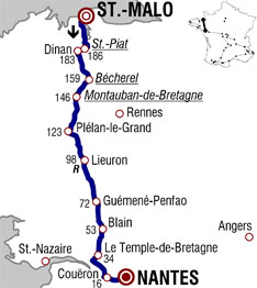 ![]() lundi 7 juillet 2008 ![]() 12h30 (Ille-et-Vilaine) : D168 Saint-Malo (km 0) - D114 La Richardais (km 1.5) - Le Minihic-sur-Rance (km 5) - (Côtes d'Armor) : D12 Langrolay-sur-Rance (km 8.5) - D12 Plouër-sur-Rance (km 12.5) - La Hisse (km 16.5) - Lyvet (km 17.5) - La Vicomté-sur-Rance (km 18.5) - La Croix-du-Frêne (km 20) - D795 Saint-Piat (km 21.5-sprint) - Lanvallay (km 24) - D2176 Dinan (km 25) - D12 Lehon (km 28) - D26 Calorguen (km 31.5) - Saint-André-des-Eaux (km 36) - Le Quiou (km 38.5) - Le Mauny (km 40.5) - (Ille-et-Vilaine) : D68 La Barre (km 47.5) - D20 Bécherel (km 48.5-sprint) - D71 Landujan (km 54.5) - Montauban-de-Bretagne (km 62-sprint) - Boisgervilly (près de) (km 65.5) - Iffendic (km 69.5) - Saint-Péran (km 79) - Plélan-le-Grand (km 85) - D38 Maxent (km 91) - D65 Le Guily (km 93) - L'Émeheuc (km 94) - Campel (km 97) - Maure-de-Bretagne (km 103) - La Réhaudière (km 107.5) - Lieuron (km 109.5-ravitaillement) - Pipriac (km 113) - D59 La Manchonnais (km 119.5) - (Loire-Atlantique) : Besle (km 128.5) - Guéméné-Penfao (km 136) - Trélan (km 145) - Blain (km 154.5) - D15 La Retentais (km 161) - Fay-de-Bretagne (km 163.5) - Le Petit-Mérimont (km 168.5) - Le Grand-Mérimont (km 170) - D965 Le Temple-de-Bretagne (km 173.5) - D17 Saint-Étienne-de-Montluc (km 184) - Couëron (km 191.5) - D107 Indre (km 199) - Saint-Herblain (km 202) - Nantes / entrée (km 203.5) - Nantes / Quai de la Fosse (km 208). ![]() ![]() ![]() 179 partants Météo : temps instable, violentes averses, vent 3/4 défavorable. Hier l'étape était Sud-Nord, elle est aujourd'hui Nord-Sud. - Dès le départ réel donné, Frischkorn attaque. Il est rapidement suivi par Feillu, Dumoulin & Borghini. Feillu est le mieux placé au C.G, à 18" du leader. Le quatuor creuse immédiatement l'écart qui se monte déjà à 4'50" au km 10. L'écart culmine au km 55 avec 12'55". Derrière, quelques équipes accélèrent l'allure: Bouygues, Crédit Agricole, Colombia, Liquigas et Caisse d'Épargne puis La Française des Jeux vient donner un coup de main aussi. Le peloton revient progressivement sur les échappés mais il est encore en retard de 9' au km 128. - L'échappée est ensuite handicapée par un fort vent 3/4 défavorable, sans compter une manifestation à 57 kilomètres de Nantes. Pourtant, au km 168, les quatre de tête comptent encore 6'25" puis 5'30" au km 178 et encore un écart décisif de 3'10" au panneau des 10 kilomètres. Dans le final de l'étape, le vent provoque plusieurs cassures dans le peloton, dont Menchov et Ricco, piégés dans un deuxième éventail qui concédera 38" à l'arrivée. - La victoire d'étape se joue entre Feillu, Dumoulin, Frischkorn & Borghini. Dumoulin place une attaque aux 1500 mètres. Borghini est décroché. Frischkorn revient sur Dumoulin avec Feillu lequel place un contre tranchant aux 800 mètres et aborde la dernière ligne droite en tête. Il est cependant débordé par l'Américain mais c'est Samuel Dumoulin qui est le plus véloce et remporte sa 1ère victoire d'étape sur un Tour de France. McEwen règle le peloton devant Zabel à 2'03" du vainqueur. Romain Feillu s'empare du maillot jaune. Demain un CLM individuel à Cholet devrait nous donner des indications sur la forme des favoris. ![]() Étape : ![]() 1. Samuel Dumoulin (Fra) en 5h05'27" (moy: 40.858 km/h) 2. William Frischkorn (Usa) 3. Romain Feillu (Fra) 4. Paolo Longo Borghini (Ita) à 14" 5. Robbie McEwen (Aus) à 2'03" 6. Erik Zabel (All) 7. Oscar Freire (Esp) 8. Thor Hushovd (Nor) 9. Robert Förster (All) 10. Mark Cavendish (Gbr) 11. Kim Kirchen (Lux) 12. Robert Hunter (Afs) 13. Jérôme Pineau (Fra) 14. Iñaki Isasi (Esp) 15. Leonardo Duque (Col) 16. Francesco Chicchi (Ita) 17. Martijn Maaskant (Hol) 18. Martin Elmiger (Sui) 19. Julian Dean (Nzl) 20. Matteo Carrara (Ita) 21. Gert Steegmans (Bel) 22. Sébastien Chavanel (Fra) 23. Sebastian Lang (All) 24. George Hincapie (Usa) 25. David Millar (Gbr) 26. Magnus Bäckstedt (Sue) 27. Marzio Bruseghin (Ita) 28. Filippo Pozzato (Ita) 29. Niki Terpstra (Hol) 30. Carlos Barredo (Esp) 31. Mikel Astarloza (Esp) 32. Ruben Perez (Esp) 34. Vladimir Efimkin (Rus) 35. Alessandro Ballan (Ita) 36. Thomas Lövkvist (Sue) 37. Samuel Sanchez (Esp) 38. Murilo Antonio Fischer (Bre) 39. Cadel Evans (Aus) 40. Maxime Monfort (Bel) 41. Yury Trofimov (Rus) 42. Andy Schleck (Lux) 43. Christian Knees (All) 44. Manuel Beltran (Esp) 45. Yaroslav Popovych (Ukr) 46. Damiano Cunego (Ita) 47. Stijn Devolder (Bel) 48. Christian Vandevelde (Usa) 50. Oscar Pereiro (Esp) 51. Tadej Valjavec (Slo) 52. Egoi Martinez (Esp) 53. John-Lee Augustyn (Afs) 54. Haimar Zubeldia (Esp) 55. Heinrich Haussler (All) 56. José Ivan Gutierrez (Esp) 57. Baden Cooke (Aus) 58. Geoffroy Lequatre (Fra) 59. Vincenzo Nibali (Ita) 60. Christophe Brandt (Bel) 61. Jürgen Van de Walle (Bel) 62. Mark Renshaw (Aus) 63. Juan José Oroz (Esp) 64. Daniele Righi (Ita) 65. Lilian Jégou (Fra) 66. Matteo Tosatto (Ita) 67. Matteo Bono (Ita) 68. Alejandro Valverde (Esp) 69. Fränk Schleck (Lux) 70. Carlos Sastre (Esp) 71. José Luis Arrieta (Esp) 72. Nicolas Portal (Fra) 73. Steven De Jongh (Hol) 74. Simon Gerrans (Aus) 75. Sébastien Rosseler (Bel) 76. Stuart O'Grady (Aus) 77. Thomas Voeckler (Fra) 78. Massimiliano Mori (Ita) 79. Marco Velo (Ita) 80. Manuel Quinziato (Ita) 81. Fabian Cancellara (Sui) 82. Martin Müller (All) 83. Kurt-Asle Arvesen (Nor) 84. Frederik Willems (Bel) 85. Ronny Scholz (All) 86. José Vicente Garcia Acosta (Esp) 87. Arnaud Coyot (Fra) 88. Bernhard Eisel (Aut) 89. Jimmy Engoulvent (Fra) 90. Arnaud Gérard (Fra) 91. Josep Jufre (Esp) à 2'41" 92. Denis Menchov (Rus) 93. Juan José Cobo (Esp) 94. Riccardo Ricco (Ita) 95. Jimmy Casper (Fra) 96. Mario Aerts (Bel) 97. Leif Hoste (Bel) 98. Alexandre Botcharov (Rus) 99. Benoît Vaugrenard (Fra) 100. Philippe Gilbert (Bel) 101. William Bonnet (Fra) 102. Sylvain Chavanel (Fra) 103. Stef Clement (Hol) 104. Nicolas Jalabert (Fra) 105. Gerald Ciolek (Al