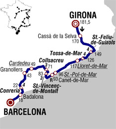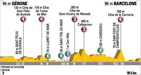 ![]() jeudi 9 juillet 2009 ![]() (ESPAGNE) - (Catalogne) : C250 Gerone (km 0) - Quart (km 2) - Llambilles (km 4.5) - Cassa de la Selva (près) (km 11.5) - Llagostera (près) (km 14) - Santa Cristina d'Aro (près) (km 20.5) - Sant Feliu de Guixols (km 27.5) - Côte de Sant Feliu de Guixols (km 32-GPM4) - Pola Giverola (près) (km 46) - Tossa de Mar (km 50.5) - Côte de Tossa de Mar (km 55-GPM4) - Lloret de Mar (km 64) - Blanes (km 65.5) - Palafolls (km 70.5) - Malgrat de Mar (km 72.5) - Santa Susanna (km 77) - Pineda de Mar (km 78) - El Poblenou (près) (km 80) - Calella (km 80.5) - Sant Pol de Mar (km 85.5) - Can Villa (km 88-ravitaillement) - Canet de Mar (km 89) - Arenys de Mar (km 91) - Sant Vicenc de Montalt (km 94.5) - Côte de Sant Vicenc de Montalt (km 98-GPM3) - Torrentbo (km 100) - Arenys de Munt (km 105.5) - Collsacreu (km 110) - Vallgorguina (km 113) - Baronia can Bosc (près) (km 122) - Vilalba Sassera (km 123) - Llinars des Valles (km 127.5) - Cardedeu (km 132.5) - Granollers (km 138) - Vilanova del Valles (km 145.5) - Montornes del Valles (km 147.5) - Martorelles (km 152.5) - San Fost de Campsentelles (km 152.5) - Côte de la Conreria (km 159) - Badalona (km 163) - entrée Barcelone (km 168.5) - Barcelone / Avinguda de l'Estadi (km 181.5). ![]() ![]() ![]() Météo : beau temps. 177 partants. - Au km 32, Botcharov passe en tête la côte de Sant Feliu. Peu après, km 40, Millar et Chavanel sortent du peloton, bientôt rejoints par Augé lequel passe en tête la côte de Tosca de Mar (km 56). Le sprint du km 64 (Lloret de Mar) est réglé par Chavanel. Txurruka intègre le trio de tête peu avant le sommet de Collsacreu (km 110), soit 4 hommes devant et le peloton accuse un retard de 1'50". - Au km 150, Haussler glisse dans un rond-point et entraîne dans sa chute Rogers, Farrar et Zabriskie. Farrar semble le plus touché (au poignet). Au km 153, Millar attaque et seul Txurruka réagit, à distance, tandis que Chavanel et Augé renoncent et sont absorbés par le peloton. Au km 166, Auriol, après un très beau numéro, revient sur Txurruka. Ils sont à 45" de Millar tandis que le peloton est pointé à 1'05" du Britannique. - Millar passe la banderole des 10 kilomètres (km 171) toujours seul. par contre Auriol et Txurruka ont été repris par le peloton. Au km 176, dans les faubourgs de Barcelone, Boonen se retrouve à terre et entraîne Pauriol et d'autres dans sa chute. Le Belge repart difficilement mais termine l'étape. C'est au km 180 que Millar termine son aventure, à 1500 mètres du but. Un sprint massif est maintenant inévitable mais alors que beaucoup pariaient sur une victoire de Freire, Hushovd s'impose en force devant Freire et Rojas. Fabian Cancellara conserve le maillot jaune. ![]() Étape : ![]() 1. Thor Hushovd (Nor) en 4h21'33" (moy : 41.636 km/h) 2. Oscar Freire (Esp) 3. José Joaquin Rojas (Esp) 4. Gerald Ciolek (All) 5. 6. Filippo Pozzato (Ita) 7. Alessandro Ballan (Ita) 8. Rinaldo Nocentini (Ita) 9. Cadel Evans (Aus) 10. Fabian Cancellara (Sui) 11. Andreas Klöden (All) 12. Nicolas Roche (Irl) 13. Andy Schleck (Lux) 14. Vincenzo Nibali (Ita) 15. Sébastien Rosseler (Bel) 16. Mark Cavendish (Gbr) 17. Jérôme Pineau (Fra) 18. George Hincapie (Usa) 19. Roman Kreuziger (Tch) 20. Levi Leipheimer (Usa) 21. Linus Gerdemann (All) 22. Greg Van Avermaet (Bel) 23. Alberto Contador (Esp) 24. Bradley Wiggins (Gbr) 25. Fränk Schleck (Lux) 26. Alexandre Botcharov (Rus) 28. Luis Leon Sanchez (Esp) 29. Tony Martin (All) 30. Carlos Sastre (Esp) 31. Christophe Le Mével (Fra) 32. Oscar Pereiro (Esp) 33. Julian Dean (Nzl) 34. Martijn Maaskant (Hol) 35. Maxime Monfort (Bel) 36. Christian Vandevelde (Usa) 37. Jens Voigt (All) 38. Gustav-Erik Larsson (Sue) 39. Christian Knees (All) 40. Kim Kirchen (Lux) 41. Vladimir Efimkin (Rus) 42. Rigoberto Uran (Col) 43. Marzio Bruseghin (Ita) 44. Carlos Barredo (Esp) à 9" 45. Peter Velits (Svq) 46. Romain Feillu (Fra) 47. Yaroslav Popovych (Ukr) 48. Brett Lancaster (Aus) à 15" 49. Alessandro Vanotti (Ita) à 39" 50. Koen De Kort (Hol) 51. Stijn Vandenbergh (Bel) à 46" 52. Arnaud Coyot (Fra) 53. Sebastian Lang (All) à 50" 54. Aliaksandr Kuschynski (Blr) 55. Kurt-Asle Arvesen (Nor) 56. Jérémy Roy (Fra) 57. Bert Grabsch (All) 58. Sandy Casar (Fra) 59. Stéphane Goubert (Fra) 60. Jürgen Van den Broeck (Bel) 61. José Luis Arrieta (Esp) 62. José Ivan Gutierrez (Esp) 63. Jussi Veikkanen (Fin) 64. Brice Feillu (Fra) 65. Haimar Zubeldia (Esp) 66. Markus Fothen (All) 67. Juan Antonio Flecha (Esp) 68. Sébastien Minard (Fra) 69. Thierry Hupond (Fra) à 58" 70. Nikolai Trussov (Rus) 71. Luis Pasamontes (Esp) 72. Geoffroy Lequatre (Fra) 73. Samuel Dumoulin (Fra) 74. Marco Bandiera (Ita) 75. Denis Menchov (Rus) à 1'02" 76. 77. Laurent Lefèvre (Fra) 78. David Arroyo (Esp) 79. Christophe Moreau (Fra) 80. Nicki Sørensen (Dan) 81. Jérôme Coppel (Fra) 82. Rémi Pauriol (Fra) 83. Vladimir Karpets (Rus) 84. Amaël Moinard (Fra) 85. Sylvain Calzati (Fra) 86. David Moncoutié (Fra) 87. Ryder Hesjedal (Can) 88. Lloyd Mondory (Fra) 89. Johannes Fröhlinger (All) 90. Frederik Willems (Bel) 91. Steven De Jongh (Hol) 92. Peter Wrolich (Aut) à 1'18" 93. Bingen Fernandez (Esp) 94. Stuart O'Grady (Aus) 95. Leonardo Duque (Col) 96. David Millar (Gbr) à 1'21" 97. Igor Anton (Esp) à 1'23" 98. Fabian Wegmann (All) 99. Juan José Oroz (Esp) à 1'29" 100. Pierre Rolland (Fra) à 1'32" 101. David Le Lay (Fra) à 1'37" 102. Simon Geschke (All) 103. Daniele Righi (Ita) 104. David Zabriskie (Usa) 105. Anthony Geslin (Fra) à 1'55" 106. Nicolas Vogondy (Fra) 107. Egoi Martinez (Esp) 108. Gorka Verdugo (Esp) 109. Hayden Roulston (Nzl) 110. Juan Manuel Garate (Esp) 111. Chris-Anker Sørensen (Dan) 112. Amets Txurruka (Esp) 113. Sylvain Chavanel (Fra) 114. Alan Perez (Esp) 115. Pierrick Fedrigo (Fra) 116. Maxime Bouet (Fra) 117. Eduardo Gonzalo (Esp) 118. Mickaël Delage (Fra) 119. Ruben Perez (Esp) 120. Volodymir Gustov (Ukr) 121. Stijn Devolder (Bel) 122. Joh