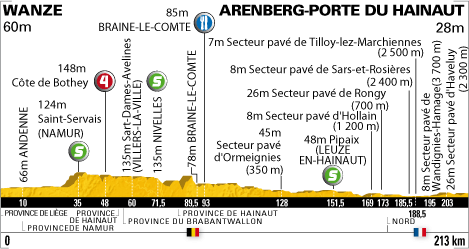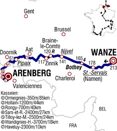 ![]() mardi 6 juillet 2010 ![]() (BELGIQUE) - (Liège) : Wanze N90 (km 0) - Ben (km 5) - Gives (km 7.5) - (Namur) : Andenne (km 10) - Sclayn (km 16.5) - Thon (km 20) - Maizeret (km 20.5) - Erpent (km 26.5) - Jambes (km 27.5) - Namur (km 30) - Saint-Servais N4 (km 33) - Saint-Servais (km 35-sprint) - Belgrade N93 (km 36) - Temploux (km 39) - Mazy (km 44) - Côte de Bothey (km 48-GPM4) - Bothey (km 48.5) - Tongrinne (km 50.5) - Sombreffe (km 52.5) - (Hainaut) : Brye (km 54) - (Brabant Wallon) : Marbais (km 58) - Sart-Dames-Avelines (km 60) - Houtain-Le-Val (km 66) - Nivelles (km 71.5-sprint) - (Hainaut) : Ronquières N533 (km 82.5) - Henripont (km 86) - Braine-Le-Comte (km 89.5) - Braine-le-Comte N6 (km 93-ravitaillement) - Soignies (km 95.5) - Thoricourt (km 107.5) - Lombise (km 109) - Cambron-Saint-Vincent (km 110.5) - Lens (km 115.5) - Bauffe N56 (km 117.5) - Brugelette (km 120) - Attre (km 121.5) - Chièvres N525 (km 123) - Tongre-Saint-Martin (km 125.5) - Secteur Pavé d'Ormeignies (350 m) (km 128) - Ormeignies (km 128.5) - Moulbaix (km 132) - Ligne (km 134.5) - Chapelle-à-Watines N7 (km 137) - Leuze-en-Hainaut (km 140.5) - Pipaix (km 144.5) - Barry (km 148.5) - Pipaix N50 (km 151.5-sprint) - Baugnies (km 152) - Wasmes-Audemez (km 155) - Maubray N 503 (km 160.5) - Péronnes (km 162.5) - Hollain (km 167) - Secteur pavé d'Hollain (1200 m) (km 169) - Lesdain (km 172.5) - Secteur pavé de Rongy (700 m) (km 173) - Rongy (km 173.5) - (FRANCE) - (Nord) : Rumegies D327 (km 176) - Vieux-Condé (km 179.5) - Landas D126A (km 181) - Sars-et-Rosieres D953 (km 185) - Secteur pavé de Sars-et-Rosières (2400 m) D158B (km 185.5) - Tilloy-lez-Marchiennes (km 188) - Brillon D35 (km 188.5) - Secteur pavé de Tilloy-lez-Marchiennes (2500 m) D81 (km 188.5) - Warlaing (km 190.5) - Wandignies-Hamage (D 81-Rc) (km 193.5) - Secteur pavé de Wandignies-Hamage (3700 m) (km 195) - Hornaing (km 198.5) - Helesmes D13 (km 201.5) - Secteur pavé d'Haveluy (2300 m) (km 203) - Haveluy (km 206) - Wallers D40 (km 207.5) - Arenberg/Porte du Hainaut D313 (km 213). ![]() ![]() ![]() "Youtube" (arrivée étape 3 vers 1:21:00) ![]() Étape : ![]() 1. Thor Hushovd (Nor) en 4h49'38" (moy : 44.125 km/h) 2. Geraint Thomas (Gbr) 3. Cadel Evans (Aus) 4. Ryder Hesjedal (Can) 5. Andy Schleck (Lux) 6. Fabian Cancellara (Sui) 7. Johan Vansummeren (Bel) à 53" 8. Bradley Wiggins (Gbr) 9. Jürgen Van den Broeck (Bel) 10. Alexandre Vinokourov (Kaz) 11. Denis Menchov (Rus) 12. Nicolas Roche (Irl) 14. Robbie McEwen (Aus) à 1'46" 15. Mario Aerts (Bel) 16. Arkaitz Duran (Esp) 17. José Joaquin Rojas (Esp) 18. Luis Leon Sanchez (Esp) 19. Roman Kreuziger (Tch) 20. Thomas Lövkvist (Sue) 21. David Millar (Gbr) 22. Gerald Ciolek (All) à 2'08" 23. Sébastien Minard (Fra) 24. Serge Pauwels (Bel) 25. Mark Cavendish (Gbr) 26. Stuart O'Grady (Aus) 27. Martijn Maaskant (Hol) 28. Alessandro Petacchi (Ita) 29. Christophe Le Mével (Fra) 30. Jakob Fuglsang (Dan) 31. Christophe Riblon (Fra) 33. Lloyd Mondory (Fra) 34. Sébastien Turgot (Fra) 35. Juan Manuel Garate (Esp) 36. Bram Tankink (Hol) 37. Samuel Sanchez (Esp) 38. John Gadret (Fra) 39. Jürgen Roelandts (Bel) 40. Danilo Hondo (All) à 2'13" 41. Robert Hunter (Afs) à 2'25" 42. Christopher Horner (Usa) 43. Ivan Basso (Ita) 44. Janez Brajkovic (Slo) 45. Sandy Casar (Fra) 46. Michael Rogers (Aus) 47. Robert Gesink (Hol) 48. Joaquin Rodriguez (Esp) 49. Eduard Vorganov (Rus) 50. Grischa Niermann (All) 51. Maxime Monfort (Bel) 52. Volodymir Gustov (Ukr) 53. Iñaki Isasi (Esp) 54. Carlos Sastre (Esp) 55. Egoi Martinez (Esp) 56. Sebastian Lang (All) 57. Marcus Burghardt (All) 58. Michael Barry (Can) 59. Daniel Moreno (Esp) 60. George Hincapie (Usa) 61. Maxim Iglinskiy (Kaz) 62. Mathieu Ladagnous (Fra) 63. Christian Knees (All) 64. Levi Leipheimer (Usa) 65. Alessandro Ballan (Ita) 66. Mauro Da Dalto (Ita) 67. Cyril Gautier (Fra) 68. Kristjan Koren (Slo) 69. Christophe Kern (Fra) 70. Rafael Valls (Esp) 71. Alexandr Kolobnev (Rus) 72. Yukiya Arashiro (Jap) 73. Thomas Voeckler (Fra) 74. Benjamin Noval (Esp) 75. Karsten Kroon (Hol) 76. José Ivan Gutierrez (Esp) 77. Pierre Rolland (Fra) 78. Andreas Klöden (All) 79. Benoît Vaugrenard (Fra) 80. Andriy Grivko (Ukr) 81. Martin Elmiger (Sui) 82. Vladimir Karpets (Rus) 83. Rui Alberto Costa (Por) 84. Rémi Pauriol (Fra) 85. Tony Martin (All) 86. Mirco Lorenzetto (Ita) 87. Stéphane Augé (Fra) 88. Serguei Ivanov (Rus) 89. Maarten Tjallingii (Hol) 90. Yaroslav Popovych (Ukr) 91. Steven Cummings (Gbr) à 2'37" 92. Juan Antonio Flecha (Esp) à 2'43" 93. Jérôme Pineau (Fra) à 3'58" 94. Damien Monier (Fra) 95. Sylvain Chavanel (Fra) 96. Anthony Geslin (Fra) 97. Daniel Oss (Ita) 98. Linus Gerdemann (All) 99. Carlos Barredo (Esp) 100. Aliaksandr Kuschynski (Blr) 101. Alexandr Pliuschin (Mol) 102. Lars Boom (Hol) 103. Imanol Erviti (Esp) 104. Edvald Boasson Hagen (Nor) 105. Stijn Vandenbergh (Bel) à 5'48" 106. Christophe Moreau (Fra) à 6'28" 107. Koos Moerenhout (Hol) 108. Luke Roberts (Aus) 109. Brian Vandborg (Dan) 110. Pierrick Fedrigo (Fra) 111. Vasil Kiryienka (Blr) 112. Kanstantsin Siutsou (Blr) 113. Thomas Rohregger (Aut) 114. Matti Breschel (Dan) 115. Kevin De Weert (Bel) 116. Ruben Perez (Esp) 117. José Alberto Benitez (Esp) 118. Fabian Wegmann (All) 119. Rémy Di Gregorio (Fra) 120. Markus Eibegger (Aut) 121. Maarten Wynants (Bel) 122. Aitor Perez (Esp) 123. Iban Mayoz (Esp) 124. Wesley Sulzberger (Aus) 125. Mark Renshaw (Aus) 126. Bert Grabsch (All) 127. Sergio Miguel Paulinho (Por) 128. Daniel Lloyd (Gbr) 129. Andreas Klier (All) 130. Ruben Plaza (Esp) 131. Julien El Farès (Fra) 132. Ignatas Konovalovas (Lit) 133. Johannes Fröhlinger (All) 134.Tyler Farrar (Usa) 135. Jens Voigt (All) 136. Grégory Rast (Sui) 137. Julian Dean (Nzl) 138. Dmitriy Muravyev (Kaz) 139. Nicolas Vogondy (Fra) 140. Roger Kluge (All) à 7'03" 141. Anthony Charteau (Fra) à 9'41" 142. Francis De Greef (Bel) à 9'49" 143. Jürgen Van de Walle (Bel) 144. Manuel Quinziato (Ita) 1