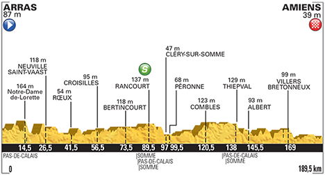 ![]() mercredi 8 juillet 2015 ![]() 13h00 (Pas-de-Calais) : Arras - Sainte-Catherine - Anzin-St-Aubin - D341 Arras (km 0) - Mont-Saint-Éloi (km 3.5) - D58 Villers-au-Bois (km 7.5) - Carency (km 10) - Ablain-Saint-Nazaire (km 11.5) - D58 E3 Nécropole nationale de N.D-de-Lorette (km 14.5) - Souchez (km 15) - Angres (km 18) - D51 Givenchy-en-Gohelle (km 20.5) - D55 Mémorial canadien de Vimy (km 24.5) - Neuville-Saint-Vaast (km 26.5) - D49 Thélus (km 29.5) - Bailleul-Sire-Berthoult (km 34) - D33 Gavrelle (km 37.5) - D42 Rœux (km 41.5) - Monchy-le-Preux (km 45) - Wancourt (km 48.5) - Héninel (km 50) - Saint-Martin-sur-Cojeul (km 51.5) - Hénin-sur-Cojeul (km 52.5) - D5 Croisilles (km 56.5) - Écoust-Saint-Mein (km 60) - Noreuil (km 62.5) - Lagnicourt-Marcel (km 64.5) - D18 Morchies (km 67) - Lebucquière (km 70.5) - Vélu (km 71.5) - Bertincourt (km 73.5) - Ytres (km 77) - (Somme) : D43 Étricourt-Manancourt (près de) (km 83) - D172 Mesnil-en-Arrouaise (km 83.5) - Sailly-Saillisel (km 86.5) - D1017 Rancourt (km 90.5) - Bouchavesnes-Bergen (km 91.5) - D938 Cléry-sur-Somme (km 97) - Péronne / Historial de la Grande Guerre (km 99.5) - D1 Biaches (km 104) - Herbécourt (km 110) - D146 Feuillères (km 113) - Maurepas (km 118) - Combles (km 120.5) - D20E Ginchy (km 124.5) - Longueval (km 126) - (Pas-De-Calais) : D6 Martinpuich (km 131) - (Somme) : D929 Pozières (km 134.5) - Thiepval / Mémorial (km 138) - D151 Authuille (km 140) - D20 La Boisselle (km 144) - D929 Albert (km 145.5) - D42 Méaulte (km 149.5) - Morlancourt (km 153.5) - Sailly-Laurette (km 159) - Lamotte-Warfusée (km 164) - D1029 Villers-Bretonneux (km 169) - Fouilloy (km 172) - D1 Daours (km 176.5) - Rivery (km 185.5) - Amiens / Mail Albert 1er (km 189.5). ![]() ![]() ![]() Vidéo DailyMotion ![]() Étape : ![]() 1. André Greipel (All) en 4h39'00" (moy: 40.752 km/h) 2. Peter Sagan (Svq) 3. Mark Cavendish (Gbr) 4. Alexander Kristoff (Nor) 5. Edvald Boasson Hagen (Nor) 6. John Degenkolb (All) 7. Arnaud Démare (Fra) 8. Bryan Coquard (Fra) 9. Davide Cimolai (Ita) 10. Greg Van Avermaet (Bel) 11. Geoffrey Soupe (Fra) 12. Zakkari Dempster (Aus) 13. Reinardt Janse Van Rensburg (Afs) 14. Jarlinson Pantano (Col) 15. Sep Vanmarcke (Bel) 16. Jan Bakelants (Bel) 17. Tanel Kangert (Est) 18. Matthias Brändle (Aut) 19. Vincenzo Nibali (Ita) 20. Michele Scarponi (Ita) 21. Sylvain Chavanel (Fra) 22. Tony Martin (All) 23. Paul Voss (All) 24. Geraint Thomas (Gbr) 25. Warren Barguil (Fra) 26. Kristjan Koren (Slo) 27. Alejandro Valverde (Esp) 28. Christopher Froome (Gbr) 29. Robert Gesink (Hol) 30. Michael Schär (Sui) 31. Samuel Sanchez (Esp) 32. Tejay Van Garderen (Usa) 33. Eduardo Sepulveda (Arg) 34. Nairo Alexander Quintana (Col) 35. Tony Gallopin (Fra) 36. Rui Alberto Costa (Por) 37. Andrew Talansky (Usa) 38. Mark Renshaw (Aus) 39. Romain Bardet (Fra) 40. Alberto Contador (Esp) 41. Mikaël Chérel (Fra) 42. Jean-Christophe Péraud (Fra) 43. Joaquin Rodriguez (Esp) 44. Roman Kreuziger (Tch) 45. Dominik Nerz (All) 46. Daniel Teklehaimanot (Ery) 47. Markel Irizar (Esp) 48. Rigoberto Uran (Col) 49. Jakob Fuglsang (Dan) 50. Alberto Losada (Esp) 51. Mathias Frank (Sui) 52. Bauke Mollema (Hol) 53. Jacques Janse Van Rensburg (Afs) 54. Christophe Laporte (Fra) 55. Grégory Rast (Sui) 56. Zdenek Stybar (Tch) 57. Thibaut Pinot (Fra) 58. Cyril Gautier (Fra) 59. Alexis Vuillermoz (Fra) 60. Daniel Martin (Irl) 61. Benoît Vaugrenard (Fra) 62. Jos Van Emden (Hol) 63. Lars Ytting Bak (Dan) 64. Pierre Rolland (Fra) 65. Matthieu Ladagnous (Fra) 66. Andriy Grivko (Ukr) à 10" 67. Koen De Kort (Hol) à 12" 68. Bram Tankink (Hol) 69. Jonathan Castroviejo (Esp) 70. Laurent Didier (Lux) 71. Gorka Izagirre (Esp) 72. Damien Gaudin (Fra) 73. Yohann Gène (Fra) 74. Christophe Riblon (Fra) 75. Michael Valgren Andersen (Dan) 76. Tim Wellens (Bel) 77. Adam Yates (Gbr) 78. Romain Sicard (Fra) 79. Tom Leezer (Hol) 80. Nathan Haas (Aus) à 17" 81. Marcel Sieberg (All) à 18" 82. Rein Taaramäe (Est) à 20" 83. Roy Curvers (Hol) à 23" 84. Daniel Oss (Ita) 85. Florian Sénéchal (Fra) 86. Adriano Malori (Ita) à 43" 87. Daniele Bennati (Ita) 88. Steve Morabito (Sui) à 0" 89. Ian Stannard (Gbr) à 43" 90. Michal Golas (Pol) 91. Lieuwe Westra (Hol) 92. Ramon Sinkeldam (Hol) à 56" 93. Simon Yates (Gbr) 94. Ramunas Navardauskas (Lit) à 1'05" 95. Damiano Caruso (Ita) à 1'18" 96. Nicolas Roche (Irl) 97. Michael Rogers (Aus) 98. Danilo Wyss (Sui) 99. Tyler Farrar (Usa) à 1'24" 100. Manuel Quinziato (Ita) 101. Dylan Van Baarle (Hol) à 2'17" 102. Luke Rowe (Gbr) à 2'28" 103. Simon Geschke (All) 104. Albert Timmer (Hol) 105. Michal Kwiatkowski (Pol) à 2'46" 106. Julien Vermote (Bel) 107. Rohan Dennis (Aus) à 3'07" 108. Matteo Trentin (Ita) à 4'07" 109. Armindo Fonseca (Fra) à 8'29" 110. Filippo Pozzato (Ita) à 10'14" 111. Sébastien Chavanel (Fra) à 10'15" 112. Leopold König (Tch) à 10'20" 113. Steven Kruijswijk (Hol) à 12'23" 114. Marco Haller (Aut) 115. Georg Preidler (Aut) 116. Wouter Poels (Hol) 117. Tiago José Machado (Por) 118. Ivan Basso (Ita) 119. Jacopo Guarnieri (Ita) 120. Luca Paolini (Ita) 121. Matteo Tosatto (Ita) 122. Brice Feillu (Fra) à 14'15" 123. Thomas De Gendt (Bel) 124. Anthony Delaplace (Fra) 125. Stef Clement (Hol) 126. Pierre-Luc Périchon (Fra) 127. Nelson Felipe Oliveira (Por) 128. Serge Pauwels (Bel) 129. Wilco Kelderman (Hol) 130. Ben Gastauer (Lux) 131. Alexandre Geniez (Fra) 132. Stijn Devolder (Bel) 133. Jens Debusschere (Bel) 134. Haimar Zubeldia (Esp) 135. Gregory Henderson (Nzl) 136. Dmitriy Gruzdev (Kaz) 137. Luis Angel Mate (Esp) 138. Adam Hansen (Aus) 139. Richie Porte (Aus) 140. Julian David Arredondo (Col) 141. Peter Kennaugh (Gbr) 142. Paul Martens (All) 143. Bob Jungels (Lux) 144. Perrig Quemeneur (Fra) 145. Jan Barta (Tch) 146. Bryan Nauleau (Fra) 147. Thomas Voeckler (Fra) 148. Pierrick Fedrigo (Fra) 149. Emanuel Buchmann (All) 150. Sam Bennett (Irl) 151. Imanol Erviti (Esp) 152. Giampaolo Caruso (Ita) 153. Marcel Wyss (