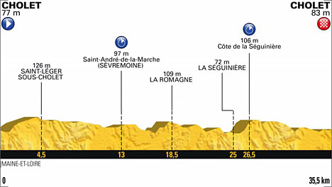 ![]() lundi 9 juillet 2018 ![]() 15h10 (Maine-et-Loire) : Cholet (km 0) - Saint-Léger-sous-Cholet (km 4.5) - D63 Carrefour des Garennes (km 7.5) - L'Établère (km 8.5) - D158 Saint-André-de-la-Marche (km 12.5) - Saint-André-de-la-Marche (km 13) - D91 La Romagne (km 18.5) - D753 La Malmongère (km 23) - La Séguinière (km 25) - Côte de la Séguinière (km 26.5) - D158 Cholet/Av. Anatole Manceau (km 35.5). ![]() ![]() ![]() Départs - 1ère équipe : SKY à 15h10, dernière : BORA - HANSGROWE à 16h55. Le temps est pris sur le 4ème de chaque équipe. Au classement général individuel, on retient le temps du 4ème coureur pour les coureurs arrivant avant ou avec lui et le temps réel pour les coureurs attardés. vidéo DailyMotion ![]() Étape : ![]() 1. BMC RACING TEAM en 38'46" 2. TEAM SKY à 4" 3. QUICK-STEP FLOORS à 7" 4. MITCHELTON-SCOTT à 9" 5. TEAM SUNWEB à 11" 6. EF EDUCATION FIRST-DRAPAC P/B CANNONDALE à 35" 7. BORA-HANSGROHE à 50" 8. ASTANA PRO TEAM à 51" 9. KATUSHA-ALPECIN à 52" 10. MOVISTAR TEAM à 53" 11. BAHRAIN-MERIDA à 1'06" 12. AG2R LA MONDIALE à 1'15" 13. LOTTONL-JUMBO m.t 14. TREK-SEGAFREDO à 1'16" 15. UAE TEAM EMIRATES à 1'38" 16. GROUPAMA-FDJ à 1'42" 17. FORTUNEO-SAMSIC à 1'46" 18. DIRECT ENERGIE à 1'51" 19. LOTTO SOUDAL à 1'52" 20. DIMENSION DATA m.t 21. WANTY-GROUPE GOBERT à 2'24" 22. COFIDIS, SOLUTIONS CREDITS à 3'23" Classement général : ![]() 1. Greg Van Avermaet (Bel) en 9h08'55" 2. Tejay van Garderen (Usa) m.t 3. Geraint Thomas (Gbr) à 3" 4. Philippe Gilbert (Bel) à 5" 5. Bob Jungels (Lux) à 7" 6. Julian Alaphilippe (Fra) m.t 7. Tom Dumoulin (Hol) à 11" 8. Søren Kragh Andersen (Dan) 9. Michael Matthews (Aus) t.m.t 10. Rigoberto Uran (Col) à 35" 11. Rafal Majka (Pol) à 50" 12. Daniel Oss (Ita) m.t 13. Jakob Fuglsang (Dan) à 51" 14. Richie Porte (Aus) m.t 15. Ilnur Zakarin (Rus) à 52" 16. Alejandro Valverde (Esp) à 53" 17. Mikel Landa (Esp) m.t 18. Chris Froome (Gbr) à 55" 19. Taylor Phinney (Usa) à 56" 20. Adam Yates (Gbr) à 1'00" 21. Daryl Impey (Afs) m.t 22. Vincenzo Nibali (Ita) à 1'06" 23. Gorka Izagirre (Esp) 24. Michael Valgren (Dan) t.m.t 25. Romain Bardet (Fra) à 1'15" 26. Steven Kruijswijk (Hol) 27. Primoz Roglic (Slo) t.m.t 28. John Degenkolb (All) à 1'16" 29. Jasper Stuyven (Bel) 30. Bauke Mollema (Hol) t.m.t 31. Egan Bernal (Col) à 1'19" 32. Pierre Rolland (Fra) à 1'26" 33. Mikel Nieve (Esp) m.t 34. Oliver Naesen (Bel) à 1'31" 35. Maciej Bodnar (Pol) à 1'32" 36. Magnus Cort Nielsen (Dan) à 1'33" 37. Simon Geschke (All) m.t 38. Alexander Kristoff (Nor) à 1'38" 39. Daniel Martin (Irl) m.t 40. Chad Haga (Usa) à 1'41" 41. Rudy Molard (Fra) à 1'42" 42. Tanel Kangert (Est) 43. Ramon Sinkeldam (Hol) t.m.t 44. Warren Barguil (Fra) à 1'46" 45. Laurent Pichon (Fra) 46. Yves Lampaert (Bel) t.m.t 47. Sylvain Chavanel (Fra) à 1'48" 48. Nikias Arndt (All) à 1'49" 49. Lilian Calmejane (Fra) à 1'51" 50. Thomas Boudat (Fra) m.t 51. Mark Cavendish (Gbr) à 1'52" 52. Edvald Boasson Hagen (Nor) 53. Tiesj Benoot (Bel) t.m.t 54. Reinardt Janse Van Rensburg (Afs) 55. Domenico Pozzovivo (Ita) à 1'57" 56. Ion Izagirre (Esp) m.t 57. Romain Hardy (Fra) à 2'03" 58. Antwan Tolhoek (Hol) à 2'06" 59. Nairo Quintana (Col) à 2'08" 60. Koen de Kort (Hol) à 2'14" 61. Mathias Frank (Sui) à 2'19" 62. Marco Marcato (Ita) à 2'20" 63. Gregor Mühlberger (Aut) m.t 64. Timothy Dupont (Bel) à 2'24" 65. Dion Smith (Nzl) m.t 66. Michal Kwiatkowski (Pol) à 2'28" 67. Kristijan Durasek (Cro) à 2'29" 68. Darwin Atapuma (Col) m.t 69. Edward Theuns (Bel) à 2'30" 70. Arthur Vichot (Fra) à 2'33" 71. Paul Martens (All) m.t 72. Julien Vermote (Bel) à 2'34" 73. Amund Grøndahl Jansen (Nor) à 2'35" 74. Maxime Bouet (Fra) à 2'37" 75. Stefan Küng (Sui) à 2'50" 76. Sep Vanmarcke (Bel) à 2'54" 77. Daniel Martinez (Col) m.t 78. Mark Renshaw (Aus) à 2'56" 79. Serge Pauwels (Bel) m.t 80. Peter Sagan (Slq) à 3'00" 81. Damiano Caruso (Ita) à 3'02" 82. Romain Sicard (Fra) à 3'03" 83. Axel Domont (Fra) à 3'07" 84. Jack Bauer (Nzl) à 3'11" 85. Elie Gesbert (Fra) à 3'13" 86. Marco Minnaard (Hol) à 3'15" 87. Guillaume Martin (Fra) m.t 88. Julien Simon (Fra) à 3'23" 89. Pierre Latour (Fra) à 3'26" 90. Alexis Vuillermoz (Fra) à 3'31" 91. Tom Scully (Nzl) à 3'34" 92. Andrea Pasqualon (Ita) à 3'36" 93. Thomas Degand (Bel) m.t 94. Amael Moinard (Fra) à 3'49" 95. Sonny Colbrelli (Ita) à 3'57" 96. Marcus Burghardt (All) à 3'58" 97. Omar Fraile (Esp) m.t 98. Gianni Moscon (Ita) à 4'07" 99. Dylan Groenewegen (Hol) à 4'10" 100. Kristijan Koren (Slo) à 4'12" 101. Rick Zabel (All) à 4'13" 102. Damien Gaudin (Fra) à 4'15" 103. Tom-Jelte Slagter (Hol) à 4'20" 104. Jens Keukeleire (Bel) à 4'27" 105. Robert Kiserlovski (Cro) à 4'30" 106. Andrey Amador (CRc) à 4'33" 107. Heinrich Haussler (Aus) à 4'34" 108. Timo Roosen (Hol) à 4'40" 109. Simon Gerrans (Aus) à 4'41" 110. Fernando Gaviria (Col) à 4'44" 111. Florian Vachon (Fra) à 4'49" 112. Guillaume Van Keirsbulck (Bel) à 4'54" 113. Maximiliano Richeze (Arg) 114. Nils Politt (All) 115. Jasper De Buyst (Bel) t.m.t 116. Julien Bernard (Fra) à 4'59" 117. André Greipel (All) à 5'02" 118. Marcel Sieberg (All) m.t 119. Tomasz Marczynski (Pol) à 5'04" 120. Pavel Kochetkov (Rus) à 5'06" 121. Patrick Bevin (Nzl) à 5'07" 122. Jerome Cousin (Fra) à 5'17" 123. Imanol Erviti (Esp) à 5'28" 124. Tony Gallopin (Fra) à 5'29" 125. Dmitriy Gruzdev (Kaz) à 5'34" 126. Rein Taaramäe (Est) à 5'38" 127. Marc Soler (Esp) à 5'42" 128. Toms Skujins (Let) à 5'53" 129. José Joaquin Rojas (Esp) à 5'59" 130. Jacopo Guarnieri (Ita) à 6'04" 131. Pawel Poljanski (Pol) m.t 132. Niki Terpstra (Hol) à 6'09" 133. Simon Clarke (Aus) à 6'12" 134. Michael Gogl (Aut) m.t 135. Nicolas Edet (Fra) à 6'39" 136. David Gaudu (Fra) à 6'47" 137. Tony Martin (All) à 6'54" 138. Michael Schär (Sui) à 6'57" 139. Laurens ten Dam (Hol) à 7'15" 140. Thomas De Gendt (Bel) à 7'25" 141. Lukas Pöstlberger (Aut) à 7'28" 