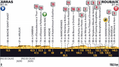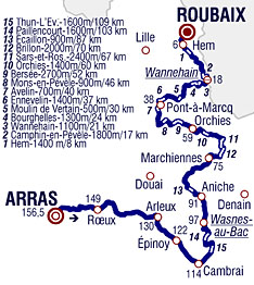![]() dimanche 15 juillet 2018 ![]() 12h35 (Pas-de-Calais) - D258 Arras (km 0) - Feuchy (km 1.5) - D37 Athies (km 2) - D42 Fampoux (km 4.5) - Rœux (km 7) - D46 Plouvain (km 9.5) - D42 Biache-Saint-Vaast (km 10.5) - D43 Hamblain-les-Prés (km 14) - Sailly-en-Ostrevent (km 17.5) - Tortequesne (km 20.5) - (Nord) : D47 Hamel (km 23.5) - Arleux (km 26) - (Pas-de-Calais) : D65 Palluel (km 28) - D21 Oisy-Le-Verger (km 30.5) - Épinoy (km 34.5) - Nord (59) - D643 Petit Sancourt (km 38) - Neuville-Saint-Rémy (km 40.5) - D630 Cambrai (km 42.5) - Escaudœuvres (km 45) - Secteur pavé d'Escaudœuvres à Thun (km 47.5) - Thun-l'Évêque (km 49) - D61 Eswars (km 51.5) - Secteur pavé d'Eswars à Paillencourt (km 53.5) - Paillencourt (km 55) - D49 Pont-Rade (km 58) - Wasnes-au-Bac (km 59-sprint) - Marquette-en-Ostrevant (km 61) - Hameau du Corbeau (km 63.5) - Émerchicourt (km 63.5) - Aniche (km 65) - D47 Auberchicourt (km 67) - Secteur pavé d'Auberchicourt à Écaillon (km 69) - Écaillon (km 70) - Masny (km 70.5) - D8 Montigny-en-Ostrevent (km 73) - D25 Pecquencourt (km 73.5) - Vred (près de) (km 77.5) - D143 Rieulay (près de) (km 78.5) - Marchiennes (km 81) - D99 Warlaing (km 86) - Secteur pavé de Warlaing à Brillon (km 86.5) - Tilloy-lez-Marchiennes (près de) (km 87.5) - Brillon (km 88.5) - D35 Tilloy-lez-Marchiennes (km 89) - Secteur pavé de Tilloy à Sars-et-Rosières (km 89.5) - Sars-et-Rosières (km 91.5) - D953 Beuvry-la-Forêt (km 94) - Secteur pavé de Beuvry à Orchies (km 96) - Orchies (km 97.5) - D549 Auchy-lez-Orchies (km 102.5) - Secteur pavé d'Auchy à Bersée (km 104.5) - Cappelle-en-Pévèle (près de) (km 105.5) - Bersée (km 107.5) - Secteur pavé de Mons-en-Pévèle (km 110) - Mons-en-Pévèle (km 112) - D120 Mérignies (km 114.5) - Secteur pavé de Mérignies à Avelin (km 116.5) - Le Prez (km 117) - D54C Pont-à-Marcq (km 118) - D917 Pont-Thibault (km 119.5) - Secteur Pavé de Pont-Thibault à Ennevelin (km 119.5) - Ennevelin (km 121) - Hélin (km 123.5) - D145 Templeuve (km 124.5) - Secteur Pavé de Templeuve (km 126) - Wachemy (km 127) - D94 Louvil (km 128.5) - D94A Cysoing (km 130.5) - Secteur pavé de Cysoing à Bourghelles (km 132.5) - Bourghelles (km 134) - Secteur pavé de Bourghelles à Wannehain (km 135) - Bourghelles (près de) (km 136) - D93 Wannehain (km 136.5) - Le Bureau (km 138.5) - Wannehain (km 138.5-bonus) - Camphin-en-Pévèle (km 139) - Secteur pavé de Camphin-en-Pévèle (km 139.5) - D93 Baisieux (km 143) - Willems (km 146) - Le Petit Marais (km 147.5) - Robigeux (km 148) - Secteur pavé de Willems à Hem (km 148.5) - Hem (km 150.5) - Roubaix/Av. Maxence Van der Meersch (km 156.5). ![]() ![]() ![]() vidéo DailyMotion ![]() Étape : ![]() 1. John Degenkolb (All) en 3h24'26" 2. Greg Van Avermaet (Bel) 3. Yves Lampaert (Bel) 4. Philippe Gilbert (Bel) à 19" 5. Peter Sagan (Slq) 6. Jasper Stuyven (Bel) 7. Bob Jungels (Lux) 8. André Greipel (All) à 27" 9. Edvald Boasson Hagen (Nor) 10. Timothy Dupont (Bel) 11. Alexander Kristoff (Nor) 12. Nils Politt (All) 13. Fernando Gaviria (Col) 14. Sylvain Chavanel (Fra) 15. Warren Barguil (Fra) 16. Geraint Thomas (Gbr) 17. Lilian Calmejane (Fra) 18. Alejandro Valverde (Esp) 19. Tom Dumoulin (Hol) 20. Steven Kruijswijk (Hol) 21. Bauke Mollema (Hol) 22. Chris Froome (Gbr) 23. Vincenzo Nibali (Ita) 24. Nairo Quintana (Col) 25. Domenico Pozzovivo (Ita) 26. Primoz Roglic (Slo) 27. Adam Yates (Gbr) 28. Tanel Kangert (Est) 29. Ilnur Zakarin (Rus) 30. Rafal Majka (Pol) 31. Jakob Fuglsang (Dan) 32. Daniel Martin (Irl) 33. Søren Kragh Andersen (Dan) 34. Mathew Hayman (Aus) 35. Mikel Landa (Esp) à 34" 36. Romain Bardet (Fra) 37. Tim Declercq (Bel) 38. Julien Vermote (Bel) à 36" 39. Marcel Sieberg (All) à 38" 40. Jelle Vanendert (Bel) 41. Serge Pauwels (Bel) 42. Robert Gesink (Hol) 43. Daryl Impey (Afs) 44. Arnaud Démare (Fra) à 42" 45. Edward Theuns (Bel) 46. Marcus Burghardt (All) 47. Julien Bernard (Fra) 48. Damien Gaudin (Fra) à 47" 49. Oliver Naesen (Bel) à 48" 50. Toms Skujins (Let) à 55" 51. Pavel Kochetkov (Rus) à 1'02" 52. Mark Cavendish (Gbr) à 1'12" 53. Oliviero Troia (Ita) 54. Imanol Erviti (Esp) à 1'23" 55. Andrey Amador (Crc) 56. Simon Geschke (All) à 1'30" 57. Kristijan Durasek (Cro) à 1'50" 58. Taylor Phinney (Usa) à 1'55" 59. Rigoberto Uran (Col) 60. Pierre Rolland (Fra) 61. Thomas Boudat (Fra) 62. Tony Gallopin (Fra) 63. Chad Haga (Usa) 64. Franco Pellizotti (Ita) 65. Maxime Bouet (Fra) 66. Amael Moinard (Fra) 67. Nicolas Edet (Fra) 68. Mikel Nieve (Esp) 69. Ramon Sinkeldam (Hol) 70. Stefan Küng (Sui) 71. Reinardt Janse Van Rensburg (Afs) 72. Luke Durbridge (Aus) à 2'12" 73. Roberto Ferrari (Ita) à 2'26" 74. Tom Scully (Nzl) à 3'23" 75. Omar Fraile (Esp) à 4'15" 76. Dmitriy Gruzdev (Kaz) 77. Michael Hepburn (Aus) 78. Damiano Caruso (Ita) à 5'11" 79. Heinrich Haussler (Aus) 80. Sep Vanmarcke (Bel) à 5'42" 81. Silvan Dillier (Sui) à 5'47" 82. Pierre Latour (Fra) 83. Michael Schär (Sui) 84. Guillaume Van Keirsbulck (Bel) 85. Tejay Van Garderen (Usa) 86. Guillaume Martin (Fra) 87. Koen de Kort (Hol) 88. Michael Gogl (Aut) 89. Ion Izagirre (Esp) 90. Rory Sutherland (Aus) à 5'52" 91. Christophe Laporte (Fra) à 5'57" 92. Tom-Jelte Slagter (Hol) à 6'01" 93. Thomas De Gendt (Bel) 94. Rick Zabel (All) 95. Magnus Cort Nielsen (Dan) à 6'03" 96. Michael Valgren (Dan) à 6'17" 97. Kristijan Koren (Slo) à 7'57" 98. Pawel Poljanski (Pol) à 9'31" 99. Jérôme Cousin (Fra) à 10'18" 100. Tobias Ludvigsson (Sue) à 10'26" 101. Florian Vachon (Fra) 102. Daniele Bennati (Ita) 103. Marco Minnaard (Hol) à 11'03" 104. Olivier Le Gac (Fra) à 12'24" 105. Luke Rowe (Gbr) 106. Simon Clarke (Aus) 107. Maximiliano Richeze (Arg) 108. Julian Alaphilippe (Fra) 109. Marc Soler (Esp) 110. Laurens Ten Dam (Hol) à 16'04" 111. Niki Terpstra (Hol) 112. David Gaudu (Fra) 113. Yoann Offredo (Fra) 114. Rudy Molard (Fra) 115. Romain Sicard (Fra) 116. Jack Bauer (Nzl) 117. Lukas Pöstlberger (Aut) 118. Gregor Mühl
