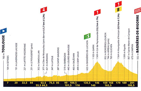 ![]() jeudi 18 juillet 2019 ![]() 11h30 (Haute-Garonne) : Toulouse (km 0) - Cugnaux (km 1.5) - Lavernose-Lacasse (km 20) - Saint-Élix-le-Château (km 37.5) - D6 Le Fousseret (près de) (km 44) - Côte de Montoulieu-Saint-Bernard (km 62.5-GPM4) - Aurignac (km 64.5) - Aulon (km 71.5) - Lieoux (km 78.5) - Saint-Gaudens (km 85) - D8 Valentine (km 89) - Barbazan (km 99) - (Hautes-Pyrénées) : D122 Loures-Barousse (km 101.5) - Saléchan (km 109.5) - (Haute-Garonne) : Esténos (km 110.5) - D125 Cierp-Gaud (km 115-ravitaillement) - Cazaux-Layrisse (près de) (km 121.5) - Bagnères-de-Luchon (km 130.5-sprint) - D618 Saint-Aventin (km 137) - Garin (km 140) - Col de Peyresourde (km 146-GPM1) - (Hautes-Pyrénées) : Aneran (km 154.5) - Arreau (près de) (km 163.5) - Guchen (km 168) - D113 Hourquette d'Ancizan (km 179-GPM1-bonus) - Payolle (km 189) - Sainte-Marie-de-Campan (km 195.5) - Campan (km 201) - Asté (km 204) - D208 Gerde (km 206.5) - D8 Bagnères-de-Bigorre / entrée (km 208.5) - D935 Bagnères-de-Bigorre / Allée J. Jaurès (km 209.5). ![]() ![]() ![]() vidéo DailyMotion ![]() Étape : ![]() 1. Simon Yates (Gbr) en 4h57'53" (moy : 42.198 km/h) 2. Pello Bilbao (Esp) 3. Gregor Mühlberger (Aut) 4. Tiesj Benoot (Bel) à 1'28" 5. Fabio Felline (Ita) 6. Matteo Trentin (Ita) 7. Oliver Naesen (Bel) 8. Rui Costa (Por) 9. Simon Clarke (Aus) 10. Jasper Stuyven (Bel) 11. Greg Van Avermaet (Bel) 12. Dylan Teuns (Bel) 13. Serge Pauwels (Bel) 14. Mathias Frank (Sui) 15. Nicolas Roche (Irl) 16. Maximilian Schachmann (All) 17. Tony Gallopin (Fra) 18. Michael Valgren Andersen (Dan) à 1'33" 19. Imanol Erviti (Esp) à 5'13" 20. Alberto Bettiol (Ita) 21. Pierre Luc Périchon (Fra) 22. Dylan Van Baarle (Hol) à 9'35" 23. Luke Rowe (Gbr) 24. Michal Kwiatkowski (Pol) 25. Jonathan Castroviejo (Esp) 26. Wout Poels (Hol) 27. Geraint Thomas (Gbr) 28. Egan Bernal (Col) 29. Gianni Moscon (Ita) 30. Marc Soler (Esp) 31. Julian Alaphilippe (Fra) 32. Dries Devenyns (Bel) 33. Richie Porte (Aus) 34. Xandro Meurisse (Bel) 35. Enric Mas (Esp) 36. Alejandro Valverde (Esp) 37. Julien Bernard (Fra) 38. Odd Christian Eiking (Nor) 39. Thibaut Pinot (Fra) 40. Michael Schär (Sui) 41. David Gaudu (Fra) 42. Patrick Konrad (Aut) 43. Mikel Landa (Esp) 44. Nairo Quintana (Col) 45. Emanuel Buchmann (All) 46. Jakob Fuglsang (Dan) 47. Andrey Amador (Crc) 48. Bauke Mollema (Hol) 49. Giulio Ciccone (Ita) 50. Steven Kruijswijk (Hol) 51. Romain Bardet (Fra) 52. Mikael Cherel (Fra) 53. Hugo Houle (Can) 54. Roman Kreuziger (Tch) 55. Toms Skujins (Lat) 56. Warren Barguil (Fra) 57. Mike Teunissen (Hol) 58. Sébastien Reichenbach (Sui) 59. Maxime Bouet (Fra) 60. Daniel Martin (Irl) 61. Alexey Lutsenko (Kaz) 62. Julien Simon (Fra) 63. Omar Fraile (Esp) 64. Anthony Perez (Fra) 65. Damiano Caruso (Ita) 66. Tanel Kangert (Est) 67. Jack Haig (Aus) 68. Adam Yates (Gbr) 69. Rigoberto Uran (Col) 70. Amael Moinard (Fra) 71. Guillaume Martin (Fra) 72. Alexis Vuillermoz (Fra) 73. Ilnur Zakarin (Rus) 74. Rein Taaramäe (Est) 75. Luis Leon Sanchez (Esp) 76. Fabio Aru (Ita) 77. Gorka Izagirre (Esp) 78. Magnus Cort Nielsen (Dan) 79. Lilian Calmejane (Fra) 80. Jesus Herrada (Esp) 81. Stéphane Rossetto (Fra) 82. Laurens De Plus (Bel) 83. Sergio Henao (Col) 84. Rudy Molard (Fra) 85. Romain Sicard (Fra) 86. Kevin Ledanois (Fra) 87. George Bennett (Nzl) 88. Michael Woods (Can) 89. Wilco Kelderman (Hol) 90. Michael Matthews (Aus) 91. Thomas De Gendt (Bel) à 15'30" 92. Tim Wellens (Bel) 93. Andrea Pasqualon (Ita) 94. Stephen Cummings (Gbr) 95. Carlos Verona (Esp) 96. Michael Mørkøv (Dan) à 18'58" 97. Alexander Kristoff (Nor) 98. Anthony Roux (Fra) 99. Matthieu Ladagnous (Fra) 100. Edvald Boasson Hagen (Nor) 101. Nils Politt (All) 102. Lukasz Wisniowski (Pol) 103. Ben King (Usa) 104. Nikias Arndt (All) 105. Daniel Oss (Ita) 106. Yoann Offredo (Fra) 107. Simon Geschke (All) 108. Sven Erik Bystrøm (Nor) 109. Anthony Delaplace (Fra) 110. Vincenzo Nibali (Ita) 111. Paul Ourselin (Fra) 112. Sonny Colbrelli (Ita) 113. Vegard Stake Laengen (Nor) 114. Joseph Rosskopf (Usa) 115. José Gonçalves (Por) 116. Frederik Backaert (Bel) 117. Jan Tratnik (Slo) 118. Chad Haga (Usa) 119. Nelson Oliveira (Por) 120. Florian Vachon (Fra) 121. Elie Gesbert (Fra) 122. Luke Durbridge (Aus) 123. Christopher Juul Jensen (Dan) 124. Daryl Impey (Afs) 125. Fabien Grellier (Fra) 126. Ivan Garcia (Esp) 127. Tom Scully (Nzl) 128. Alexis Gougeard (Fra) 129. Benoit Cosnefroy (Fra) 130. Dylan Groenewegen (Hol) 131. Søren Kragh Andersen (Dan) à 19'09" 132. Koen De Kort (Hol) à 20'56" 133. Stefan Küng (Sui) 134. Natnael Berhane (Eri) 135. William Bonnet (Fra) 136. Kevin Van Melsen (Bel) 137. Niccolò Bonifazio (Ita) 138. Matej Mohoric (Slo) 139. Mads Würtz Schmidt (Dan) 140. Marcus Burghardt (All) 141. Peter Sagan (Slq) 142. Cees Bol (Hol) à 24'41" 143. Marco Haller (Aut) à 25'32" 144. Alex Dowsett (Gbr) 145. Anthony Turgis (Fra) 146. Lennard Kämna (All) 147. Lukas Pöstlberger (Aut) 148. Reinardt Janse Van Rensburg (Afs) 149. Tony Martin (All) à 26'34" 150. André Greipel (All) 151. Roger Kluge (All) 152. Jasper De Buyst (Bel) 153. Elia Viviani (Ita) 154. Maxime Monfort (Bel) 155. Kasper Asgreen (Dan) 156. Lars Bak (Dan) 157. Jens Keukeleire (Bel) 158. Yves Lampaert (Bel) 159. Maximiliano Richeze (Arg) 160. Michael Hepburn (Aus) 161. Jens Debusschere (Bel) 162. Aime De Gendt (Bel) 163. Sebastian Langeveld (Hol) 164. Wout Van Aert (Bel) 165. Caleb Ewan (Aus) 166. Amund Grøndahl Jansen (Nor) Non-partant : Jasper Philipsen (Bel) Abandon : Rohan Dennis (Aus) Giacomo Nizzolo (Ita) Bonus km 179 - La Hourquette d'Ancizan 1. Simon Yates (Gbr) 8" 2. Gregor Mühlberger (Aut) 5" 3. Pello Bilbao (Esp) 2" Prix de la combativité : Matteo Trentin (Ita) Classement général : ![]() 1. Julian Alaphilippe (Fra) en 52h26'09" 2. Geraint Thomas (Gbr) à 1'12" 3. Egan Bernal (Col) à 1'16" 4. Steven Kruijswijk (Hol) à 1'27" 5. Emanuel Buchmann (All) à 1'45" 6. Enric Mas (Esp) à 1'46" 7. Adam Yates (Gbr) 