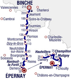 ![]() lundi 8 juillet 2019 ![]() 10h20 (BELGIQUE) -N55 Binche (km 0) - Merbes-le-Château (km 6) - N561 Erquelinnes (km 10) - (FRANCE) - (Nord) : D336 Jeumont (km 12) - Solre-le-Château (km 27) - Trélon (km 41) - D170 Fourmies (km 48.5) - (Aisne) : D963 Hirson (km 62) - D74 Bucilly (km 69) - D376 Piomion (km 79) - D36 Vigneux-Hocquet (km 87.5) - D966 Montcornet (km 93.5) - Dizy-le-Gros (km 102-sprint) - Nizy-le-Comte (km 108.5) - Neufchâtel-sur-Aisne (km 124.5) - (Marne) : D374 Bourgogne-Fresne (km 135.5) - D74 Bétheny (km 143) - Reims (km 146) - Tinqueux (km 151) - D6E3 Les Mesneux (km 155.5) - Sermiers (km 164) - D386 Côte de Nanteuil-la-Forêt (km 173-GPM4) - D22 Fleury-la-Rivière (km 176.5) - Damery (km 179.5) - D1 Cumières (km 183.5) - Côte d'Hautvillers (km 185.5-GPM3) - Côte de Champillon (km 190-GPM3) - D251 Dizy (km 194) - Aÿ (km 195.5) - D201E Côte de Mutigny (km 199-GPM3-bonus) - Mutigny (km 199.5) - Mareuil-sur-Aÿ (km 202.5) - D9 Qiry (près de) (km 205) - D3 Chouilly (km 206.5) - D40A Plumecoq (km 210) - Côte du mont Bernon (km 211) - Épernay / entrée (km 211.5) - Épernay / rue des Coteaux (km 215). ![]() ![]() ![]() vidéo DailyMotion ![]() Étape : ![]() 1. Julian Alaphilippe (Fra) en 4h40'29" (moy : 45.992 km/h) 2. Michael Matthews (Aus) à 26" 3. Jasper Stuyven (Bel) 4. Greg Van Avermaet (Bel) 5. Peter Sagan (Slq) 6. Matteo Trentin (Ita) 7. Sonny Colbrelli (Ita) 8. Xandro Meurisse (Bel) 9. Wout Van Aert (Bel) 10. Thibaut Pinot (Fra) 11. Tiesj Benoot (Bel) 12. Egan Bernal (Col) 13. Geraint Thomas (Gbr) à 31" 14. Jakob Fuglsang (Dan) 15. Guillaume Martin (Fra) 16. Romain Bardet (Fra) 17. Steven Kruijswijk (Hol) 18. Alexey Lutsenko (Kaz) 19. Rudy Molard (Fra) 20. Michael Woods (Can) 21. Rigoberto Uran (Col) 22. Giulio Ciccone (Ita) 23. Vincenzo Nibali (Ita) 24. Patrick Konrad (Aut) 25. Adam Yates (Gbr) 26. Edvald Boasson Hagen (Nor) 27. Wilco Kelderman (Hol) 28. Emanuel Buchmann (All) 29. Mikel Landa (Esp) 30. Alejandro Valverde (Esp) 31. Daniel Martin (Irl) 32. Roman Kreuziger (Tch) 33. Warren Barguil (Fra) 34. Bauke Mollema (Hol) 35. Nairo Quintana (Col) 36. Fabio Felline (Ita) 37. Richie Porte (Aus) 38. Enric Mas (Esp) 39. Maximilian Schachmann (All) 40. David Gaudu (Fra) 41. Rui Costa (Por) 42. Jack Haig (Aus) 43. Tejay Van Garderen (Usa) 44. Nicolas Roche (Irl) 45. Jesus Herrada (Esp) 46. Nicolas Edet (Fra) 47. Rein Taaramäe (Est) 48. Alexis Vuillermoz (Fra) 49. Gregor Mühlberger (Aut) 50. Luis León Sanchez (Esp) 51. Marc Soler (Esp) 52. George Bennett (Nzl) 53. Pello Bilbao (Esp) 54. Daryl Impey (Afs) 55. Sébastien Reichenbach (Sui) à 45" 56. Andrey Amador (Crc) à 49" 57. Alessandro De Marchi (Ita) à 1'01" 58. Michael Valgren Andersen (Dan) à 1'04" 59. Mathias Frank (Sui) à 1'13" 60. Michal Kwiatkowski (Pol) 61. Fabio Aru (Ita) à 1'22" 62. Wout Poels (Hol) à 1'44" 63. Dylan Teuns (Bel) 64. Mikael Cherel (Fra) 65. Gianni Moscon (Ita) à 2'19" 66. Simon Geschke (All) 67. Simon Clarke (Aus) à 3'18" 68. Jonathan Castroviejo (Esp) à 3'32" 69. Joseph Rosskopf (Usa) à 3'42" 70. Nils Politt (All) à 3'51" 71. Ilnur Zakarin (Rus) 72. Jan Tratnik (Slo) 73. Tanel Kangert (Est) 74. Natnael Berhane (Ery) 75. Andrea Pasqualon (Ita) 76. Julien Bernard (Fra) 77. Laurens De Plus (Bel) à 4'09" 78. Lennard Kämna (All) à 4'54" 79. Julien Simon (Fra) 80. Mike Teunissen (Hol) 81. Simon Yates (Gbr) à 6'23" 82. Dries Devenyns (Bel) à 8'28" 83. Omar Fraile (Esp) 84. Hugo Houle (Can) à 8'35" 85. Stefan Küng (Sui) 86. Tony Gallopin (Fra) 87. Maxime Monfort (Bel) 88. Elie Gesbert (Fra) 89. Rohan Dennis (Aus) 90. Sergio Henao (Col) à 8'42" 91. Søren Kragh Andersen (Dan) à 8'43" 92. Matej Mohoric (Slo) 93. Thomas De Gendt (Bel) à 9'26" 94. Odd Christian Eiking (Nor) 95. Mads Würtz Schmidt (Dan) 96. Maxime Bouet (Fra) 97. Nelson Oliveira (Por) 98. Lars Bak (Dan) 99. Anthony Roux (Fra) 100. Lilian Calmejane (Fra) 101. Romain Sicard (Fra) 102. Nikias Arndt (All) 103. Tim Wellens (Bel) à 9'32" 104. Jens Keukeleire (Bel) 105. Anthony Perez (Fra) 106. Reinardt Janse Van Rensburg (Afs) 107. Gorka Izagirre Insausti (Esp) 108. Pierre Luc Perichon (Fra) 109. Yves Lampaert (Bel) à 9'38" 110. Christophe Laporte (Fra) à 9'43" 111. Toms Skujins (Let) 112. Elia Viviani (Ita) à 10'21" 113. Marcus Burghardt (All) 114. Daniel Oss (Ita) 115. Lukas Pöstlberger (Aut) 116. Jasper Philipsen (Bel) à 11'34" 117. Jens Debusschere (Bel) à 13'58" 118. Ivan Garcia (Esp) 119. Yoann Offredo (Fra) 120. Ben King (Usa) 121. Oliver Naesen (Bel) 122. Frederik Backaert (Bel) 123. Paul Ourselin (Fra) 124. Koen de Kort (Hol) 125. Michael Hepburn (Aus) 126. Kevin Van Melsen (Bel) 127. Rick Zabel (All) 128. Damiano Caruso (Ita) 129. Matthieu Ladagnous (Fra) 130. Giacomo Nizzolo (Ita) 131. Patrick Bevin (Nzl) 132. William Bonnet (Fra) 133. Lukasz Wisniowski (Pol) 134. Fabien Grellier (Fra) 135. Michael Schär (Sui) 136. Stéphane Rossetto (Fra) 137. Serge Pauwels (Bel) 138. Carlos Verona (Esp) 139. Luke Durbridge (Aus) 140. Imanol Erviti (Esp) 141. Alex Dowsett (Gbr) 142. Marco Haller (Aut) 143. Christopher Juul Jensen (Dan) 144. Luke Rowe (Gbr) 145. Caleb Ewan (Aus) 146. Niki Terpstra (Hol) 147. José Gonçalves (Por) 148. Alberto Bettiol (Ita) 149. Jasper De Buyst (Bel) 150. Sven Erik Bystrøm (Nor) 151. Chad Haga (Usa) 152. Dylan van Baarle (Hol) 153. Vegard Stake Laengen (Nor) 154. Anthony Turgis (Fra) 155. Florian Vachon (Fra) 156. Kevin Ledanois (Fra) 157. Sebastian Langeveld (Hol) 158. Alexander Kristoff (Nor) 159. Niccolò Bonifazio (Ita) 160. Amael Moinard (Fra) 161. André Greipel (All) 162. Alexis Gougeard (Fra) 163. Anthony Delaplace (Fra) 164. Dylan Groenewegen (Hol) 165. Tony Martin (All) 166. Michael Mørkøv (Dan) 167. Magnus Cort Nielsen (Dan) 168. Aime De Gendt (Bel) 169. Maximiliano Richeze (Arg) 170. Stephen Cummings (Gbr) 171. Amund Grøndahl Jansen (Nor) 172. Benoit Cosnefroy (Fra) 173. Tom Scully (Nzl) 174. Roger Kluge (All) 175. Cees Bol (Hol) 176. Kasper Asgreen (D