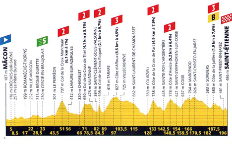 ![]() samedi 13 juillet 2019 ![]() 12h10 (Saône-et-Loire) : D89 Mâcon (km 0) - Crêches-sur-Saône (km 5) - D186 Le Plâtre Durand (km 8.5) - (Rhône) : D68 Chénas (km 14) - (Saône-et-Loire) : Romanèche-Thorins (km 17) - (Rhône) : C6 Lancié (km 19.5) - D9 Villié-Morgon (km 22) - D602 Régnié-Durette (km 28.5) - D337 Cercié-en-Beaujolais (km 33-sprint) - D68 Saint-Lager (km 34) - D68E Odenas (km 38) - D133 Le Perréon (km 43.5) - D88E Col de la Croix Montmain (km 51-GPM2) - D44 Lamure-sur-Azergues (km 56) - Chamelet (km 66) - Col de la Croix de Thel (km 71-GPM2) - Valsonne (km 78.5) - D56 Col de la Croix Paquet (km 84.5-GPM2) - Tarare (km 86) - Côte d'Affoux (km 97-GPM3) - D4 Villechenève (km 103.5) - Courzieu (km 128) - Côte de la Croix de Part (km 133) - D25 Sainte-Foy-l'Argentière (km 142.5) - D4 Côte d'Aveize (km 148.5-GPM2) - Saint-Symphorien-sur-Coise (km 154) - D71 Coise (km 40.5) - (Loire) : D23 Saint-Christo-en-Jarez (km 170.5) - D6 Col de la Gachet (km 174) - D2 Le Terrier (km 175) - Côte de la Jaillère (km 187.5-GPM3-bonus) - D23 La Guithardière (km 191.5) - D11 L'Étrat (km 195.5) - Saint-Étienne / rue Claude Verney Carron (km 200). ![]() ![]() ![]() vidéo DailyMotion ![]() Étape : ![]() 1. Thomas De Gendt (Bel) en 5h00'17" (moy : 39.762 km/h) 2. Thibaut Pinot (Fra) à 6" 3. Julian Alaphilippe (Fra) 4. Michael Matthews (Aus) à 26" 5. Peter Sagan (Slq) 6. Matteo Trentin (Ita) 7. Xandro Meurisse (Bel) 8. Greg Van Avermaet (Bel) 9. Egan Bernal (Col) 10. Geraint Thomas (Gbr) 11. Patrick Konrad (Aut) 12. Alexey Lutsenko (Kaz) 13. Nairo Quintana (Col) 14. Rigoberto Uran (Col) 15. David Gaudu (Fra) 16. Adam Yates (Gbr) 17. Warren Barguil (Fra) 18. Emanuel Buchmann (All) 19. Bauke Mollema (Hol) 20. Fabio Aru (Ita) 21. Jakob Fuglsang (Dan) 22. Enric Mas (Esp) 23. Steven Kruijswijk (Hol) 24. Giulio Ciccone (Ita) 25. Roman Kreuziger (Tch) 26. Richie Porte (Aus) 27. Mikel Landa (Esp) 28. Romain Bardet (Fra) 29. Sébastien Reichenbach (Sui) 30. George Bennett (Nzl) 31. Alejandro Valverde (Esp) 32. Daniel Martin (Irl) 33. Jack Haig (Aus) 34. Guillaume Martin (Fra) 35. Sergio Henao (Col) 36. Lennard Kämna (All) à 32" 37. Søren Kragh Andersen (Dan) à 56" 38. Nicolas Roche (Irl) à 1'46" 39. Jesus Herrada (Esp) à 2'38" 40. Rein Taaramäe (Est) à 3'27" 41. Maximilian Schachmann (All) à 3'42" 42. Alessandro De Marchi (Ita) à 4'11" 43. Michal Kwiatkowski (Pol) à 4'25" 44. Alberto Bettiol (Ita) 45. Vincenzo Nibali (Ita) 46. Alexis Vuillermoz (Fra) à 4'42" 47. Ilnur Zakarin (Rus) à 5'01" 48. Mathias Frank (Sui) à 5'37" 49. Simon Geschke (All) 50. Rudy Molard (Fra) à 5'45" 51. Julien Bernard (Fra) 52. Maxime Bouet (Fra) 53. Wilco Kelderman (Hol) 54. Laurens De Plus (Bel) 55. Tanel Kangert (Est) 56. Gorka Izagirre Insausti (Esp) 57. Pierre Luc Perichon (Fra) à 8'02" 58. Rui Costa (Por) à 8'12" 59. Jonathan Castroviejo (Esp) 60. Andrey Amador (Crc) 61. Pello Bilbao (Esp) 62. Marc Soler (Esp) 63. Wout Poels (Hol) 64. Gregor Mühlberger (Aut) 65. Dylan van Baarle (Hol) à 9'46" 66. Luke Durbridge (Aus) à 13'46" 67. Elie Gesbert (Fra) 68. Christopher Juul Jensen (Dan) 69. Michael Woods (Can) à 14'22" 70. Simon Clarke (Aus) 71. Mikael Cherel (Fra) 72. Ben King (Usa) à 16'57" 73. Wout Van Aert (Bel) 74. Omar Fraile (Esp) 75. Jens Keukeleire (Bel) à 17'13" 76. Sonny Colbrelli (Ita) 77. Damiano Caruso (Ita) 78. Nelson Oliveira (Por) 79. Amael Moinard (Fra) 80. Rohan Dennis (Aus) 81. Michael Schär (Sui) 82. Toms Skujins (Let) 83. Simon Yates (Gbr) 84. Matthieu Ladagnous (Fra) à 19'43" 85. Stéphane Rossetto (Fra) 86. Nils Politt (All) 87. Tim Wellens (Bel) 88. Oliver Naesen (Bel) 89. Daniel Oss (Ita) 90. Stefan Küng (Sui) 91. Paul Ourselin (Fra) 92. Anthony Roux (Fra) 93. Jasper De Buyst (Bel) 94. Jasper Stuyven (Bel) 95. Jasper Philipsen (Bel) 96. Daryl Impey (Afs) 97. Hugo Houle (Can) 98. Niki Terpstra (Hol) 99. Joseph Rosskopf (Usa) 100. Fabio Felline (Ita) 101. Florian Vachon (Fra) 102. Anthony Delaplace (Fra) 103. Michael Valgren Andersen (Dan) 104. Romain Sicard (Fra) 105. Vegard Stake Laengen (Nor) 106. Lukas Pöstlberger (Aut) 107. Tony Gallopin (Fra) 108. Carlos Verona (Esp) 109. Dries Devenyns (Bel) 110. Kevin Ledanois (Fra) 111. Luis León Sanchez (Esp) 112. Magnus Cort Nielsen (Dan) 113. Jan Tratnik (Slo) à 23'47" 114. Fabien Grellier (Fra) 115. Tiesj Benoot (Bel) 116. Andrea Pasqualon (Ita) 117. Matej Mohoric (Slo) 118. Anthony Perez (Fra) 119. Lilian Calmejane (Fra) 120. Serge Pauwels (Bel) 121. Natnael Berhane (Ery) 122. Mads Würtz Schmidt (Dan) 123. Imanol Erviti (Esp) 124. Edvald Boasson Hagen (Nor) 125. Luke Rowe (Gbr) 126. Maxime Monfort (Bel) 127. Marco Haller (Aut) 128. Sebastian Langeveld (Hol) 129. Caleb Ewan (Aus) 130. Gianni Moscon (Ita) à 23'55" 131. Dylan Teuns (Bel) à 26'32" 132. Yves Lampaert (Bel) 133. Lukasz Wisniowski (Pol) 134. Anthony Turgis (Fra) 135. William Bonnet (Fra) 136. Rick Zabel (All) 137. Frederik Backaert (Bel) 138. Alex Dowsett (Gbr) 139. Koen de Kort (Hol) 140. Marcus Burghardt (All) 141. Kevin Van Melsen (Bel) 142. André Greipel (All) 143. Michael Hepburn (Aus) 144. Tom Scully (Nzl) 145. Reinardt Janse Van Rensburg (Afs) 146. Ivan Garcia (Esp) 147. Kasper Asgreen (Dan) 148. Mike Teunissen (Hol) 149. Julien Simon (Fra) 150. Tony Martin (All) 151. Odd Christian Eiking (Nor) 152. Sven Erik Bystrøm (Nor) 153. Chad Haga (Usa) 154. Amund Grøndahl Jansen (Nor) 155. Dylan Groenewegen (Hol) 156. Cees Bol (Hol) 157. Nikias Arndt (All) 158. Roger Kluge (All) 159. Niccolò Bonifazio (Ita) 160. Maximiliano Richeze (Arg) 161. José Gonçalves (Por) 162. Giacomo Nizzolo (Ita) 163. Elia Viviani (Ita) 164. Stephen Cummings (Gbr) 165. Alexander Kristoff (Nor) 166. Michael Mørkøv (Dan) 167. Jens Debusschere (Bel) 168. Aime De Gendt (Bel) 169. Alexis Gougeard (Fra) 170. Benoit Cosnefroy (Fra) 171. Yoann Offredo (Fra) à 29'44" 172. Lars Bak (Dan) Non-partant : Tejay Van Garderen (Usa) Abandon : Christophe Laporte (Fra) Bonus Cô