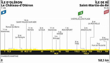 ![]() mardi 8 septembre 2020 ![]() 13h43 (Charente-Maritime) Le Château d'Oléron/D26 (km 0) - Viaduc d'Oléron - Bourcefranc-le-Chappus (km 4) - D728 Marennes-Plage (km 9.5) - Ronce-les-Bains (km 13.5) - Forêt de la Coubre - La Palmyre (km 33) - Saint-Palais-sur-Mer (km 40.5) - Vaux-sur-Mer (km 45) - Royan (km 47) - D733 Jaffé (km 54.5) - L'Éguille (près de) (km 61) - Châlons (km 64) - Saint-Just-Luzac (près de) (km 75.5) - Marennes (km 80.5) - D3 La Maison-Blanche (km 90) - Moëze (km 92) - Soubise (km 95) - D238 Échillais (près de) (km 100) - Rochefort (km 103) - D733 Grand Vergeroux (km 110) - St-Laurent-de-la-Prée (près de) (km 114.5) - Yves (km 118.5) - Les Trois-Canons (km 124) - Châtelaillon-Plage (km 129.5-sprint) - D202 Angoulins (km 132.5) - Aytré (km 136) - La Rochelle (km 139) - D104 Lagord (km 145.5) - L'Houmeau (km 148) - D106 Pont de l'Île de Ré - Rivedoux-Plage (km 156.5) - Sainte-Marie de Ré (km 161) - La Flotte (près de) (km 164) - Saint-Martin-de-Ré/D735 (km 168.5). ![]() ![]() ![]() Vidéo Tour de France/DailyMotion ![]() Étape : ![]() 1. Sam Bennett (Irl) en 3h35'22" (moy: 46.943 km/h) 2. Caleb Ewan (Aus) 3. Peter Sagan (Slq) 4. Elia Viviani (Ita) 5. Mads Pedersen (Dan) 6. André Greipel (All) 7. Bryan Coquard (Fra) 8. Cees Bol (Hol) 9. Jasper Stuyven (Bel) 10. Luka Mezgec (Slo) 11. Michael Mørkøv (Dan) 12. Matteo Trentin (Ita) 13. Hugo Hofstetter (Fra) 14. Clement Venturini (Fra) 15. Alexander Kristoff (Nor) 16. José Rojas (Esp) 17. Hugo Houle (Can) 18. Edward Theuns (Bel) 19. Maximilian Walscheid (All) 20. Oliver Naesen (Bel) 21. Niccolò Bonifazio (Ita) 22. Daryl Impey (Afs) 23. Ryan Gibbons (Afs) 24. Kevin Reza (Fra) 25. Tadej Pogacar (Slo) 26. Greg Van Avermaet (Bel) 27. Mikael Chérel (Fra) 28. Tom Dumoulin (Hol) 29. Cyril Barthe (Fra) 30. Jens Keukeleire (Bel) 31. Nairo Quintana (Col) 32. Primoz Roglic (Slo) 33. Rigoberto Uran (Col) 34. Romain Bardet (Fra) 35. Jens Debusschere (Bel) 36. Mikel Landa (Esp) 37. Wout Van Aert (Bel) 38. Michal Kwiatkowski (Pol) 39. Egan Bernal (Col) 40. Joris Nieuwenhuis (Hol) 41. Pello Bilbao (Esp) 42. Miguel Angel Lopez (Col) 43. Tim Declercq (Bel) 44. Adam Yates (Gbr) 45. Gorka Izagirre (Esp) 46. Sergio Andres Higuita (Col) 47. Guillaume Martin (Fra) 48. Damiano Caruso (Ita) 49. Alejandro Valverde (Esp) 50. Luis León Sanchez (Esp) 51. Imanol Erviti (Esp) 52. Tom Van Asbroeck (Bel) 53. Richie Porte (Aus) 54. Esteban Chaves (Col) 55. Enric Mas (Esp) 56. Bauke Mollema (Hol) 57. Vegard Stake Laengen (Nor) 58. Marc Soler (Esp) 59. Stefan Küng (Sui) 60. Richard Carapaz (Equ) 61. Nelson Oliveira (Por) 62. Nikias Arndt (All) 63. Simone Consonni (Ita) 64. Frederik Frison (Bel) 65. Daniel Oss (Ita) 66. Søren Kragh Andersen (Dan) 67. Christophe Laporte (Fra) à 24" 68. Luke Rowe (Gbr) à 26" 69. Michael Gogl (Aut) 70. Roger Kluge (All) à 32" 71.Amund Grøndahl Jansen (Nor) à 46" 72. Lukas Pöstlberger (Aut) 73. Felix Großschartner (Aut) 74. Sepp Kuss (Usa) 75. Jack Bauer (Nzl) 76. George Bennett (Nzl) 77. Kasper Asgreen (Dan) 78. Matej Mohoric (Slo) à 49" 79. Tiesj Benoot (Bel) à 1'08" 80. Casper Phillip Pedersen (Dan) 81. Marc Hirschi (Sui) à 1'13" 82. Michael Valgren (Dan) 83. Anthony Turgis (Fra) à 1'20" 84. Nicolas Édet (Fra) à 5'25" 85. Quentin Pacher (Fra) 86. Rémi Cavagna (Fra) 87. Kenny Elissonde (Fra) 88. Geoffrey Soupe (Fra) 89. Thomas De Gendt (Bel) 90. Matthieu Ladagnous (Fra) 91. Niklas Eg (Dan) 92. Bob Jungels (Lux) 93. Robert Gesink (Hol) 94. Tony Martin (All) 95. Sonny Colbrelli (Ita) 96. Jan Polanc (Slo) 97. Alexis Vuillermoz (Fra) 98. Pavel Sivakov (Rus) 99. Edvald Boasson Hagen (Nor) 100. Krists Neilands (Let) 101. Toms Skujins (Let) 102. Dayer Quintana (Col) 103. Winner Anacona (Col) 104. Connor Swift (Gbr) 105. Jesus Herrada (Esp) 106. Rudy Molard (Fra) 107. Sébastien Reichenbach (Sui) 108. Pierre Luc Périchon (Fra) 109. Thibaut Pinot (Fra) 110. Warren Barguil (Fra) 111. Valentin Madouas (Fra) 112. Clément Russo (Fra) 113. David Gaudu (Fra) 114. Ben Hermans (Bel) 115. Michael Schär (Sui) 116. Roman Kreuziger (Tch) 117. Mathieu Burgaudeau (Fra) 118. Ilnur Zakarin (Rus) 119. Omar Fraile (Esp) 120. Dario Cataldo (Ita) 121. Marco Haller (Aut) 122. Alexey Lutsenko (Kaz) 123. Gregor Mühlberger (Aut) 124. Simon Geschke (All) 125. Emanuel Buchmann (All) 126. Nans Peters (Fra) 127. Lennard Kämna (All) 128. Jasper De Buyst (Bel) 129. Pierre Latour (Fra) 130. Daniel Martin (Irl) 131. Maximilian Schachmann (All) 132. Daniel Felipe Martinez (Col) 133. Neilson Powless (Usa) 134. Benoît Cosnefroy (Fra) 135. Fabien Grellier (Fra) 136. Pierre Rolland (Fra) 137. Romain Sicard (Fra) 138. Alberto Bettiol (Ita) 139. Cyril Gautier (Fra) 140. Tejay Van Garderen (Usa) 141. Dries Devenyns (Bel) 142. Alessandro De Marchi (Ita) 143. Jan Hirt (Tch) 144. Wout Poels (Hol) 145. Dylan Van Baarle (Hol) 146. Carlos Verona (Esp) 147. Harold Alfonso Tejada (Col) 148. Ion Izagirre (Esp) 149. Andrey Amador (Crc) 150. Christopher Juul Jensen (Dan) 151. Mikel Nieve (Esp) 152. Marco Marcato (Ita) à 5'38" 153. Nils Politt (All) à 7'52" 154. Guy Niv (Isr) 155. David De la Cruz (Esp) à 10'08" 156. Nicolas Roche (Irl) à 10'52" 157. Maxime Chevalier (Fra) 158. Kevin Ledanois (Fra) 159. Jonathan Castroviejo (Esp) 160. Julian Alaphilippe (Fra) 161. Jonas Koch (All) 162. Hugh Carthy (Gbr) à 12'15" 163. Jérôme Cousin (Fra) à 14'34" 164. Davide Formolo (Ita) à 16'44" Bonifications étape : Sam Bennett (Irl) 10" Caleb Ewan (Aus) 6" Peter Sagan (Slq) 4" Abandons : Samuel Bewley (Nzl) Domenico Pozzovivo (Ita) Prix de la combativité : Stefan Küng (Sui) Classement général : ![]() 1. Primoz Roglic (Slo) en 42h15'23" 2. Egan Bernal (Col) à 21" 3. Guillaume Martin (Fra) à 28" 4. Romain Bardet (Fra) à 30" 5. Nairo Quintana (Col) à 32" 6. Rigoberto Uran (Col) m.t 7. Tadej Pogacar (Slo) à 44" 8. Adam Yates (Gbr) à 1'02" 9. Miguel Angel Lopez (Col) à 1'15" 10. Mikel Landa (Esp) à 1'42" 11. Richie Porte (Aus) à 1'53" 