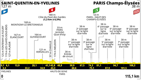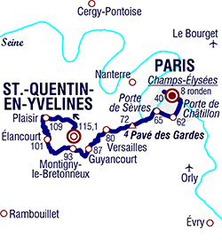 16h40 (Yvelines) : D11 Saint-Quentin-en-Yvelines (km 0) - Villepreux (km 2.6) - Les Clayes-sous-Bois (km 3.3) - Plaisir (km 6.1) - Sainte-Apolline (km 11) - D912 La Mare aux Saules (km 13.5) - D58 Élancourt (km 13.9) - La Commanderie des Templiers (km 17.9) - Bois de l'Étang (près de) (km 18.5) - Z.A Trappes-Élancourt (km 18.7) - D36 Montigny-le-Bretonneux (km 22.2) - Voisins-le-Bretonneux (km 25.1) - Guyancourt (km 28.1) - D91 Le Val d'Or (km 31.2) - Versailles (km 34.9) - D10 Viroflay (km 39.2) - (Hauts-de-Seine) : D910 Chaville (km 41.1) - D181 Côte du Pavé des Gardes (km 42.8-GPM4) - Sèvres (près de) (km 42.9) - Meudon (km 43.3) - D989 Issy-les-Moulineaux (km 43.6) - (Paris) : Paris / entrée (km 48.8) - Porte de Sèvres (km 49.8) - Porte de Versailles (km 50.5) -Porte de La Plaine (km 51) - Porte Brancion (km 51.7) - Porte de Vanves (km 52) - Porte de Châtillon (km 53.1) - Place Denfert-Rochereau (km 54.5) - Port Royal (km 55) - Jardin du Luxembourg (km 55.7) - Place Saint-Michel (km 56.5) - Pont Neuf (km 56.9) - Palais du Louvre (km 58) - Entrée circuit (km 58.9) - 1er passage sur la ligne (km 60.6) - 2ème passage (km 67.5) - 3ème passage (km 74.3) - Haut des Champs-Élysées (km 75.1-sprint) - 4ème passage (km 81.1) - 5ème passage (km 87.9) - 6ème passage (km 94.7) - 7ème passage (km 101.5) - 8ème passage (km 108.3) - 9ème passage Paris / Champs-Elysées (km 115.1).