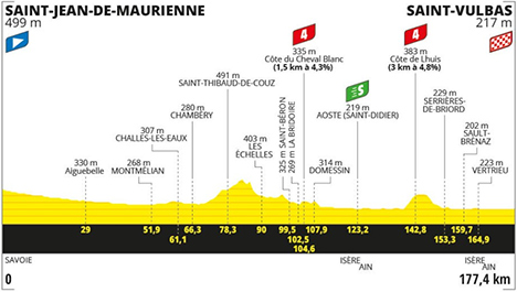 ![]() mercredi 3 juillet 2024 ![]() 13h30 (Savoie) : D1006 Saint-Jean-de-Maurienne (km 0) - Saint-Avre (près de) (km 5.7) - Aiguebelle (km 29) - Arbin (km 50.7) - Montmélian (km 51.9) - Saint-Jéoire-Prieuré (km 59.2) - La Ravoire (km 65) - Saint-Thibaud-de-Couz (km 76.5) - Col de Couz (km 82.7) - Les Échelles (km 90) - Saint-Béron (km 99.5) - La Bridoire (km 102.5) - D921e Côte du Cheval-Blanc (km 104.6-GPM4) - D36 Domessin (km 107.9) - D916a Saintf-Genix-sur-Guiers (km 116.9) - (Isère) : D1516 Aoste / Gare de l'Est (km 117.7) - Aoste (km 118.3) - D592 Aoste (km 123.2-sprint) - (Ain) : D19 La Bruyère (km 126.5) - Le Port de Groslée (km 137.6) - D79 L'Huis (km 142.7) - Côte de l'Huis (km 142.8-GPM4) - D19 Serrières-de-Briord (km 153.3) - Villebois (km 158.3) - Sault-Brénaz (km 159.7) - (Isère) : D1075 Vertrieu (km 164.9) - (Ain) : D1075 Carr. D20 (km 167) - D20 Carr. D124 (km 174.6) - D77 Saint-Vulbas / Av. de Bergeries (km 177.4). ![]() ![]() ![]() Vidéo Tour de France / DailyMotion ![]() Étape : ![]() 1. Mark Cavendish (Gbr) en 4h08'46" (moy : 42.79 km/h) 2. Jasper Philipsen (Bel) 3. Alexander Kristoff (Nor) 4. Arnaud De Lie (Bel) 5. Fabio Jakobsen (Hol) 6. Pascal Ackermann (All) 7. Arnaud Démare (Fra) 8. Gerben Thijssen (Bel) 9. Biniam Girmay (Ery) 10. Marijn Van den Berg (Hol) 11. Fernando Gaviria (Col) 12. Dylan Groenewegen (Hol) 13. Bryan Coquard (Fra) 14. Anthony Turgis (Fra) 15. Sam Bennett (Irl) 16. Stefan Bisseger (Sui) 17. Cedric Beullens (Bel) 18. Mike Teunissen (Hol) 19. Ryan Gibbons (Afs 20. Axel Zingle (Fra) 21. Alexis Renard (Fra) 22. Guillaume Boivin (Can) 23. Sandy Dujardin (Fra) 24. Daniel McLay (Gbr) 25. Cees Bol (Hol) 26. Davide Formolo (Ita) 27. Jasper Stuyven (Bel 28. Derek Gee (Can) 29. Oier Lazcano (Esp) 30. Nils Politt (All) 31. Laurenz Rex (Bel) 32. Oliver Naesen (Bel) 33. Marc Soler (Esp) 34. Jake Stewart (Gbr) 35. Tadej Pogacar (Slo) 36. Ben Healy (Irl) 37. Christophe Laporte (Fra) 38. Jonas Vingegaard (Dan) 39. Bruno Armirail (Fra) 40. Mathieu Van der Poel (Hol) 41. Magnus Cort Nielsen (Dan) 42. Matteo Jorgenson (Usa) 43. Gianni Moscon (Ita) 44. Yves Lampaert (Bel) 45. Mikel Landa (Esp) 46. Krists Neilands (Let) 47. Marco Haller (Aut) 48. Piet Allegaert (Bel) 49. John Degenkolb (All) 50. Jai Hindley (Aus) 51. Aleksandr Vlasov (Rus) 52. Primoz Roglic (Slo) 53. Robbe Ghys (Bel) 54. Guillaume Martin (Fra) 55. Pello Bilbao (Esp) 56. Egan Bernal (Col) 57. Danny Van Poppel (Hol) 58. Remco Evenepoel (Bel) 59. Tiesj Benoot (Bel) 60. Louis Meintjes (Afs) 61. Nils Eekhoff (Hol) 62. Jack Haig (Aus) 63. Laurens De Plus (Bel) 64. Bram Welten (Hol) 65. Geraint Thomas (Gbr) 66. Enric Mas (Esp) 67. Santiago Buitrago (Col) 68. Thomas Gachignard (Fra) 69. Neilson Powless (Usa) 70. Adam Yates (Gbr) 71. Kobe Goossens (Bel) 72. Romain Grégoire (Fra) 73. Simon Yates (Gbr) 74. Alex Aranburu (Esp) 75. Hugo Houle (Can) 76. Steff Cras (Bel) 77. Michael Morkov (Dan) 78. Dorian Godon (Fra) 79. Johannes Kulset (Nor) 80. Ilan Van Wilder (Bel) 81. Clément Russo (Fra) 82. Michal Kwiatkowski (Pol) 83. Carlos Rodriguez (Esp) 84. Georg Zimmermann (All) 85. Julio Ciccone (Ita 86. Stefan Küng (Sui) 87. João Almeida (Por) 88. Odd Christian Eiking (Nor) 89. Valentin Madouas (Fra) 90. Elmar Reinders (Hol) 91. Silvan Dillier (Sui) 92. Amaury Capiot (Bel) 93. Paul Lapeira (Fra) 94. Nans Peters (Fra) 95. Juan Ayuso (Esp) 96. Felix Gall (Aut) 97. Luca Mezgec (Slo) 98. Jordan Jegat (Fra) 99. Wout Van Aert (Bel) 100. Simon Geschke (All) 101. Wilco Keldermann (Hol) 102. Carlos Verona (Esp 103. Toms Skujins (Let 104. Julien Bernard (Fra 105. Bob Jungels (Lux) 106. Kevin Geniets (Lux) 107. Richard Carapaz (Equ) 108. Alexey Lutsenko (Kaz) 109. Kévin Vauquelin (Fra) 110. Warren Barguil (Fra) 111. Raul Garcia Pierna (Esp) 112. Tim Wellens (Bel) 113. Chris Harper (Aus) 114. Nikias Arndt (All) 115. Tobias Halland Johannessen (Nor) 116. Nicolas Prodhomme (Fra) 117. Cristian Rodriguez (Esp) 118. Soren Kragh Andersen (Dan) 119. Louis Vervaecke (Bel) 120. Tim Declercq (Bel 121. Jonas Abrahamsen (Nor) 122. Ben Turner (Gbr) 123. Rasmus Tiller (Nor) 124. Jonas Rickaert (Bel) 125. Yevgeniy Fedorov (Kaz) 126. Luke Durbridge (Aus) 127. Mads Pedersen (Dan 128. Rui Costa (Por) 129. Matej Mohoric (Slo) 130. Jakob Fuglsang (Dan) 131. Sébastien Grignard (Fra) 132. Gianni Vermeersch (Bel) 133. Lenny Martinez (Fra) 134. Pavel Sivakov (Fra) 135. Maxim Van Gils (Bel) 136. Axel Laurance (Fra) 137. Wout Poels (Hol) 138. Matteo Sobrero (Ita) 139. Nico Denz (All) 140. Javier Romo (Esp) 141. Michael Matthews (Aus) 142. Victor Campenaerts (Bel) 143. Ion Izagirre (Esp) 144. Luca Mozzato (Ita) 145. Nelson Oliveira (Por) 146. Alberto Bettiol (Ita) 147. Frank Van den Broek (Hol) 148. Sean Quinn (Usa) 149. Clément Champoussin (Fra) 150. Fabien Grellier (Fra) 151. Brent Van Moer (Bel) 152. Christopher Juul-Jensen (Dan) 153. Thomas Pidcock (Gbr) 154. Stephen Williams (Gbr) 155. Quentin Pacher (Fra) 156. Jesus Herrada (Esp) à 1'02" 157. Davide Ballerini (Ita) à 0'00" 158. Oscar Onley (Gbr) 159. Jan Hirt (Tch) 160. Bart Lemmen (Hol) 161. Gregor Mühlberger (Aut) 162. Jarrad Drizners (Aus) 163. Harm Vanhoucke (Bel) 164. Harold Tejada (Col) 165. David Gaudu (Fra) 166. Jan Tratnik (Slo) 167. Jonathan Castroviejo (Esp) 168. Mathieu Burgaudeau (Fra) 169. Romain Bardet (Fra) 170. Hugo Page (Can) 171. Phil Bauhaus (All) 172. Fred Wright (Gbr) à 2'43" 173. Mattéo Vercher (Fra) 174. Soren Wærenskjold (Nor) à 3'06" Prix de la combativité : Clément Russo (Fra) Classement général : ![]() 1. Tadej Pogacar (Slo) en 23h15'24" 2. Remco Evenepoel (Bel) à 45" 3. Jonas Vingegaard (Dan) à 50" 4. Juan Ayuso (Esp) à 1'10" 5. Primoz Roglic (Slo) à 1'14" 6. Carlos Rodriguez (Esp) à 1'16" 7. Mikel Landa (Esp) à 1'32" 8. João Almeida (Por) m.t 9. Giulio Ciccone (Ita) à 3'20" 10. Egan Bernal (Col) à 3'21" 11. Matteo Jorgenson (Usa) 12. Felix Gall (Aut) 13. Adam Yates (Gbr) t.m.t 14. Aleksandr Vlasov (Rus) à 3'44" 15. Santiago Bu