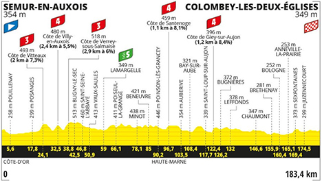 ![]() samedi 6 juillet 2024 ![]() 13h20 (Côte-d'Or) : D9 Semur-en-Auxois (km 0) - Pouillenay (km 5.6) - D905 Posanges (km 17.8) - D26 Côte de Viteaux (km 24.1-GPM3) - Côte de Villy-en-Auxois (km 32.5-GPM4) - Côte de Verrey-sous-Salmaise (km 38.8-GPM3) - D16 Vaux-Saules (km 50.9) - D6 Lamargelle (km 59-sprint) - D19 Poiseul-la-Grange (km 66.1) - D101e Minot (km 78.1) - D959 Beneuvre (km 85.5) - (Haute-Marne) : D118 Poinson-lès-Grancey (km 90.2) - D150 Côte de Santenoge (km 96.7-GPM4) - Auberive (km 103.5) - D20 Bay-sur-Aube (km 108.4) - D129 Saint-Loup-sur-Aujon (km 117.7) - D6 Giey-sur-Aujon (km 1206) - D154 Côte de Giey-sur-Aujon (km 122.4-GPM4) - Bugnières (km 126.2) - Leffonds (km 132) - D107 Creney (km 139.3) - D143 Neuilly-sur-Suize (km 142.7) - Chaumont (km 146.6) - D200 Condes (km 154.3) - Brethenay (km 155.9) - Bologne (km 160.4) - D44 Marault (km 162.3) - Annéville-la-Prairie (km 165.1) - Meures (km 166.8) - Sexfontaines (km 169.4) - Juzennecourt (km 174.5) - D619 Colombey-les-Deux-Églises (km 183.4). ![]() ![]() ![]() Vidéo Tour de France / DailyMotion ![]() Étape : ![]() 1. Biniam Girmay (Ery) en 4h04'50" (moy : 44.95 km/h) 2. Jasper Philipsen (Bel) 3. Arnaud De Lie (Bel) 4. Pascal Ackermann (All) 5. Marijn Van den Berg (Hol) 6. Ryan Gibbons (Afs) 7. Anthony Turgis (Fra) 8. Fred Wright (Gbr) 9. Alex Aranburu (Esp) 10. Remco Evenepoel (Bel) 11. Soren Kragh Andersen (Dan) 12. Alexander Kristoff (Nor) 13. Tadej Pogacar (Slo) 14. Nikias Arndt (All) 15. Clément Russo (Fra) 16. Maxim Van Gils (Bel) 17. Bob Jungels (Lux) 18. Axel Laurance (Fra) 19. Santiago Buitrago (Col) 20. Cees Bol (Hol) 21. Toms Skujins (Let 22. Guillaume Martin (Fra) 23. Ilan Van Wilder (Bel) 24. Aleksandr Vlasov (Rus) 25. Dylan Groenewegen (Hol) 26. Nils Eekhoff (Hol) 27. Sam Bennett (Irl) 28. Derek Gee (Can) 29. Ben Healy (Irl) 30. Mikel Landa (Esp) 31. Thomas Pidcock (Gbr) 32. Arnaud Démare (Fra) 33. Jonas Vingegaard (Dan) 34. Gianni Moscon (Ita) 35. Magnus Cort Nielsen (Dan) 36. Primoz Roglic (Slo) 37. Bryan Coquard (Fra) 38. Julio Ciccone (Ita 39. Carlos Rodriguez (Esp) 40. Matteo Jorgenson (Usa) 41. Enric Mas (Esp) 42. Steff Cras (Bel) 43. Richard Carapaz (Equ) 44. Romain Grégoire (Fra) 45. Laurens De Plus (Bel) 46. Egan Bernal (Col) 47. Jack Haig (Aus) 48. Louis Meintjes (Afs) 49. Simon Yates (Gbr) 50. Jai Hindley (Aus) 51. João Almeida (Por) 52. Adam Yates (Gbr) 53. Matteo Sobrero (Ita) 54. Juan Ayuso (Esp) 55. Nans Peters (Fra) 56. Paul Lapeira (Fra) 57. Pello Bilbao (Esp) 58. Nicolas Prodhomme (Fra) 59. Christophe Laporte (Fra) 60. Javier Romo (Esp) 61. Felix Gall (Aut) 62. Davide Formolo (Ita) 63. Tim Declercq (Bel 64. Stefan Küng (Sui) 65. Rasmus Tiller (Nor) 66. Julien Bernard (Fra 67. Bruno Armirail (Fra) 68. Thomas Gachignard (Fra) 69. Piet Allegaert (Bel) 70. Danny Van Poppel (Hol) 71. Georg Zimmermann (All) 72. Tobias Halland Johannessen (Nor) 73. Axel Zingle (Fra) 74. Cedric Beullens (Bel) 75. Nils Politt (All) 76. Hugo Houle (Can) 77. Yevgeniy Fedorov (Kaz) 78. Nico Denz (All) 79. Wilco Keldermann (Hol) 80. Carlos Verona (Esp 81. Tim Wellens (Bel) 82. Yves Lampaert (Bel) 83. Fernando Gaviria (Col) 84. Robbe Ghys (Bel) 85. Luca Mozzato (Ita) 86. Amaury Capiot (Bel) 87. Michael Morkov (Dan) 88. Mark Cavendish (Gbr) 89. Mike Teunissen (Hol) 90. Valentin Madouas (Fra) 91. Nelson Oliveira (Por) 92. Louis Vervaecke (Bel) 93. Geraint Thomas (Gbr) 94. Kevin Geniets (Lux) 95. John Degenkolb (All) 96. Raul Garcia Pierna (Esp) 97. Jake Stewart (Gbr) 98. Silvan Dillier (Sui) 99. Kévin Vauquelin (Fra) 100. Tiesj Benoot (Bel) 101. Mathieu Van der Poel (Hol) 102. Elmar Reinders (Hol) 103. Wout Poels (Hol) 104. Stephen Williams (Gbr) 105. Daniel McLay (Gbr) 106. Christopher Juul-Jensen (Dan) 107. Krists Neilands (Let) 108. Gianni Vermeersch (Bel) 109. Jasper Stuyven (Bel 110. Dorian Godon (Fra) 111. Luke Durbridge (Aus) 112. Luca Mezgec (Slo) 113. Matej Mohoric (Slo) à 42" 114. Hugo Page (Can) 115. Laurenz Rex (Bel) 116. Bart Lemmen (Hol) 117. Jonas Rickaert (Bel) 118. Pavel Sivakov (Fra) 119. Alexis Renard (Fra) 120. Guillaume Boivin (Can) 121. Michal Kwiatkowski (Pol) 122. Frank Van den Broek (Hol) 123. Marco Haller (Aut) à 55" 124. Oliver Naesen (Bel) 125. Clément Champoussin (Fra) à 1'03" 126. Davide Ballerini (Ita) 127. Alberto Bettiol (Ita) 128. Rui Costa (Por) à 1'12" 129. Brent Van Moer (Bel) à 1'17" 130. Sébastien Grignard (Fra) à 1'31" 131. Romain Bardet (Fra) à 1'38" 132. Wout Van Aert (Bel) 133. Victor Campenaerts (Bel) 134. Neilson Powless (Usa) 135. Harold Tejada (Col) 136. Alexey Lutsenko (Kaz) 137. Kobe Goossens (Bel) 138. Jan Tratnik (Slo) 139. Jonathan Castroviejo (Esp) 140. Ben Turner (Gbr) à 1'45" 141. Jonas Abrahamsen (Nor) à 1'55" 142. Odd Christian Eiking (Nor) à 1'58" 143. Chris Harper (Aus) à 3'11" 144. Bram Welten (Hol) 145. Sean Quinn (Usa) 146. Fabio Jakobsen (Hol) 147. Gerben Thijssen (Bel) 148. Jarrad Drizners (Aus) 149. Oscar Onley (Gbr) à 5'13" 150. Quentin Pacher (Fra) 151. Warren Barguil (Fra) à 5'52" 152. Mathieu Burgaudeau (Fra) 153. Oier Lazcano (Esp) 154. Jakob Fuglsang (Dan) 155. David Gaudu (Fra) 156. Michael Matthews (Aus) 157. Stefan Bisseger (Sui) 158. Jesus Herrada (Esp) 159. Gregor Mühlberger (Aut) 160. Lenny Martinez (Fra) 161. Marc Soler (Esp) à 8'46" 162. Ion Izagirre (Esp) 163. Cristian Rodriguez (Esp) 164. Fabien Grellier (Fra) 165. Harm Vanhoucke (Bel) 166. Johannes Kulset (Nor) 167. Jordan Jegat (Fra) 168. Phil Bauhaus (All) 169. Simon Geschke (All) 170. Jan Hirt (Tch) 171. Mattéo Vercher (Fra) 172. Soren Wærenskjold (Nor) 173. Sandy Dujardin (Fra) à 9'11" Non-partant : Mads Pedersen (Dan) Prix de la combativité : Jonas Abrahamsen (Nor) Classement général : ![]() 1. Tadej Pogacar (Slo) en 31h21'13" 2. Remco Evenepoel (Bel) à 33" 3. Jonas Vingegaard (Dan) à 1'15" 4. Primoz Roglic (Slo) à 1'36" 5. Juan Ayuso (Esp) à 2'16" 6. João Almeida (Por) à 2'17" 7. Carlos Rodriguez (Esp) à 2'31" 8. Mikel Landa (Esp) à 3'35