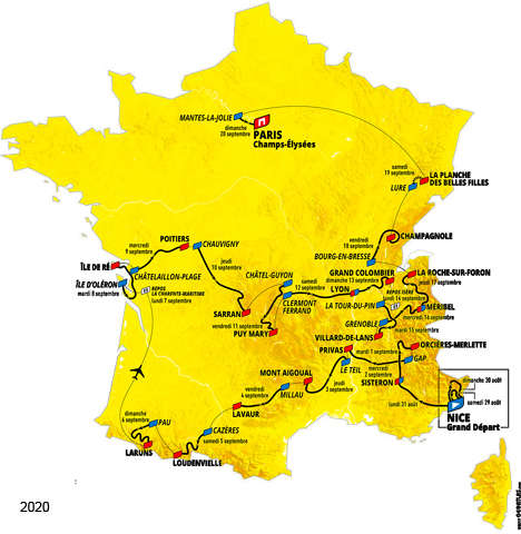 Le Tour de France initialement prévu du 27 juin au 19 juillet est reporté du 29 août au 20 septembre pour cause de pandémie Covid-19. Il respectera néanmoins le parcours complet prévu ainsi que le profil des principales étapes.