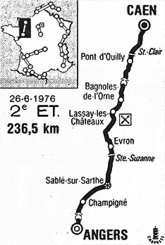 - La course s'anime au point-chaud de Sablé-sur-Sarthe que Maertens remporte. hauvieux et Teirlinck attaquent ensuite, en vain. Au km 70, Thorigné-en-Charmie, Roger Legeay démarre. Un moment accompagné de Caverzasi, il continue seul et au km 76, il possède 25" mais Menendez et Demeyer reviennent sur lui et ramènent le peloton.