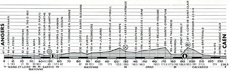 8h50 (Maine-et-Loire) : Angers (km 0) - D107 Cantenay-Épinard (km 5) - D191 Feneu (km 10.5) - D768 Champigné (km 21) - Contigné (km 29.5) - Miré (km 33) - (Mayenne) : St-Martin-Ville-Anglose - St-Denis d'Anjou (km 38.5) - (Sarthe) : D 309 Souvigné-sur-Sarthe (km 43.5) - Sablé-sur-Sarthe (km 49-sprint) - D24 Auvers-le-Hamon (km 57.5) - (Mayenne) : D7 Epineux-le-Seguin (km 62) - Thorignè-en-Charnie (km 70) - Côte de Sainte-Suzanne (km 82-GPM4) - Evron (km 89) - Mézangers (km 93.5) - Jublains (km 103) - D129 La Chapelle-au-Riboul (km 113) - Le Horps (km 123.5) - D34. Lassay-les-Châteaux (km 129.5-ravitaillement) - (Orne) : Couterne (km 140.5) - D335 Bagnoles-de-l'Orne (km 146.5) - D336 St-Michel-des-Andaines (km 150) - D53 La Sauvagère (km 155) - Bellou-en-Houlme (km 163.5) - D20 Ste-Opportune (km 171.5) - La Carneille (km 175) - D43 Taillebois (près de) (km 177.5) - Segrie-Fontaine (km 180.5) - Rouvrou - (Calvados) : Le Mesnil-Villemerit (km 185) - D167 Pont d'Ouilly (km 188.5) - D. 23. Côte de Saint-Clair (km 195-GPM4) - Bretteville-sur-Laize (km 211.5) - D235 Fontenay-le-Marmion (km 218) - D120 Ifs (km 224) - N158 Entrée boulevard périphérique (km 225.5) - Entrée viaduc Calix (km 230) - Caen / av. de la côte de Nacre (km 236.5).