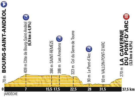 ![]() vendredi 15 juillet 2016 ![]() 9h45 (Ardèche) : D4 Bourg-Saint-Andéol (km 0) - Côte de Bourg-Saint-Andéol (km 7) - Beauregard (km 14) - Saint-Remèze (km 15.5) - D490 Les Arredons (km 18.5) - Col du Serre de Tourre (km 22.5) - D290 Chames (km 26) - Le Pont-d'Arc (km 28) - D390 Vallon-Pont-d'Arc (km 31.5) - D4 La caverne du Pont-d'Arc (km 37.5). ![]() ![]() ![]() Vidéo DailyMotion ![]() Étape : ![]() 1. Tom Dumoulin (Hol) en 50'15" (moy : 44.776 km/h) 2. Christopher Froome (Gbr) à 1'03" 3. Nelson Felipe Oliveira (Por) à 1'31" 4. Jérôme Coppel (Fra) à 1'35" 5. Rohan Dennis (Aus) à 1'41" 6. Bauke Mollema (Hol) à 1'54" 7. Geraint Thomas (Gbr) à 2'00" 8. Jon Izagirre (Esp) à 2'02" 9. Tony Martin (All) à 2'05" 10. Stephen Cummings (Gbr) à 2'24" 11. Jan Barta (Tch) à 2'31" 12. Maciej Bodnar (Pol) à 2'32" 13. Edvald Boasson Hagen (Nor) à 2'34" 14. Stef Clement (Hol) à 2'38" 15. Alejandro Valverde (Esp) à 2'48" 16. Tejay Van Garderen (Usa) à 2'50" 17. Luke Durbridge (Aus) à 3'01" 18. Adam Yates (Gbr) 19. Ilnur Zakarin (Rus) à 3'07" 20. Nairo Alexander Quintana (Col) à 3'08" 21. Richie Porte (Aus) 22. Roman Kreuziger (Tch) à 3'13" 23. Fabian Cancellara (Sui) à 3'15" 24. Anthony Roux (Fra) à 3'23" 25. Vincenzo Nibali (Ita) à 3'29" 26. Ruben Plaza (Esp) à 3'35" 27. Alexey Lutsenko (Kaz) à 3'41" 28. Romain Sicard (Fra) à 3'48" 29. Sylvain Chavanel (Fra) à 3'52" 30. Romain Bardet (Fra) 31. Jérémy Roy (Fra) à 4'06" 32. Thomas De Gendt (Bel) à 4'08" 33. Daniel Martin (Irl) à 4'10" 34. Anthony Delaplace (Fra) à 4'17" 35. Louis Meintjes (Afs) à 4'22" 36. Alexis Gougeard (Fra) 37. Fabio Aru (Ita) à 4'25" 38. Andriy Grivko (Ukr) à 4'29" 39. Jarlinson Pantano (Col) à 4'38" 40. Sébastien Reichenbach (Sui) à 4'42" 41. Sep Vanmarcke (Bel) à 4'43" 42. Joaquin Rodriguez (Esp) à 4'46" 43. Georg Preidler (Aut) à 4'49" 44. Sergio Luis Henao (Col) à 4'52" 45. Wilco Kelderman (Hol) à 4'57" 46. Warren Barguil (Fra) à 4'58" 47. Martin Elmiger (Sui) à 5'06" 48. Jan Polanc (Slo) à 5'10" 49. Vegard Breen (Nor) à 5'11" 50. Diego Rosa (Ita) à 5'23" 51. Damiano Caruso (Ita) 52. Reto Hollenstein (Sui) à 5'26" 53. Michael Albasini (Sui) à 5'27" 54. Mikel Landa (Esp) à 5'30" 55. Pierre-Luc Périchon (Fra) à 5'31" 56. Emanuel Buchmann (All) à 5'32" 57. Ramunas Navardauskas (Lit) à 5'37" 58. Timo Roosen (Hol) à 5'40" 59. Dylan Van Baarle (Hol) à 5'41" 60. Daryl Impey (Afs) à 5'43" 61. Michael Schär (Sui) à 5'49" 62. Nicolas Edet (Fra) à 5'50" 63. Oscar Gatto (Ita) 64. Tanel Kangert (Est) à 5'51" 65. Oliver Naesen (Bel) à 5'52" 66. Thomas Voeckler (Fra) à 5'55" 67. Florian Vachon (Fra) 68. Pierre Rolland (Fra) à 5'56" 69. Michael Valgren Andersen (Dan) à 6'01" 70. Paul Martens (All) à 6'04" 71. Brice Feillu (Fra) à 6'06" 72. Imanol Erviti (Esp) à 6'08" 73. Luis Leon Sanchez (Esp) 74. Jérôme Cousin (Fra) à 6'13" 75. Iljo Keisse (Bel) à 6'14" 76. Haimar Zubeldia (Esp) à 6'15" 77. Rui Alberto Costa (Por) 78. Peter Sagan (Svq) à 6'17" 79. Daniel Teklehaimanot (Ery) à 6'20" 80. Tony Gallopin (Fra) à 6'21" 81. Greg Van Avermaet (Bel) à 6'22" 82. Arthur Vichot (Fra) à 6'23" 83. Alexis Vuillermoz (Fra) 84. Brent Bookwalter (Usa) à 6'32" 85. Luis Angel Mate (Esp) 86. Paolo Tiralongo (Ita) à 6'33" 87. Angel Vicioso (Esp) à 6'34" 88. Gregory Henderson (Nzl) 89. Jan Bakelants (Bel) 90. Fabrice Jeandesboz (Fra) à 6'40" 91. Jasper Stuyven (Bel) à 6'41" 92. Ben Gastauer (Lux) à 6'43" 93. Domenico Pozzovivo (Ita) à 6'47" 94. Mikel Nieve (Esp) à 6'48" 95. Wouter Poels (Hol) à 6'49" 96. Kristijan Durasek (Cro) 97. Steve Morabito (Sui) à 6'51" 98. William Bonnet (Fra) à 6'57" 99. Adrien Petit (Fra) à 7'00" 100. Jurgen Roelandts (Bel) à 7'05" 101. Fabio Sabatini (Ita) à 7'07" 102. Bartosz Huzarski (Pol) à 7'09" 103. Samuel Dumoulin (Fra) à 7'11" 104. Fränk Schleck (Lux) 105. Matteo Tosatto (Ita) 106. Julian Alaphilippe (Fra) à 7'15" 107. Gorka Izagirre (Esp) 108. Antoine Duchesne (Can) à 7'19" 109. Bert-Jan Lindeman (Hol) à 7'20" 110. Andreas Schillinger (All) 111. Peter Stetina (Usa) à 7'21" 112. Mikaël Chérel (Fra) à 7'22" 113. Marcel Sieberg (All) 114. Robert Wagner (All) à 7'25" 115. Eduardo Sepulveda (Arg) à 7'27" 116. Simon Geschke (All) 117. Jakob Fuglsang (Dan) à 7'28" 118. Sondre Holst Enger (Nor) à 7'30" 119. Mathew Hayman (Aus) à 7'33" 120. Vasil Kiryienka (Blr) 121. Rafal Majka (Pol) 122. Markel Irizar (Esp) à 7'39" 123. Tom-Jelte Slagter (Hol) à 7'41" 124. Arnold Jeannesson (Fra) 125. Reinardt Janse Van Rensburg (Afs) à 7'47" 126. Natnael Berhane (Ery) à 7'48" 127. Winner Andrew Anacona (Col) 128. Jens Debusschere (Bel) à 7'50" 129. Daniel Moreno (Esp) 130. Dylan Groenewegen (Hol) à 7'51" 131. Serge Pauwels (Bel) à 7'52" 132. Tsgabu Gebremaryam Grmay (Eth) 133. Christophe Laporte (Fra) à 7'54" 134. Michael Matthews (Aus) à 7'56" 135. Ian Stannard (Gbr) à 7'58" 136. Alberto Losada (Esp) 137. Bryan Coquard (Fra) à 8'01" 138. Laurens Ten Dam (Hol) à 8'07" 139. Cyril Gautier (Fra) à 8'08" 140. André Greipel (All) à 8'11" 141. Daniel Navarro (Esp) à 8'14" 142. Marcus Burghardt (All) à 8'16" 143. Albert Timmer (Hol) à 8'18" 144. Paul Voss (All) à 8'21" 145. Lawson Craddock (Usa) à 8'23" 146. Ramon Sinkeldam (Hol) à 8'26" 147. Jesus Herrada (Esp) 148. Alex Howes (Usa) à 8'31" 149. Alexander Kristoff (Nor) 149. Marcel Kittel (All) 151. Maarten Wynants (Bel) à 8'32" 152. John Degenkolb (All) à 8'34" 153. Robert Kiserlovski (Cro) à 8'36" 154. Luke Rowe (Gbr) 155. Luka Pibernik (Slo) à 8'37" 156. Geoffrey Soupe (Fra) 157. Amaël Moinard (Fra) à 8'38" 158. Petr Vakoc (Tch) 159. Patrick Konrad (Aut) à 8'39" 160. Sam Bennett (Irl) à 8'40" 161. Ariel Maximiliano Richeze (Arg) à 8'42" 162. Jacopo Guarnieri (Ita) à 8'43" 163. Adam Hansen (Aus) à 8'50" 164. Matti Breschel (Dan) à 8'52" 165. Christopher Juul Jensen (Dan) 166. Grégory Rast (Sui) à 8'55" 167. Yukiya Arashiro (Jap) à 8'59" 168. Julien Verm