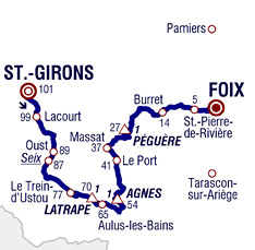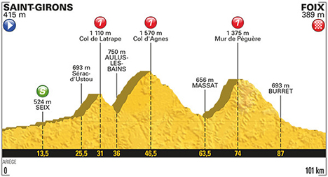 ![]() vendredi 14 juillet 2017 ![]() 14h35 (Ariège) : Saint-Girons (km 0) - Lacourt (km 1.5) - Quercabanac (km 8) - Oust (près de) (km 11.5) - Seix (km 13.5-sprint) - Moulin Lauga (km 16) - Pont de la Taule (km 18) - La Bincarede (km 20) - La Pomarède (km 21) - Tourte (km 21.5) - Escots (km 22) - Le Trein d'Ustou (km 24) - Sérac d'Ustou (km 25.5) - Col de Latrape (km 31-GPM1) - Aulus-les-Bains (km 36) - Col d'Agnes (km 46.5-GPM1) - Etang de Lers (km 50.5) - D18 Courtal de Peyre Auselère (km 55) - Mouréou (km 58) - Le Port (km 60) - Massat (km 63.5) - D618 Espiès (km 67) - Col del Four (km 68.5) - Bomprat (km 69.5) - Col des Caougnous (km 70.5) - D17 Mur de Péguère (km 74-GPM1) - Col de Jouels (km 78.5) - Col des Marrous (km 82) - Burret (km 87) - La Mouline (km 91.5) - La Coupière (km 92.5) - Gaynes (km 93.5) - St Pierre de Rivière (km 95.5) - Mouragues (km 97) - Foix / entrée (km 99.5) - Foix / allée de Villote (km 101). ![]() ![]() ![]() Vidéo DailyMotion ![]() Étape : ![]() 1. Warren Barguil (Fra) en 2h36'29" (moy : 38.726 km/h) 2. Nairo Quintana (Col) 3. Alberto Contador (Esp) 4. Mikel Landa (Esp) à 2" 5. Simon Yates (Gbr) à 1'39" 6. Daniel Martin (Irl) 7. Michal Kwiatkowski (Pol) à 1'48" 8. Christopher Froome (Gbr) 9. Fabio Aru (Ita) 10. Rigoberto Uran (Col) 11. Romain Bardet (Fra) 12. Louis Meintjes (Afs) 13. Carlos Betancur (Col) à 4'08" 14. Diego Ulissi (Ita) 15. Pierre Latour (Fra) 16. Serge Pauwels (Bel) 17. Alexis Vuillermoz (Fra) 18. Damiano Caruso (Ita) 19. Guillaume Martin (Fra) 20. Emanuel Buchmann (All) 21. Mikel Nieve (Esp) 22. George Bennett (Nzl) 23. Pierre Luc Périchon (Fra) à 5'56" 24. Tony Gallopin (Fra) 25. Daniel Navarro (Esp) 26. Jonathan Castroviejo (Esp) 27. Romain Sicard (Fra) à 5'59" 28. Greg Van Avermaet (Bel) 29. Primoz Roglic (Slo) 30. Roman Kreuziger (Tch) 31. Maxime Bouet (Fra) à 7'59" 32. Brice Feillu (Fra) 33. Andrey Zeits (Kaz) 34. Romain Hardy (Fra) 35. Thomas Degand (Bel) 36. Amael Moinard (Fra) 37. Darwin Atapuma (Col) 38. Kristijan Durasek (Cro) 39. Bauke Mollema (Hol) 40. Ben Gastauer (Lux) 41. Sylvain Chavanel (Fra) 42. Cyril Gautier (Fra) à 14'20" 43. Frederik Backaert (Bel) 44. Marco Minnaard (Hol) 45. Axel Domont (Fra) 46. Thomas De Gendt (Bel) 47. Oliver Naesen (Bel) 48. Alberto Bettiol (Ita) 49. Javier Moreno (Esp) 50. Gianluca Brambilla (Ita) 51. Jan Bakelants (Bel) 52. Simon Geschke (All) 53. Tiesj Benoot (Bel) 54. Sergio Henao (Col) 55. Ondrej Cink (Tch) 56. Vasil Kiryienka (Blr) 57. Nicolas Roche (Irl) 58. Haimar Zubeldia (Esp) 59. Lilian Calmejane (Fra) 60. Robert Kiserlovski (Cro) 61. Esteban Chaves (Col) 62. Janez Brajkovic (Slo) 63. Alessandro De Marchi (Ita) 64. Maurits Lammertink (Hol) à 15'41" 65. Adrien Petit (Fra) 66. Guillaume Van Keirsbulck (Bel) 67. Tsgabu Grmay (Eth) 68. Adam James Hansen (Aus) 69. Michael Valgren Andersen (Dan) 70. Roy Curvers (Hol) 71. Jasha Sütterlin (All) 72. Mike Teunissen (Hol) 73. Michael Schär (Sui) 74. Scott Thwaites (Gbr) 75. Marco Haller (Aut) 76. Nils Politt (All) 77. Nikias Arndt (All) 78. Rudy Molard (Fra) 79. Yoann Offredo (Fra) 80. Nicolas Edet (Fra) 81. Daryl Impey (Afs) 82. Tony Martin (All) 83. Pieter Vanspeybrouck (Bel) 84. Jay McCarthy (Aus) 85. Patrick Bevin (Nzl) 86. Laurens Ten Dam (Hol) 87. Dylan Van Baarle (Hol) 88. Christian Knees (All) 89. Andrew Talansky (Usa) 90. Reto Hollenstein (Sui) 91. Paul Martens (All) 92. Imanol Erviti (Esp) 93. Elie Gesbert (Fra) 94. Perrig Quemeneur (Fra) 95. Yohann Gene (Fra) 96. Andrey Amador (Crc) 97. Dion Smith (Nzl) 98. Mathias Frank (Sui) 99. Angelo Tulik (Fra) 100. Thomas Voeckler (Fra) 101. Thibaut Pinot (Fra) 102. Yukiya Arashiro (Jap) 103. Damien Howson (Aus) 104. Simon Clarke (Aus) 105. Luis Angel Mate (Esp) 106. Marco Marcato (Ita) 107. Eduardo Sepulveda (Arg) 108. Grega Bole (Slo) 109. Tiago Machado (Por) 110. Koen De Kort (Hol) 111. Jarlinson Pantano (Col) 112. Alexander Kristoff (Nor) 113. Christophe Laporte (Fra) 114. Stefan Küng (Sui) 115. Jesus Herrada (Esp) 116. Julien Vermote (Bel) 117. Dmitriy Gruzdev (Kaz) 118. Nathan Brown (Usa) 119. Philippe Gilbert (Bel) 120. Danilo Wyss (Sui) 121. Andrea Pasqualon (Ita) 122. Jens Keukeleire (Bel) 123. Rick Zabel (All) 124. Timo Roosen (Hol) 125. Michael Albasini (Sui) 126. Zdenek Stybar (Tch) 127. Edvald Boasson Hagen (Nor) 128. Sonny Colbrelli (Ita) 129. Daniele Bennati (Ita) 130. Maciej Bodnar (Pol) 131. Ben Swift (Gbr) 132. Julien Simon (Fra) 133. Borut Bozic (Slo) 134. Matteo Bono (Ita) 135. Michael Gogl (Aut) 136. Bakhtiyar Kozhatayev (Kaz) 137. Vegard Stake Laengen (Nor) 138. Michael Matthews (Aus) 139. Markel Irizar (Esp) 140. Albert Timmer (Hol) à 15'56" 141. Dimitri Claeys (Bel) 142. Laurent Pichon (Fra) 143. Thomas Boudat (Fra) 144. Florian Vachon (Fra) 145. Jaco Venter (Afs) à 19'24" 146. Davide Cimolai (Ita) 147. Nacer Bouhanni (Fra) 148. Luke Rowe (Gbr) 149. Thomas Leezer (Hol) 150. Mathew Hayman (Aus) 151. Olivier Le Gac (Fra) 152. Rüdiger Selig (All) 153. John Degenkolb (All) 154. Cyril Lemoine (Fra) 155. Reinardt Janse Van Rensburg (Afs) 156. Alexey Lutsenko (Kaz) à 19'43" 157. Tim Wellens (Bel) à 21'05" 158. Ramon Sinkeldam (Hol) 159. Pawel Poljanski (Pol) 160. André Greipel (All) 161. Fabio Sabatini (Ita) 162. Pierre Rolland (Fra) 163. Marcel Sieberg (All) 164. Lars Ytting Bak (Dan) 165. Marcus Burghardt (All) 166. Bernhard Eisel (Aut) 167. Marcel Kittel (All) 168. Robert Wagner (All) 169. Stephen Cummings (Gbr) 170. Jack Bauer (Nzl) 171. Taylor Phinney (Usa) 172. Jurgen Roelandts (Bel) 173. Daniel McLay (Gbr) 174. Andriy Grivko (Ukr) 175. Florian Senechal (Fra) 176. Dylan Groenewegen (Hol) 177. Fabio Felline (Ita) à 27'10" Abandons : Arthur Vichot (Fra) Jakob Fuglsang (Dan) Prix de la combativité : Alberto Contador (Esp) Classement général : ![]() 1. Fabio Aru (Ita) en 55h30'06" 2. Christopher Froome (Gbr) à 6" 3. Romain Bardet (Fra) à 25" 4. Rigoberto Uran (Col) à 35" 5. Mikel Landa (Esp) à 1'09" 6. Daniel Martin (Irl) à 1'32" 7. S