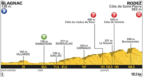 ![]() samedi 15 juillet 2017 ![]() 13h20 (Haute-Garonne) : D2 Blagnac (km 0) - Grenade (km 7.5) - Ondes (km 10.5) - D29 Castelnau d'Estrétefonds (km 14) - Villeneuve lès Bouloc (km 19) - Moulin de Pinel (km 27.5) - D15 Villariès (km 29) - Bessières (km 41) - D630 Buzet-sur-Tarn (km 45.5) - (Tarn) : St-Sulpice-la-Pointe (près de) (km 48.5) - D988 Rabastens (km 55.5-sprint) - Lisle-sur-Tarn (km 64) - Gaillac (km 71.5) - Senouillac (près de) (km 81.5) - Le Ceyriesset (km 84.5) - Cestayrols (km 87.5) - Villeneuve-sur-Vère (km 92.5) - Blaye-les-Mines (km 102) - Carmaux (km 107) - La Croix de Mille (km 116.5) - Graummont (km 118) - Tanus (km 123.5) - (Aveyron) : D888 Côte du viaduc de Viaur (km 131-GPM3) - Les Peyronies (km 134.5) - Naucelles / gare (km 137.5) - D10 Les Fourques (km 139) - La Croix Rouge (km 140) - Le Navech (km 142.5) - L'Estoulette (km 143.5) - Centrès - Côte de Centrès (km 145-GMP3) - D83 Magrinet (km 147.5) - La Pierre Plantée (km 148.5) - Les Garroustes (km 149.5) - La Tronque (km 152.5) - Le Caucart (km 153.5) - Tonkin (km 156.5) - D617 La Pendarie (km 158.5) - D902 Pont de Grandfuel (km 161.5) - La Burgayrolle (km 162.5) - Le Devez (km 169.5) - La Primaube (km 170.5) - D888 La Boissonade (km 174.5) - La Mouline (km 176) - D212 Le Lachet (km 176.5) - Olemps (près de) (km 177.5) - La Mouline (km 178) - Rodez / entrée (km 179) - Rodez / côte de l'Av. de Saint-Pierre (km 181.5). ![]() ![]() ![]() Vidéo DailyMotion ![]() Étape : ![]() 1. Michael Matthews (Aus) en 4h21'56" (moy : 41.575 km/h) 2. Greg Van Avermaet (Bel) 3. Edvald Boasson Hagen (Nor) à 1" 4. Philippe Gilbert (Bel) 5. Jay McCarthy (Aus) 6. Sonny Colbrelli (Ita) 7. Christopher Froome (Gbr) 8. Daniel Martin (Irl) 9. Rigoberto Uran (Col) 10. Tiesj Benoot (Bel) à 5" 11. Romain Bardet (Fra) 12. Zdenek Stybar (Tch) 13. Simon Yates (Gbr) 14. Jan Bakelants (Bel) 15. Paul Martens (All) 16. Davide Cimolai (Ita) à 12" 17. Nacer Bouhanni (Fra) 18. Simon Clarke (Aus) 19. Marco Marcato (Ita) à 15" 20. Mikel Landa (Esp) 21. Lilian Calmejane (Fra) à 20" 22. Damiano Caruso (Ita) 23. Nairo Quintana (Col) à 22" 24. Alberto Contador (Esp) 25. George Bennett (Nzl) 26. Oliver Naesen (Bel) à 25" 27. Gianluca Brambilla (Ita) 28. Louis Meintjes (Afs) 29. Emanuel Buchmann (All) 30. Fabio Aru (Ita) 31. Alexis Vuillermoz (Fra) 32. Daryl Impey (Afs) 33. Laurent Pichon (Fra) 34. Sylvain Chavanel (Fra) 35. Romain Hardy (Fra) 36. John Degenkolb (All) à 30" 37. Carlos Betancur (Col) 38. Sergio Henao (Col) 39. Pierre Latour (Fra) 40. Marco Minnaard (Hol) 41. Guillaume Martin (Fra) à 33" 42. Alexander Kristoff (Nor) 43. Angelo Tulik (Fra) 44. Tony Gallopin (Fra) à 43" 45. Brice Feillu (Fra) à 47" 46. Serge Pauwels (Bel) 47. Ben Swift (Gbr) à 49 48. Frederik Backaert (Bel) à 52" 49. Pawel Poljanski (Pol) 50. Bauke Mollema (Hol) 51. Nikias Arndt (All) 52. Warren Barguil (Fra) 53. Dion Smith (Nzl) 54. Adam James Hansen (Aus) 55. Julien Vermote (Bel) à 57" 56. Cyril Gautier (Fra) à 59" 57. Mathias Frank (Sui) 58. Jens Keukeleire (Bel) à 1'10" 59. Nils Politt (All) 60. Diego Ulissi (Ita) 61. Marcus Burghardt (All) 62. Andrey Zeits (Kaz) à 1'14" 63. Maxime Bouet (Fra) à 1'15" 64. Nathan Brown (Usa) 65. Thomas Degand (Bel) 66. Ben Gastauer (Lux) 67. Axel Domont (Fra) 68. Haimar Zubeldia (Esp) 69. Darwin Atapuma (Col) 70. Mikel Nieve (Esp) 71. Tiago Machado (Por) 72. Thibaut Pinot (Fra) à 1'22" 73. Daniele Bennati (Ita) à 1'25" 74. Pierre Luc Périchon (Fra) à 1'27" 75. Rudy Molard (Fra) à 1'32" 76. Olivier Le Gac (Fra) à 1'34" 77. Maciej Bodnar (Pol) 78. Tony Martin (All) 79. Koen De Kort (Hol) 80. Roman Kreuziger (Tch) 81. Robert Kiserlovski (Cro) à 1'43" 82. Kristijan Durasek (Cro) 83. Michael Albasini (Sui) à 1'45" 84. Esteban Chaves (Col) à 1'57" 85. Michal Kwiatkowski (Pol) à 1'59" 86. Scott Thwaites (Gbr) à 2'03" 87. Michael Schär (Sui) 88. Christophe Laporte (Fra) à 2'06" 89. Jack Bauer (Nzl) à 2'18" 90. Thomas De Gendt (Bel) 91. Michael Valgren Andersen (Dan) 92. Reinardt Janse Van Rensburg (Afs) à 2'23" 93. Tsgabu Grmay (Eth) à 2'26" 94. Stefan Küng (Sui) à 2'27" 95. Cyril Lemoine (Fra) à 2'31" 96. Maurits Lammertink (Hol) à 2'46" 97. Andrey Amador (Crc) à 3'04" 98. Alberto Bettiol (Ita) à 3'09" 99. Jesus Herrada (Esp) 100. Vasil Kiryienka (Blr) à 3'19" 101. Jaco Venter (Afs) à 5'26" 102. Reto Hollenstein (Sui) à 6'04" 103. Simon Geschke (All) à 6'28" 104. Danilo Wyss (Sui) 105. Timo Roosen (Hol) 106. Florian Vachon (Fra) 107. Luke Rowe (Gbr) 108. Janez Brajkovic (Slo) 109. Alexey Lutsenko (Kaz) 110. Thomas Leezer (Hol) 111. Thomas Voeckler (Fra) 112. Nicolas Roche (Irl) 113. Yohann Gene (Fra) 114. Thomas Boudat (Fra) à 6'57" 115. Dylan Van Baarle (Hol) à 8'00" 116. Laurens Ten Dam (Hol) à 11'05" 117. Mike Teunissen (Hol) 118. Yukiya Arashiro (Jap) à 12'03" 119. Markel Irizar (Esp) 120. Julien Simon (Fra) 121. Alessandro De Marchi (Ita) à 12'16" 122. André Greipel (All) à 13'17" 123. Ramon Sinkeldam (Hol) 124. Bernhard Eisel (Aut) 125. Marcel Sieberg (All) 126. Adrien Petit (Fra) 127. Guillaume Van Keirsbulck (Bel) 128. Jasha Sütterlin (All) 129. Rick Zabel (All) 130. Patrick Bevin (Nzl) 131. Rüdiger Selig (All) 132. Lars Ytting Bak (Dan) 133. Fabio Sabatini (Ita) 134. Matteo Bono (Ita) 135. Luis Angel Mate (Esp) 136. Robert Wagner (All) 137. Roy Curvers (Hol) 138. Nicolas Edet (Fra) 139. Vegard Stake Laengen (Nor) 140. Damien Howson (Aus) 141. Primoz Roglic (Slo) 142. Imanol Erviti (Esp) 143. Jonathan Castroviejo (Esp) 144. Yoann Offredo (Fra) 145. Elie Gesbert (Fra) 146. Javier Moreno (Esp) 147. Eduardo Sepulveda (Arg) 148. Christian Knees (All) 149. Daniel Navarro (Esp) 150. Andriy Grivko (Ukr) 151. Perrig Quemeneur (Fra) 152. Florian Senechal (Fra) 153. Dimitri Claeys (Bel) 154. Ondrej Cink (Tch) 155. Andrea Pasqualon (Ita) 156. Jurgen Roelandts (Bel) 157. Grega Bole (Slo) 158. Michael Gogl (Aut) 159. Jarlinson Pantano (Col) 160. Bakhtiyar Kozhatayev (Kaz) 161. Dylan Groen