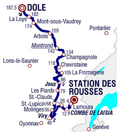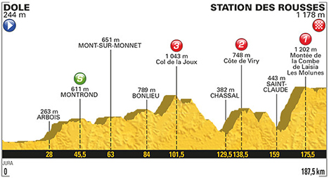 ![]() samedi 8 juillet 2017 ![]() 12h25 (Jura) : Dôle (km 0) - Augerans (km 8) - Belmont (km 9) - D91 Mont-sous-Vaudrey (km 13) - Vaudrey (km 14.5) - La Ferté (km 19.5) - Mathenay (km 21.5) - Arbois (km 28) - Belvédère du Fer à cheval (km 37) - N5 Montrond (km 45.5-sprint) - Champagnole (km 53) - D471 Ney (km 57) - Mont-sur-Monnet (km 63) - Saffloz (km 68) - D90 Fontenau (près de) (km 71.5) - Songeson (km 73.5) - Ménétrux-en-Joux (km 77) - Ilay (km 82.5) - D75 Bonlieu (km 86-ravitaillement) - Crillat (km 92.5) - D28 Saint-Maurice (km 95) - Col de la Joux (km 101.5-GPM3) - Les Belbenoîts (km 104) - Prénovel (km 105) - Les Piards (km 108) - D146 Leschères (km 114) - D118 Saint-Lupicin (km 119.5) - Lavant-lès-Saint-Claude (km 122.5) - D436 Chassal (km 129.5) - Molinges (près de) (km 131.5) - D100 Côte de Viry (km 138.5-GPM2) - Viry (km 138.5) - Choux (km 143) - Vulvoz (km 148.5) - Larrivoire (km 152) - Chevry (km 157) - Saint-Claude (km 159) - D436 Rochefort (km 163.5) - L'Essard (km 164.5) - Montbrillant (km 165.5) - Les Moulins (km 169.5) - L'Évalide (km 170.5) - Montée de la Combe de Laisia / Les Molunes (km 175.5-GPM1) - Le Manon (km 178.5) - D436 Les Selmenbergs (km 182) - Lamoura (km 183.5) - D25 Les Rousses / rte de Prémanon (km 187.5). ![]() ![]() ![]() Vidéo DailyMotion ![]() Étape : ![]() 1. Lilian Calmejane (Fra) en 4h30'29" (moy : 41.592 km/h) 2. Robert Gesink (Hol) à 37" 3. Guillaume Martin (Fra) à 50" 4. Nicolas Roche (Irl) 5. Roman Kreuziger (Tch) 6. Fabio Aru (Ita) 7. Michael Valgren Andersen (Dan) 8. Rafal Majka (Pol) 9. Nathan Brown (Usa) 10. Romain Hardy (Fra) 11. Carlos Betancur (Col) 12. Louis Meintjes (Afs) 13. Daniel Martin (Irl) 14. Emanuel Buchmann (All) 15. Mikel Landa (Esp) 16. Damiano Caruso (Ita) 17. Richie Porte (Aus) 18. Christopher Froome (Gbr) 19. George Bennett (Nzl) 20. Nairo Quintana (Col) 21. Esteban Chaves (Col) 22. Brice Feillu (Fra) 23. Pierre Latour (Fra) 24. Thomas Degand (Bel) 25. Jakob Fuglsang (Dan) 26. Alexis Vuillermoz (Fra) 27. Romain Bardet (Fra) 28. Daniel Navarro (Esp) 29. Simon Yates (Gbr) 30. Alberto Contador (Esp) 31. Jonathan Castroviejo (Esp) 32. Eduardo Sepulveda (Arg) 33. Geraint Thomas (Gbr) 34. Rigoberto Uran (Col) 35. Pierre Rolland (Fra) 36. Andrew Talansky (Usa) 37. Mikel Nieve (Esp) 38. Sergio Henao (Col) 39. Haimar Zubeldia (Esp) 40. Serge Pauwels (Bel) 41. Pawel Poljanski (Pol) à 56" 42. Tony Gallopin (Fra) à 1'59" 43. Luis Angel Mate (Esp) à 2'25" 44. Alexey Lutsenko (Kaz) à 6'59" 45. Jarlinson Pantano (Col) 46. Andrey Zeits (Kaz) à 8'47" 47. Warren Barguil (Fra) 48. Arthur Vichot (Fra) à 9'34" 49. Marco Minnaard (Hol) 50. Jay McCarthy (Aus) 51. Yoann Offredo (Fra) 52. Janez Brajkovic (Slo) 53. Robert Kiserlovski (Cro) 54. Ondrej Cink (Tch) 55. Mathias Frank (Sui) 56. Axel Domont (Fra) 57. Jan Bakelants (Bel) 58. Sylvain Chavanel (Fra) 59. Simon Clarke (Aus) 60. Tiago Machado (Por) à 13'12" 61. Amael Moinard (Fra) 62. Greg Van Avermaet (Bel) 63. Damien Howson (Aus) 64. Jens Keukeleire (Bel) 65. Dylan Van Baarle (Hol) à 13'28" 66. Gianluca Brambilla (Ita) 67. Oliver Naesen (Bel) 68. Tiesj Benoot (Bel) 69. Cyril Gautier (Fra) 70. Angelo Tulik (Fra) 71. Rudy Molard (Fra) 72. Bauke Mollema (Hol) 73. Laurens Ten Dam (Hol) 74. Ben Gastauer (Lux) 75. Perrig Quemeneur (Fra) à 15'14" 76. Thibaut Pinot (Fra) 77. Thomas De Gendt (Bel) 78. Adam James Hansen (Aus) 79. Michael Gogl (Aut) à 16'52" 80. Maxime Bouet (Fra) 81. Michael Schär (Sui) à 17'15" 82. Nils Politt (All) 83. Koen De Kort (Hol) à 20'56" 84. Fabio Felline (Ita) 85. Alberto Bettiol (Ita) 86. Nikias Arndt (All) 87. Julien Vermote (Bel) 88. Rick Zabel (All) 89. Michal Kwiatkowski (Pol) 90. Nicolas Edet (Fra) 91. Zdenek Stybar (Tch) 92. Dario Cataldo (Ita) 93. Paul Martens (All) 94. Marco Haller (Aut) 95. Diego Ulissi (Ita) 96. Maurits Lammertink (Hol) 97. Jurgen Roelandts (Bel) 98. Pieter Vanspeybrouck (Bel) 99. Kristijan Durasek (Cro) 100. Florian Vachon (Fra) 101. Manuele Mori (Ita) 102. Matteo Bono (Ita) 103. Pierre Luc Périchon (Fra) 104. Tsgabu Grmay (Eth) 105. Michael Albasini (Sui) 106. Darwin Atapuma (Col) 107. Stefan Küng (Sui) 108. Laurent Pichon (Fra) 109. Cyril Lemoine (Fra) 110. Andrey Amador (Crc) 111. Bakhtiyar Kozhatayev (Kaz) 112. Ben Swift (Gbr) 113. Daryl Impey (Afs) 114. John Degenkolb (All) 115. Scott Thwaites (Gbr) 116. Vegard Stake Laengen (Nor) 117. Patrick Bevin (Nzl) 118. Danilo Wyss (Sui) 119. Maciej Bodnar (Pol) 120. Edvald Boasson Hagen (Nor) 121. Mike Teunissen (Hol) 122. Primoz Roglic (Slo) 123. Michael Matthews (Aus) 124. Javier Moreno (Esp) 125. Dmitriy Gruzdev (Kaz) 126. Alessandro De Marchi (Ita) 127. Jesus Herrada (Esp) 128. Philippe Gilbert (Bel) à 24'29" 129. Frederik Backaert (Bel) 130. Marcus Burghardt (All) 131. Jasha Sütterlin (All) 132. Imanol Erviti (Esp) 133. Mathew Hayman (Aus) 134. Matteo Trentin (Ita) à 27'26" 135. Grega Bole (Slo) à 27'49" 136. Romain Sicard (Fra) à 28'30" 137. Dion Smith (Nzl) à 31'34" 138. Jack Bauer (Nzl) 139. Fabio Sabatini (Ita) 140. Christian Knees (All) 141. Marcel Sieberg (All) 142. Reto Hollenstein (Sui) 143. Yukiya Arashiro (Jap) 144. Yohann Gene (Fra) 145. Nacer Bouhanni (Fra) 146. Elie Gesbert (Fra) 147. Adrien Petit (Fra) 148. Markel Irizar (Esp) 149. Dimitri Claeys (Bel) 150. Marcel Kittel (All) 151. Lars Ytting Bak (Dan) 152. André Greipel (All) 153. Thomas Boudat (Fra) 154. Bernhard Eisel (Aut) 155. Andriy Grivko (Ukr) 156. Julien Simon (Fra) 157. Robert Wagner (All) 158. Thomas Leezer (Hol) 159. Rüdiger Selig (All) 160. Sonny Colbrelli (Ita) 161. Tony Martin (All) 162. Daniele Bennati (Ita) 163. Andrea Pasqualon (Ita) 164. Borut Bozic (Slo) 165. Marco Marcato (Ita) 166. Guillaume Van Keirsbulck (Bel) 167. Jaco Venter (Afs) 168. Reinardt Janse Van Rensburg (Afs) 169. Thomas Voeckler (Fra) 170. Olivier Le Gac (Fra) 171. Davide Cimolai (Ita) 172. Christophe Laporte (Fra) 173. Florian Senechal (Fra) 174. Ramon Sinkeldam (Hol) 175. Albert Timmer (Hol) 176