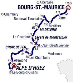 ![]() jeudi 19 juillet 2018 ![]() (Savoie) : Bourg-Saint-Maurice (km 0) - Le Gothard (km 0.5) - Aime (km 4.5) - Saint-Marcel (près de) (km 14.5) - Moûtiers (km 19) - Aigueblanche (km 21.5) - D94 Bellecombe (km 22.5) - D97 Petit Cœur (km 25.5) - Notre-Dame de Briançon (km 27) - D213 Bonneval-Tarentaise (km 36) - La Thuile (km 42) - La Chapelle (km 43) - Celliers Dessus (km 44) - Col de La Madeleine (km 53.5-GPM HC) - Les Pérelles (km 57.5) - Longchamp 1650 (km 58.5) - Les Longes (km 59.5) - Saint-François-Longchamp (km 61.5) - L'Épalud (km 62) - Le Planet (km 63) - Colombin (km 66.5) - Maisons Puges (km 68.5) - La Côte (km 69) - Saint-Martin-sur-la-Chambre (km 71) - La Chambre (km 72.5) - Saint-Avre (km 73.5-ravitaillement) - D77B Pontamafrey (km 79.5) - Montvernier (km 82.5) - Lacets de Montvernier (km 83-GPM3) - Le Châtel (km 85) - Hermillon (km 88) - D906 Saint-Jean-de-Maurienne (km 91) - D926 Pierre Pin Dessous (km 96) - La Bettaz (km 96.5) - Le Crêt (km 97.5) - Charvin (km 99) - Les Chambons (km 110.5) - Cluny (km 112.5) - Malcrozet Belluard (km 112.5) - Saint-Sorlin-d'Arves (km 113) - Col de la Croix de Fer (km 121) - Col du Glandon (près de) (km 123.5) - Plan du Suel (km 124) - Rieu Claret (km 126.5) - (Isère) : Le Rivier d'Allemont (km 138.5) - Articol (km 142) - Le Verney (km 145.5) - Viaduc de l'Eau d'Olle (km 147.5) - Allemont (km 150) - Rochetaillée (km 153) - D1091 Les Sables (km 153.5) - La Paute (km 157) - Bourg d'Oisans (km 159) - D211 La Ferrière (km 162) - La Garde-en-Oisans (km 164) - Ribot d'En Bas (km 165.5) - Le Ribot (km 166.5) - Huez Village (km 170) - L'Alpe d'Huez/Av. du Rif-Nel (km 175.5-GPM HC). ![]() ![]() ![]() vidéo DailyMotion ![]() Étape : ![]() 1. Geraint Thomas (Gbr) en 5h18'37" 2. Tom Dumoulin (Hol) à 2" 3. Romain Bardet (Fra) à 3" 4. Chris Froome (Gbr) à 4" 5. Mikel Landa (Esp) à 7" 6. Primoz Roglic (Slo) à 13" 7. Vincenzo Nibali (Ita) 8. Jakob Fuglsang (Dan) à 42" 9. Nairo Quintana (Col) à 47" 10. Steven Kruijswijk (Hol) à 53" 11. Egan Bernal (Col) à 41" 12. Daniel Martin (Irl) à 45" 13. Bob Jungels (Lux) à 3'09" 14. Alejandro Valverde (Esp) à 4'29" 15. Ilnur Zakarin (Rus) 16. Pierre Latour (Fra) à 4'35" 17. Ion Izagirre (Esp) à 4'37" 18. Guillaume Martin (Fra) à 4'40" 19. Tanel Kangert (Est) à 5'41" 20. David Gaudu (Fra) à 6'52" 21. Robert Gesink (Hol) à 8'24" 22. Simon Geschke (All) à 8'58" 23. Daniel Navarro (Esp) à 9'33" 24. Mikel Nieve (Esp) à 9'57" 25. Pierre Rolland (Fra) à 10'59" 26. Warren Barguil (Fra) 27. Rafal Majka (Pol) à 15'09" 28. Laurens Ten Dam (Hol) à 15'39" 29. Oliver Naesen (Bel) à 22'21" 30. Maxime Bouet (Fra) 31. Arthur Vichot (Fra) 32. Rudy Molard (Fra) 33. Michael Schär (Sui) 34. Nicolas Edet (Fra) 35. Pavel Kochetkov (Rus) 36. Michael Valgren (Dan) 37. Tejay Van Garderen (Usa) 38. Antwan Tolhoek (Hol) 39. Bauke Mollema (Hol) 40. Wout Poels (Hol) 41. Mathias Frank (Sui) 42. Lawson Craddock (Usa) à 23'39" 43. Franco Pellizotti (Ita) à 23'52" 44. Greg Van Avermaet (Bel) à 24'25" 45. Daniel Martinez (Col) 46. Gorka Izagirre (Esp) 47. Rory Sutherland (Aus) à 25'20" 48. Serge Pauwels (Bel) à 25'55" 49. Jesper Hansen (Dan) à 26'22" 50. Jonathan Castroviejo (Esp) à 26'30" 51. Julien Vermote (Bel) 52. Stefan Küng (Sui) 53. Julien Bernard (Fra) à 26'39" 54. Thomas De Gendt (Bel) 55. Tom-Jelte Slagter (Hol) à 26'41" 56. Dimitri Claeys (Bel) 57. Philippe Gilbert (Bel) à 27'05" 58. Thomas Degand (Bel) 59. Damiano Caruso (Ita) 60. Paul Martens (All) 61. Sep Vanmarcke (Bel) à 27'09" 62. Tomasz Marczynski (Pol) à 27'11" 63. Koen de Kort (Hol) à 27'52" 64. Marco Minnaard (Hol) 65. Amund Grøndahl Jansen (Nor) 66. Kristijan Durasek (Cro) 67. Tobias Ludvigsson (Sue) à 28'54" 68. Laurent Pichon (Fra) 69. Dion Smith (Nzl) 70. Olivier Le Gac (Fra) 71. Damien Howson (Aus) 72. Michal Kwiatkowski (Pol) 73. Nikias Arndt (All) 74. Luke Rowe (Gbr) 75. Adam Yates (Gbr) 76. Patrick Bevin (Nzl) 77. Gianni Moscon (Ita) 78. Andrey Amador (Crc) 79. Simon Gerrans (Aus) 80. Edvald Boasson Hagen (Nor) 81. Imanol Erviti (Esp) 82. Jesus Herrada (Esp) 83. Daryl Impey (Afs) 84. Chad Haga (Usa) 85. Gregor Mühlberger (Aut) 86. Silvan Dillier (Sui) 87. Kevin Ledanois (Fra) 88. Guillaume Van Keirsbulck (Bel) 89. Marc Soler (Esp) 90. Toms Skujins (Let) 91. Jérôme Cousin (Fra) 92. Elie Gesbert (Fra) 93. Romain Sicard (Fra) 94. Amael Moinard (Fra) 95. Ian Boswell (Usa) 96. Lilian Calmejane (Fra) 97. Anthony Perez (Fra) 98. Julien Simon (Fra) 99. Yoann Offredo (Fra) 100. Julian Alaphilippe (Fra) à 29'11" 101. Søren Kragh Andersen (Dan) à 29'55" 102. Jasper Stuyven (Bel) à 31'19" 103. Lukas Pöstlberger (Aut) 104. Yves Lampaert (Bel) 105. Magnus Cort Nielsen (Dan) 106. Omar Fraile (Esp) 107. Marcus Burghardt (All) à 31'29" 108. Daniel Oss (Ita) 109. Peter Sagan (Slq) 110. Simon Clarke (Aus) 111. Daniele Bennati (Ita) à 31'33" 112. Jelle Vanendert (Bel) à 31'37" 113. Pawel Poljanski (Pol) 114. Reinardt Janse Van Rensburg (Afs) à 31'45" 115. Taylor Phinney (Usa) 116. Kristijan Koren (Slo) 117. Jay Thomson (Afs) 118. Darwin Atapuma (Col) 119. Maciej Bodnar (Pol) 120. Sylvain Chavanel (Fra) 121. Tim Declercq (Bel) à 32'02" 122. Alexander Kristoff (Nor) à 32'19" 123. Fabien Grellier (Fra) à 32'27" 124. Michael Gogl (Aut) à 32'41" 125. John Degenkolb (All) 126. Tom Scully (Nzl) à 32'48" 127. Andrea Pasqualon (Ita) à 32'54" 128. Anthony Turgis (Fra) 129. Sonny Colbrelli (Ita) à 33'02" 130. Domenico Pozzovivo (Ita) 131. Florian Vachon (Fra) 132. Heinrich Haussler (Aus) 133. Mathew Hayman (Aus) 134. Edward Theuns (Bel) 135. Thomas Boudat (Fra) à 33'32" 136. Nils Politt (All) à 33'56" 137. Jasper De Buyst (Bel) à 34'10" 138. Niki Terpstra (Hol) à 34'29" 139. Roberto Ferrari (Ita) à 34'44" 140. Arnaud Démare (Fra) à 34'58" 141. Damien Gaudin (Fra) 142. Christophe Laporte (Fra) à 35'05" 143. Timo Roosen (Hol) à 35'08" 144. Timothy Dupont (Bel) à 35'35" 145. Oliviero Troia (Ita) à 36'22" 146. Marco Marc