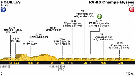 ![]() dimanche 29 juillet 2018 ![]() (Yvelines) : D308 Houilles (km 0) - Sartrouville (km 0.5) - Maisons-Laffitte (km 2.5) - D157 Le Mesnil-le-Roi (km 4.5) - Carrières-sous-Bois (km 6.5) - Saint-Germain-en-Laye (km 9.5) - D190 Poissy (km 13.5) - D30 Sainte-Gemme (près de) (km 22) - D74 Chavenay (km 26.5) - D97 Villepreux (km 85.5) - D161 Rennemoulin (km 33) - Noisy-le-Roi (près de) (km 34.5) - D307 Bailly (près de) (km 35.5) - Rocquencourt (km 39) - Le Chesnay (km 40) - La Celle-Saint-Cloud (km 40.5) - (Hauts-de-Seine) : D907 Vaucresson (km 42) - Marnes-la-Coquette (km 42.5) - Garches (km 45) - Saint-Cloud (km 45) - D985 Suresnes (km 48.5) - (Paris) : Porte Maillot (km 54) - Pl. Charles de Gaulle / Étoile (km 55.5) - Place de l'Alma (km 57) - Av. Montaigne (km 57) - Entrée circuit (km 57.5) - 1er passage (km 61.5) - 2ème passage (km 68) - 3ème passage (km 75) - Haut des Champs-Élysées (km 76/sprint) - 4ème passage (km 82) - 5ème passage (km 88.5) - 6ème passage (km 95.5) - 7ème passage (km 102.5) - 8ème Passage (km 109) - Paris/Champs-Élysées (km 116). ![]() ![]() ![]() vidéo DailyMotion ![]() Étape : ![]() 1. Alexander Kristoff (Nor) en 2h46'36" 2. John Degenkolb (All) 3. Arnaud Démare (Fra) 4. Edvald Boasson Hagen (Nor) 5. Christophe Laporte (Fra) 6. Maximiliano Richeze (Arg) 7. Sonny Colbrelli (Ita) 8. Peter Sagan (Slq) 9. Andrea Pasqualon (Ita) 10. Jasper De Buyst (Bel) 11. Timothy Dupont (Bel) 12. Thomas Boudat (Fra) 13. Sep Vanmarcke (Bel) 14. Magnus Cort Nielsen (Dan) 15. Oliver Naesen (Bel) 16. Daniele Bennati (Ita) 17. Nikias Arndt (All) 18. Edward Theuns (Bel) 19. Mathew Hayman (Aus) 20. Timo Roosen (Hol) 21. Daryl Impey (Afs) 22. Damiano Caruso (Ita) 23. Jasper Stuyven (Bel) 24. Dion Smith (Nzl) 25. Jérôme Cousin (Fra) 26. Alejandro Valverde (Esp) 27. Laurent Pichon (Fra) 28. Domenico Pozzovivo (Ita) 29. Primoz Roglic (Slo) 30. Yves Lampaert (Bel) 31. Pierre Latour (Fra) 32. Marco Minnaard (Hol) 33. Guillaume Martin (Fra) 34. Søren Kragh Andersen (Dan) 35. Yoann Offredo (Fra) 36. Tom Dumoulin (Hol) 37. Stefan Küng (Sui) 38. Lilian Calmejane (Fra) 39. Pavel Kochetkov (Rus) 40. Steven Kruijswijk (Hol) 41. Ilnur Zakarin (Rus) 42. Chad Haga (Usa) 43. Andrey Amador (Crc) 44. Jack Bauer (Nzl) 45. Mikel Landa (Esp) 46. Robert Gesink (Hol) 47. Julien Simon (Fra) 48. Greg Van Avermaet (Bel) 49. Michael Hepburn (Aus) 50. Maciej Bodnar (Pol) 51. Warren Barguil (Fra) 52. Nairo Quintana (Col) 53. Imanol Erviti (Esp) 54. Romain Bardet (Fra) 55. Mikel Nieve (Esp) 56. Antwan Tolhoek (Hol) 57. Simon Gerrans (Aus) 58. Rudy Molard (Fra) 59. Jonathan Castroviejo (Esp) 60. Julien Vermote (Bel) 61. Bob Jungels (Lux) 62. Roberto Ferrari (Ita) 63. Kristijan Durasek (Cro) 64. Jacopo Guarnieri (Ita) 65. Egan Bernal (Col) 66. Anthony Turgis (Fra) 67. Geraint Thomas (Gbr) 68. Daniel Martin (Irl) 69. Chris Froome (Gbr) 70. Marcus Burghardt (All) 71. Tanel Kangert (Est) à 24" 72. Maxime Bouet (Fra) 73. Marc Soler (Esp) 74. Thomas De Gendt (Bel) 75. Thomas Degand (Bel) 76. Heinrich Haussler (Aus) 77. Tom-Jelte Slagter (Hol) 78. Tomasz Marczynski (Pol) 79. Luke Rowe (Gbr) 80. Wout Poels (Hol) 81. Paul Martens (All) 82. Daniel Martinez (Col) 83. Daniel Navarro (Esp) 84. Fabien Grellier (Fra) 85. Tobias Ludvigsson (Sue) à 30" 86. Reinardt Janse Van Rensburg (Afs) 87. Mathias Frank (Sui) 88. David Gaudu (Fra) 89. Jakob Fuglsang (Dan) 90. Kevin Ledanois (Fra) 91. Pierre Rolland (Fra) 92. Kristijan Koren (Slo) 93. Pawel Poljanski (Pol) 94. Simon Clarke (Aus) 95. Jesper Hansen (Dan) 96. Tejay van Garderen (Usa) 97. Koen de Kort (Hol) 98. Ian Boswell (Usa) 99. Adam Yates (Gbr) 100. Nicolas Edet (Fra) 101. Ramon Sinkeldam (Hol) 102. Simon Geschke (All) 103. Jay Thomson (Afs) 104. Amund Grøndahl Jansen (Nor) 105. Julian Alaphilippe (Fra) 106. Sylvain Chavanel (Fra) 107. Laurens ten Dam (Hol) 108. Gorka Izagirre (Esp) à 38" 109. Niki Terpstra (Hol) à 39" 110. Rafal Majka (Pol) 111. Elie Gesbert (Fra) à 42" 112. Florian Vachon (Fra) 113. Michael Valgren (Dan) 114. Olivier Le Gac (Fra) à 55" 115. Darwin Atapuma (Col) 116. Luke Durbridge (Aus) à 59" 117. Tom Scully (Nzl) à 1'01" 118. Romain Hardy (Fra) 119. Daniel Oss (Ita) à 1'03" 120. Romain Sicard (Fra) à 1'07" 121. Arthur Vichot (Fra) à 1'11" 122. Franco Pellizotti (Ita) 123. Michael Gogl (Aut) à 1'15" 124. Omar Fraile (Esp) 125. Jesus Herrada (Esp) à 1'22" 126. Dimitri Claeys (Bel) 127. Marco Marcato (Ita) à 1'28" 128. Rory Sutherland (Aus) 129. Bauke Mollema (Hol) à 1'34" 130. Toms Skujins (Let) 131. Ion Izagirre (Esp) à 1'45" 132. Oliviero Troia (Ita) à 2'07" 133. Julien Bernard (Fra) à 2'16" 134. Nils Politt (All) à 3'19" 135. Michal Kwiatkowski (Pol) à 3'21" 136. Lawson Craddock (Usa) à 3'23" 137. Guillaume Van Keirsbulck (Bel) à 4'04" 138. Amael Moinard (Fra) à 4'06" 139. Michael Schär (Sui) à 4'08" 140. Taylor Phinney (Usa) à 4'10" 141. Anthony Perez (Fra) à 4'11" 142. Gregor Mühlberger (Aut) à 4'18" 143. Lukas Pöstlberger (Aut) 144. Silvan Dillier (Sui) à 4'44" 145. Damien Gaudin (Fra) Classement par points km 76 - Paris/Champs-Élysées 1. Michael Schär (Sui) 20 pts 2. Damien Gaudin (Fra) 17 3. Nils Politt (All) 15 4. Silvan Dillier (Sui) 13 5. Guillaume Van Keirsbulck (Bel) 11 6. Taylor Phinney (Usa) 10 7. Rudy Molard (Fra) 9 8. David Gaudu (Fra) 8 9. Pawel Poljanski (Pol) 7 10. Rafal Majka (Pol) 6 11. Tobias Ludvigsson (Sue) 5 12. Arthur Vichot (Fra) 4 13. Marcus Burghardt (All) 3 14. Gregor Mühlberger (Aut) 2 15. Lukas Pöstlberger (Aut) 1 Étape : 1. Alexander Kristoff (Nor) 50 pts 2. John Degenkolb (All) 30 3. Arnaud Démare (Fra) 20 4. Edvald Boasson Hagen (Nor) 18 5. Christophe Laporte (Fra) 16 6. Maximiliano Richeze (Arg) 14 7. Sonny Colbrelli (Ita) 12 8. Peter Sagan (Slq) 10 9. Andrea Pasqualon (Ita) 8 10. Jasper De Buyst (Bel) 7 11. Timothy Dupont (Bel) 6 12. Thomas Boudat (Fra) 5 13. Sep Vanmarcke (Bel) 4 14. Magnus Cort Nielsen (Dan) 3 15. Oliver Naesen (Bel) 2 Classement par équipes : É