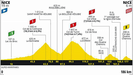 ![]() dimanche 30 août 2020 ![]() 13h20 (Alpes-Maritimes) Nice/M6202bis (km 0) - Carros (près de) (km 8) - M901 Lac du Broc (km 16) - Le pont Charles-Albert (km 17.5) - Baus-Roux (km 18) - M6202 Le Plan du Var (km 20) - Le Chaudan (km 21.5) - Tunnels de la Mescla (km 27.5) - La Courbaisse (km 29.5) - Roussillon-La Condamine (km 35.5) - Pont de Clans (km 37) - Bancairon (km 40) - Marie-Gare (km 44.5) - La Bollinette (km 45.5) - M2565 Rimplas-Gare (km47) - Le Planet-Les Vignes (km 50.5) - La Bolline (km 55.5) - La Roche (km 57) - Saint-Dalmas (km 59.5) - Col de La Colmiane (km 63.5-GPM1) - Saint-Martin-Vésubie (km 70.5) - Saint-Bernard (km 74) - Nantelle (km 74.5) - Les Chataîgniers (km 75.5) - Roquebillière (km 80) - M2565 La Bollène-Vésubie (km 87.5) - M70 Le Pra d'Allart (km 96.5) - Col du Turini (km 99.5-GPM1) - D2566 La Maïris (km 105) - Peïra-Cava (km 106.5) - D21 Lucéram (km 119.5) - D2566 L'Escarène (km 125.5) - Col de Nice (km 127.5) - La Pointe des Contes (km 132.5) - Nice (km 141.5) - Col des Quatre chemins (km 151) - Saint-Michel (km 151.5) - Col d'Èze (km 153-GPM2) - M46 Èze village (km 157) - Villefranche-sur-Mer (km 161.5) - Nice/entrée (km 164) - Nice/1er passage ligne d'arrivée (km 168.5) - Col des Quatre chemins (km 177-bonus) - Villefranche-sur-Mer (km 177.5) - Nice/entrée (km 181.5) - Nice/Promenade des Anglais (km 186). ![]() ![]() ![]() Vidéo Tour de France/DailyMotion ![]() Étape : ![]() 1. Julian Alaphilippe (Fra) en 4h55'27" (moy : 37.570 km/h) 2. Marc Hirschi (Sui) 3. Adam Yates (Gbr) à 1" 4. Greg Van Avermaet (Bel) à 2" 5. Sergio Andres Higuita Garcia (Col) 6. Bauke Mollema (Hol) 7. Alexey Lutsenko (Kaz) 8. Tadej Pogacar (Slo) 9. Maximilian Schachmann (All) 10. Alberto Bettiol (Ita) 11. Guillaume Martin (Fra) 12. Esteban Chaves (Col) 13. Damiano Caruso (Ita) 14. Alejandro Valverde (Esp) 15. Pierre Latour (Fra) 16. Miguel Angel Lopez (Col) 17. Egan Bernal (Col) 18. Nairo Quintana (Col) 19. Jesus Herrada (Esp) 20. Richard Carapaz (Ecu) 21. Pierre Rolland (Fra) 22. Tom Dumoulin (Hol) 23. Kenny Elissonde (Fra) 24. Nicolas Roche (Irl) 25. Enric Mas (Esp) 26. Emanuel Buchmann (All) 27. Mikel Landa (Esp) 28. Pello Bilbao (Esp) 29. Thibaut Pinot (Fra) 30. Romain Bardet (Fra) 31. Primoz Roglic (Slo) 32. Rigoberto Uran (Col) 33. Davide Formolo (Ita) 34. Richie Porte (Aus) 35. Sébastien Reichenbach (Sui) 36. Luis León Sanchez (Esp) 37. Gorka Izagirre (Esp) à 19" 38. Michal Kwiatkowski (Pol) à 1'04" 39. Marc Soler (Esp) à 1'12" 40. Domenico Pozzovivo (Ita) à 1'16" 41. George Bennett (Nzl) 42. Fabio Aru (Ita) à 2'09" 43. Rudy Molard (Fra) 44. Valentin Madouas (Fra) 45. Sepp Kuss (Usa) 46. Wout Van Aert (Bel) 47. Hugh Carthy (Gbr) à 3'38" 48. Daniel Felipe Martinez (Col) 49. Alexis Vuillermoz (Fra) 50. Nicolas Édet (Fra)0:04:25 51. Harold Alfonso Tejada (Col) 52. Ilnur Zakarin (Rus) 53. Romain Sicard (Fra) 54. Mikel Nieve (Esp) 55. Ion Izagirre (Esp) 56. Warren Barguil (Fra) 57. Jasper Stuyven (Bel) à 5'35" 58. Krists Neilands (Let) à 7'02" 59. Jonathan Castroviejo (Esp) 60. Bob Jungels (Lux) 61. Mikael Chérel (Fra) 62. Winner Anacona (Col) 63. Nelson Oliveira (Por) à 8'41" 64. Robert Gesink (Hol) 65. Niklas Eg (Dan) 66. Diego Rosa (Ita) à 9'55" 67. Jan Polanc (Slo) à 9'57" 68. Cyril Gautier (Fra) à 10'19" 69. Toms Skujins (Let) 70. Ben Hermans (Bel) 71. Lennard Kämna (All) 72. Felix Großschartner (Aut) 73. Gregor Mühlberger (Aut) 74. Dario Cataldo (Ita) 75. Clément Venturini (Fra) à 12'43" 76. Carlos Verona (Esp) à 13'52" 77. Neilson Powless (Usa) 78. Søren Kragh Andersen (Dan) 79. Dries Devenyns (Bel) à 14'33" 80. Kasper Asgreen (Dan) à 17'45" 81. Oliver Naesen (Bel) 82. Connor Swift (Gbr) 83. Nils Politt (All) 84. Dayer Quintana (Col) 85. Stefan Küng (Sui) 86. Nans Peters (Fra) 87. Michael Schär (Sui) 88. Roman Kreuziger (Tch) 89. José Rojas (Esp) 90. Simon Geschke (All) 91. Quentin Pacher (Fra) 92. Benoit Cosnefroy (Fra) 93. Jonas Koch (All) 94. Anthony Perez (Fra) 95. Edward Theuns (Bel) 96. David Gaudu (Fra) 97. Tiesj Benoot (Bel) 98. Omar Fraile (Esp) 99. Tejay Van Garderen (Usa) 100. Daniel Martin (Irl) 101. Amund Grøndahl Jansen (Nor) 102. Edvald Boasson Hagen (Nor) 103. Lukas Pöstlberger (Aut) 104. Tim Declercq (Bel) 105. Dylan Van Baarle (Hol) 106. Daniel Oss (Ita) 107. Michael Gogl (Aut) 108. Peter Sagan (Slq) 109. Tony Martin (All) 110. Sonny Colbrelli (Ita) 111. Alessandro De Marchi (Ita) 112. Jan Hirt (Tch) à 17'51" 113. Michael Valgren (Dan) à 20'42" 114. Matteo Trentin (Ita) 115. Matej Mohoric (Slo) 116. Daryl Impey (Afs) 117. Guy Niv (Isr) 118. Jens Keukeleire (Bel) 119. Kevin Ledanois (Fra) 120. Jack Bauer (Nzl) 121. Pierre Luc Périchon (Fra) 122. Christopher Juul Jensen (Dan) 123. Tom Van Asbroeck (Bel) à 21'38" 124. Matthieu Ladagnous (Fra) 125. Cyril Barthe (Fra) 126. Joris Nieuwenhuis (Hol) 127. Imanol Erviti (Esp) 128. Hugo Houle (Can) 129. Wout Poels (Hol) à 25'47" 130. Pavel Sivakov (Rus) à 28'15" 131. Elia Viviani (Ita) 132. Jens Debusschere (Bel) 133. Rémi Cavagna (Fra) 134. Hugo Hofstetter (Fra) 135. Geoffrey Soupe (Fra) 136. Vegard Stake Laengen (Nor) 137. Alexander Kristoff (Nor) 138. Marco Marcato (Ita) 139. Luka Mezgec (Slo) 140. Marco Haller (Aut) 141. Maxime Chevalier (Fra) 142. Anthony Turgis (Fra) 143. Lilian Calmejane (Fra) 144. Andrey Amador (Crc) 145. Casper Phillip Pedersen (Dan) 146. Mads Pedersen (Dan) 147. Christophe Laporte (Fra) 148. Luke Rowe (Gbr) 149. Michael Mørkøv (Dan) 150. Ryan Gibbons (Afs) à 28'55" 151. Giacomo Nizzolo (Ita) 152. Maximilian Walscheid (All) 153. William Bonnet (Fra) 154. Samuel Bewley (Nzl) 155. André Greipel (All) 156. Clément Russo (Fra) 157. Thomas De Gendt (Bel) 158. Steff Cras (Bel) 159. Nikias Arndt (All) 160. Roger Kluge (All) 161. Bryan Coquard (Fra) 162. Mathieu Burgaudeau (Fra) 163. David De la Cruz (Esp) 164. Fabien Grellier (Fra) 165. Simone Consonni (Ita) 166. Jérôme Cousin (Fra) 167. Cees Bol (Hol) 168. Sam Bennett (Irl) 169. Nicc