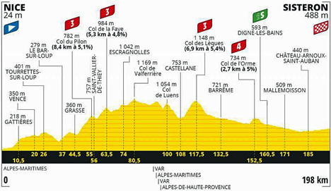 ![]() lundi 31 août 2020 ![]() 12h20 (Alpes-Maritimes) Nice/M6202bis (km 0) - La Tourre (près de) (km 5.5) - Carros - Gattières (km 10.5) - Saint-Jeannet (km 13.5) - Vence (km 20) - M2210 Tourettes-sur-Loup (km 26) - Pont du Loup (km 34.5) - Pré du Lac (km 41) - Magagnosc - Grasse (km 44.5) - D6085 Col du Pilon (km 55-GPM3) - Saint-Vallier-de-Thiey (km 56) - Col de la Faye (km 63.5-GPM3) - Les Amphons (km 71) - Escragnolles (km 74) - Col de Valferrière (km 85) - La Clue - La Villaute (km 88) - Le Logis-du-Pin - (Alpes-de-Haute-Provence) : Le Mousteiret (km 93) - (Var) - (Alpes-de-Haute-Provence) : Col de Luens (km 100) - La Garde - Castellane (km 108) - Sionne - D4085 Col des Lèques (km 117.5-GPM3) - Clue de Taulanne - La Tuilière (km 124) - Barrême (km 132.5) - N85 Norante (km 139) - Chabrières (km 145) - Châteauredon (km 150.5) - Col de l'Orme (km 152.5) - Digne-les-Bains (km 160.5-sprint) - Le Grillet (km 169) - Mallemoisson (km 171) - Beauveset (km 176) - Malijai (km 179) - Château-Arnaux-St-Auban (km 185) - Aubignosc (près de) (km 191) - Peipin (près de) - Les Bons Enfants (km 194) - Sisteron/Av. de la Libération (km 198). ![]() ![]() ![]() Vidéo Tour de France/DailyMotion ![]() Étape : ![]() 1. Caleb Ewan (Aus) en 05h17'42" (moy : 37.394 km/h) 2. Sam Bennett (Irl) 3. Giacomo Nizzolo (Ita) 4. Hugo Hofstetter (Fra) 5. Peter Sagan (Slq) 6. Edward Theuns (Bel) 7. Cees Bol (Hol) 8. Matteo Trentin (Ita) 9. Bryan Coquard (Fra) 10. Niccolò Bonifazio (Ita) 11. Luka Mezgec (Slo) 12. Tom Van Asbroeck (Bel) 13. Jonas Koch (All) 14. Jack Bauer (Nzl) 15. Alexander Kristoff (Nor) 16. Hugo Houle (Can) 17. Marc Soler (Esp) 18. Alexey Lutsenko (Kaz) 19. Jasper Stuyven (Bel) 20. Simone Consonni (Ita) 21. Damiano Caruso (Ita) 22. Tadej Pogacar (Slo) 23. Jan Polanc (Slo) 24. Clément Venturini (Fra) 25. Oliver Naesen (Bel) 26. Clément Russo (Fra) 27. Daniel Oss (Ita) 28. Omar Fraile (Esp) 29. Guillaume Martin (Fra) 30. Davide Formolo (Ita) 31. Gregor Mühlberger (Aut) 32. Michael Mørkøv (Dan) 33. Elia Viviani (Ita) 34. Tom Dumoulin (Hol) 35. Mads Pedersen (Dan) 36. Egan Bernal (Col) 37. Nikias Arndt (All) 38. Luis León Sanchez (Esp) 39. Anthony Turgis (Fra) 40. Kevin Ledanois (Fra) 41. Adam Yates (Gbr) 42. Miguel Angel Lopez (Col) 43. Christophe Laporte (Fra) 44. Imanol Erviti (Esp) 45. Tiesj Benoot (Bel) 46. Cyril Gautier (Fra) 47. Nelson Oliveira (Por) 48. Warren Barguil (Fra) 49. Vegard Stake Laengen (Nor) 50. Nairo Quintana (Col) 51. Nans Peters (Fra) 52. Thibaut Pinot (Fra) 53. Emanuel Buchmann (All) 54. Joris Nieuwenhuis (Hol) 55. Felix Großschartner (Aut) 56. Søren Kragh Andersen (Dan) 57. Mikel Landa (Esp) 58. Julian Alaphilippe (Fra) 59. Esteban Chaves (Col) 60. Greg Van Avermaet (Bel) 61. Alejandro Valverde (Esp) 62. Matthieu Ladagnous (Fra) 63. Marc Hirschi (Sui) 64. Jens Debusschere (Bel) 65. Connor Swift (Gbr) 66. Cyril Barthe (Fra) 67. Romain Bardet (Fra) 68. Daryl Impey (Afs) 69. Samuel Bewley (Nzl) 70. Ryan Gibbons (Afs) 71. Richard Carapaz (Ecu) 72. Primoz Roglic (Slo) 73. José Rojas (Esp) 74. George Bennett (Nzl) 75. Valentin Madouas (Fra) 76. Amund Grøndahl Jansen (Nor) 77. Diego Rosa (Ita) 78. Gorka Izagirre (Esp) 79. Stefan Küng (Sui) 80. Niklas Eg (Dan) 81. Bauke Mollema (Hol) 82. Dylan Van Baarle (Hol) 83. Sepp Kuss (Usa) 84. Enric Mas (Esp) 85. Marco Haller (Aut) 86. Pierre Luc Périchon (Fra) 87. Daniel Felipe Martinez (Col) 88. Matej Mohoric (Slo) 89. Fabio Aru (Ita) 90. Pierre Latour (Fra) 91. Romain Sicard (Fra) 92. Alberto Bettiol (Ita) 93. Sergio Andres Higuita (Col) 94. Neilson Powless (Usa) 95. Nicolas Roche (Irl) 96. Domenico Pozzovivo (Ita) 97. Rigoberto Uran (Col) 98. Toms Skujins (Let) 99. Hugh Carthy (Gbr) 100. Richie Porte (Aus) 101. Pierre Rolland (Fra) 102. Jesus Herrada (Esp) 103. Maximilian Walscheid (All) 104. Kevin Reza (Fra) 105. Ion Izagirre (Esp) 106. Robert Gesink (Hol) 107. Ilnur Zakarin (Rus) 108. David Gaudu (Fra) 109. Lennard Kämna (All) 110. Mikel Nieve (Esp) 111. Nicolas Édet (Fra) 112. Tejay Van Garderen (Usa) 113. Nils Politt (All) 114. Pello Bilbao (Esp) 115. Bob Jungels (Lux) 116. Steff Cras (Bel) 117. Sonny Colbrelli (Ita) 118. Kasper Asgreen (Dan) 119. Dario Cataldo (Ita) 120. Kenny Elissonde (Fra) 121. Rudy Molard (Fra) 122. Maxime Chevalier (Fra) 123. Maximilian Schachmann (All) 124. Lilian Calmejane (Fra) 125. Alexis Vuillermoz (Fra) 126. Ben Hermans (Bel) 127. Casper Phillip Pedersen (Dan) 128. Thomas De Gendt (Bel) 129. Simon Geschke (All) 130. Marco Marcato (Ita) 131. Michael Valgren (Dan) 132. Mathieu Burgaudeau (Fra) 133. Guy Niv (Isr) 134. André Greipel (All) 135. Daniel Martin (Irl) 136. Krists Neilands (Let) 137. Andrey Amador (Crc) 138. Quentin Pacher (Fra) 139. Michael Schär (Sui) 140. Harold Alfonso Tejada (Col) 141. Jens Keukeleire (Bel) 142. Jonathan Castroviejo (Esp) 143. Edvald Boasson Hagen (Nor) 144. Dries Devenyns (Bel) à 26" 145. Jasper De Buyst (Bel) à 31" 146. Sébastien Reichenbach (Sui) à 40" 147. Roger Kluge (All) à 1'11" 148. Christopher Juul Jensen (Dan) à 1'23" 149. Luke Rowe (Gbr) à 1'37" 150. Carlos Verona (Esp) à 2'25" 151. Roman Kreuziger (Tch) à 2'50" 152. Frederik Frison (Bel) 153. Michael Gogl (Aut) 154. Fabien Grellier (Fra) 155. William Bonnet (Fra) 156. Tim Declercq (Bel) 157. Geoffrey Soupe (Fra) 158. David De la Cruz (Esp) 159. Jan Hirt (Tch) 160. Alessandro De Marchi (Ita) à 3'42" 161. Pavel Sivakov (Rus) à 5'11" 162. Michal Kwiatkowski (Pol) 163. Winner Anacona (Col) 164. Wout Poels (Hol) 165. Benoit Cosnefroy (Fra) 166. Rémi Cavagna (Fra) 167. Mikael Chérel (Fra) 168. Wout Van Aert (Bel) 169. Tony Martin (All) 170. Jérôme Cousin (Fra) 171. Dayer Quintana (Col) 172. Lukas Pöstlberger (Aut) à 7'32" Bonifications étape : Caleb Ewan (Aus) 10" Sam Bennett (Irl) 6" Giacomo Nizzolo (Ita) 4" Abandon : Anthony Perez (Fra) Prix de la combativité : Jérôme Cousin (Fra) Classement général : ![]() 1. Julian Alaphilippe (Fra) en 13h59'17" 2. Adam Yates (Gbr) à 4