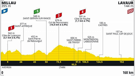 ![]() vendredi 4 septembre 2020 ![]() 13h35 (Aveyron) Millau/D992 (km 0) - Viaduc de Millau (km 1.5) - Saint-Georges de Luzençon (km 5) - D73 Côte de Luzençon (km 9-GPM3) - Saint-Rome-de-Tarn (km 13.5) - Saint-Affrique (km 26) - D999 Vabre l'Abbaye (km 30.5) - Moulin-Neuf (km 38.5) - Saint-Pierre de Rebourguil (km 43) - La Trivalle (km 47) - La Joncasse (km 54) - Saint-Sernin-sur-Rance (km 58-sprint) - Pousthomy (km 62) - Le Meynis (km 65.5) - La Peyrade (km 71) - Col de Peyronnenc (km 73.5-GPM3) - (Tarn) : D89 Plantéry (km 81) - La Quintaine (km 86.5) - Saint-Pierre-de-Trivisy (km 93.5) - D59 Côte de Paulhe (km 97.5-GPM4) - Paulhe (km 98.5) - Montredon-Labessonié (km 106.5) - D89 Roquecourbe (km 118.5) - Castres (km 124.5) - D112 Les Farguettes (km 135) - L'Issartade (km 137) - Vielmur-sur-Agout (km 142.5) - Guitalens-L'Albarède (km 146) - Saint-Paul-Cap-de-Joux (km 152) - La Boissière (km 155) - Lardenquié (km 158.5) - Plaine de Bories (km 165) - Lavaur/Av. Pierre Fabre (km 168). ![]() ![]() ![]() Vidéo Tour de France/DailyMotion ![]() Étape : ![]() 1. Wout Van Aert (Bel) en 3h32'03" (moy : 47.536 km/h) 2. Edvald Boasson Hagen (Nor) 3. Bryan Coquard (Fra) 4. Christophe Laporte (Fra) 5. Jasper Stuyven (Bel) 6. Clément Venturini (Fra) 7. Hugo Hofstetter (Fra) 8. Egan Bernal (Col) 9. Adam Yates (Gbr) 10. Alejandro Valverde (Esp) 11. Hugo Houle (Can) 12. Julian Alaphilippe (Fra) 13. Peter Sagan (Slq) 14. Warren Barguil (Fra) 15. Mikael Chérel (Fra) 16. Romain Bardet (Fra) 17. Sergio Andres Higuita (Col) 18. Thibaut Pinot (Fra) 19. Emanuel Buchmann (All) 20. Guillaume Martin (Fra) 21. Alberto Bettiol (Ita) 22. Miguel Angel Lopez (Col) 23. Alexey Lutsenko (Kaz) 24. Luis León Sanchez (Esp) 25. Tom Dumoulin (Hol) 26. Michael Gogl (Aut) 27. Primoz Roglic (Slo) 28. Nairo Quintana (Col) 29. Enric Mas (Esp) 30. Marc Soler (Esp) 31. Rigoberto Uran (Col) 32. Cyril Gautier (Fra) 33. Valentin Madouas (Fra) 34. Rudy Molard (Fra) 35. Ion Izagirre (Esp) 36. George Bennett (Nzl) 37. Gorka Izagirre (Esp) 38. Omar Fraile (Esp) 39. Matthieu Ladagnous (Fra) 40. Sepp Kuss (Usa) 41. Stefan Küng (Sui) 42. Michal Kwiatkowski (Pol) à 15" 43. Tadej Pogacar (Slo) à 1'21" 44. Sonny Colbrelli (Ita) 45. Matteo Trentin (Ita) 46. Mikel Landa (Esp) 47. José Rojas (Esp) 48. Carlos Verona (Esp) 49. Nelson Oliveira (Por) 50. Dario Cataldo (Ita) 51. Richard Carapaz (Ecu) 52. Greg Van Avermaet (Bel) 53. Fabio Aru (Ita) 54. Damiano Caruso (Ita) 55. Felix Großschartner (Aut) 56. Roman Kreuziger (Tch) 57. Luka Mezgec (Slo) 58. Esteban Chaves (Col) 59. Bauke Mollema (Hol) 60. Pierre Rolland (Fra) 61. Daniel Oss (Ita) 62. Richie Porte (Aus) 63. Gregor Mühlberger (Aut) 64. Hugh Carthy (Gbr) 65. Krists Neilands (Let) 66. Nils Politt (All) 67. Toms Skujins (Let) 68. Thomas De Gendt (Bel) 69. Jan Polanc (Slo) 70. Lennard Kämna (All) 71. Robert Gesink (Hol) 72. Daniel Martin (Irl) 73. David Gaudu (Fra) 74. Sébastien Reichenbach (Sui) 75. Michael Valgren (Dan) 76. Connor Swift (Gbr) 77. Dylan Van Baarle (Hol) 78. Marco Marcato (Ita) à 1'31" 79. Davide Formolo (Ita) à 1'37" 80. Romain Sicard (Fra) à 1'21" 81. Pello Bilbao (Esp) à 1'58" 82. Vegard Stake Laengen (Nor) à 2'00" 83. Pierre Luc Périchon (Fra) à 2'12" 84. Dries Devenyns (Bel) à 2'21" 85. Matej Mohoric (Slo) à 2'26" 86. Christopher Juul Jensen (Dan) à 2'44" 87. Maximilian Schachmann (All) à 3'04" 88. Jonathan Castroviejo (Esp) 89. Ilnur Zakarin (Rus) à 3'43" 90. Kevin Ledanois (Fra) à 4'16" 91. Andrey Amador (Crc) à 10'19" 92. Quentin Pacher (Fra) à 12'36" 93. Tom Van Asbroeck (Bel) à 14'32" 94. Edward Theuns (Bel) 95. Oliver Naesen (Bel) 96. Imanol Erviti (Esp) 97. Bob Jungels (Lux) 98. Tim Declercq (Bel) 99. Guy Niv (Isr) 100. Ben Hermans (Bel) 101. Tony Martin (All) 102. Neilson Powless (Usa) 103. Jesus Herrada (Esp) 104. Nicolas Édet (Fra) 105. Winner Anacona (Col) 106. Domenico Pozzovivo (Ita) 107. Fabien Grellier (Fra) 108. Anthony Turgis (Fra) 109. Daryl Impey (Afs) 110. Luke Rowe (Gbr) 111. Kasper Asgreen (Dan) 112. Simon Geschke (All) 113. Alexis Vuillermoz (Fra) 114. Sam Bennett (Irl) 115. Lukas Pöstlberger (Aut) 116. Pierre Latour (Fra) 117. Maxime Chevalier (Fra) 118. Cyril Barthe (Fra) 119. Jack Bauer (Nzl) 120. Nans Peters (Fra) 121. Niklas Eg (Dan) 122. Tejay Van Garderen (Usa) 123. Daniel Felipe Martinez (Col) 124. Harold Alfonso Tejada (Col) 125. Alessandro De Marchi (Ita) 126. Benoît Cosnefroy (Fra) 127. Mikel Nieve (Esp) 128. Niccolò Bonifazio (Ita) 129. David De la Cruz (Esp) 130. Dayer Quintana (Col) 131. Marc Hirschi (Sui) à 15'54" 132. Jasper De Buyst (Bel) 133. André Greipel (All) 134. Joris Nieuwenhuis (Hol) 135. Casper Phillip Pedersen (Dan) 136. Amund Grøndahl Jansen (Nor) 137. Tiesj Benoot (Bel) 138. Ryan Gibbons (Afs) 139. Samuel Bewley (Nzl) 140. Diego Rosa (Ita) 141. Pavel Sivakov (Rus) 142. Marco Haller (Aut) 143. Jonas Koch (All) 144. Nikias Arndt (All) 145. Jens Debusschere (Bel) 146. Kevin Reza (Fra) 147. Maximilian Walscheid (All) 148. William Bonnet (Fra) 149. Michael Schär (Sui) 150. Steff Cras (Bel) 151. Frederik Frison (Bel) 152. Alexander Kristoff (Nor) 153. Geoffrey Soupe (Fra) 154. Nicolas Roche (Irl) 155. Kenny Elissonde (Fra) 156. Mathieu Burgaudeau (Fra) 157. Wout Poels (Hol) 158. Roger Kluge (All) 159. Cees Bol (Hol) 160. Jérôme Cousin (Fra) 161. Lilian Calmejane (Fra) 162. Clément Russo (Fra) 163. Caleb Ewan (Aus) 164. Giacomo Nizzolo (Ita) 165. Elia Viviani (Ita) 166. Rémi Cavagna (Fra) 167. Jens Keukeleire (Bel) 168. Simone Consonni (Ita) 169. Michael Mørkøv (Dan) 170. Mads Pedersen (Dan) 171. Jan Hirt (Tch) 172. Søren Kragh Andersen (Dan) Bonifications étape : Wout Van Aert (Bel) 10" Edvald Boasson Hagen (Nor) 6" Bryan Coquard (Fra) 4" Pénalité : 20" : Hugh John Carthy (Gbr) Prix de la combativité : Daniel Oss (Ita) Classement général : ![]() 1. Adam Yates (Gbr) en 30h36'00" 2. Primoz Roglic (Slo) à 3" 3. Guillaume Martin (Fra) à 9" 4. Egan Bernal (Col) à 13" 5. Tom Du