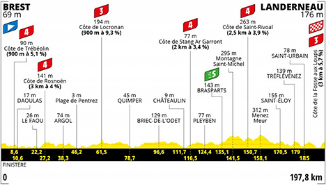 ![]() BREST > LANDERNEAU, 197.8 km samedi 26 juin 2021 ![]() 12h30 (Finistère) : Brest - Plougastel-Daoulas (km 0) - D33 Loperhet (km 5.4) - Côte de Trébéolin (km 8.6-GPM4) - Daoulas (km 10.6) - D770 L'Hôpital-Camfrout (km 14.9) - Le Faou (km 22.2) - D47 Rosnöen (km 27.2-GPM4) - D791 Pont de Térénez (km 33.4) - Argol (km 38.3) - Plage de Pentrez (km 46.2) - Plage de Lestrevet (km 47.8) - D63 Plonévez-Porzay (km 56.2) - Locronan (km 60.6) - Côte de Locronan (km 61.5-GPM3) - Plogonnec (km 63.2) - D56 Guengat (km 68.2) - D765 Quimper (km 78.7) - D785 Penity (km 89.3) - Briec de l'Odet (km 96.6) - Ty Daoudal (km 102.4) - D41 Kroas Ar Born (km 107) - Châteaulin (km 111.7) - D887 Côte de Stang Ar Garront (km 115) - Pleyben (km 124.4) - D785 Brasparts (km 135.1-sprint) - Montagne Saint-Michel (km 141.5) - D42 Saint-Rivoal (km 147.5) - D30 Côte de Saint-Rivoal (km 150.7-GPM4) - Saint-Cadou (km 152.6) - D42 Menez Meur (km 158.1) - Kernellac'h (km 167.1) - D35 Saint-Éloy (km 170.5) - Le Tréhou (km 174.5) - Tréflévénez (km 179) - D47 Saint-Urbain (km 185) - Le Stum (km 187.9) - D770 Landerneau/entrée (km 190.9) - Landerneau/Côte de la Fosse-aux-Loups (km 197.8). ![]() ![]() ![]() Vidéo Tour de France/DailyMotion ![]() Étape : ![]() 1. Julian Alaphilippe (Fra) en 4h39'05" (moy : 42.52 km/h) 2. Michael Matthews (Aus) à 8" 3. Primoz Roglic (Slo) 4. Jack Haig (Aus) 5. Wilco Kelderman (Hol) 6. Tadej Pogacar (Slo) 7. David Gaudu (Fra) 8. Sergio Higuita (Col) 9. Bauke Mollema (Hol) 10. Geraint Thomas (Gbr) 11. Esteban Chaves (Col) 12. Pello Bilbao (Esp) 13. Jonas Vingegaard (Dan) 14. Alexey Lutsenko (Kaz) 15. Enric Mas (Esp) 16. Rigoberto Uran (Col) 17. Nairo Quintana (Col) 18. Vincenzo Nibali (Ita) 19. Kasper Asgreen (Dan) 20. Mathieu Van der Poel (Hol) 21. Jakob Fuglsang (Dan) 22. Richard Carapaz (Equ) à 13" 23. Alex Aranburu (Esp) 24. Wout Van Aert (Bel) 25. Pierre Latour (Fra) 26. Tiesj Benoot (Bel) à 16" 27. Anthony Turgis (Fra) à 28" 28. Lucas Hamilton (Aus) à 38" 29. Brent Van Moer (Bel) à 46" 30. Toms Skujins (Let) à 51" 31. Guillaume Boivin (Can) 32. Jasper Stuyven (Bel) à 54" 33. Sonny Colbrelli (Ita) 34. Boy Van Poppel (Hol) à 1'24" 35. Søren Kragh Andersen (Dan) à 1'49" 36. Robert Gesink (Hol) 37. Ivan Garcia (Esp) 38. Michael Valgren (Dan) 39. Michael Gogl (Aut) 40. Ben O'Connor (Aus) 41. Miguel Angel Lopez (Col) 42. Emanuel Buchmann (All) 43. Sergio Henao (Col) 44. Steven Kruijswijk (Hol) 45. Matej Mohoric (Slo) 46. Guillaume Martin (Fra) 47. Pierre Rolland (Fra) 48. Mattia Cattaneo (Ita) 49. Stefan Küng (Sui) 50. Christophe Laporte (Fra) 51. Mark Donovan (Gbr) 52. Joris Nieuwenhuis (Hol) 53. Stefan Bissegger (Sui) 54. Nils Eekhoff (Hol) à 1'57" 55. Dries Devenyns (Bel) à 2'03" 56. Ruben Guerreiro (Por) à 2'10" 57. Neilson Powless (Usa) 58. Oliver Naesen (Bel) à 2'16" 59. Greg Van Avermaet (Bel) 60. Aurélien Paret-Peintre (Fra) 61. Louis Meintjes (Afs) 62. Cyril Barthe (Fra) 63. Quentin Pacher (Fra) 64. Wout Poels (Hol) 65. Richie Porte (Aus) 66. Philippe Gilbert (Bel) 67. Stefan De Bod (Afs) 68. Xandro Meurisse (Bel) 69. Davide Formolo (Ita) 70. Hugo Houle (Can) 71. Jonas Rickaert (Bel) 72. Dylan Van Baarle (Hol) à 3'02" 73. Peter Sagan (Svk) à 3'17" 74. Luka Mezgec (Slo) 75. Simon Yates (Gbr) 76. Simon Geschke (All) 77. Jan Bakelants (Bel) 78. Anthony Delaplace (Fra) 79. Luke Rowe (Gbr) à 3'30" 80. Michal Kwiatkowski (Pol) 81. Connor Swift (Gbr) à 3'55" 82. Jonas Rutsch (All) 83. Thomas De Gendt (Bel) à 4'10" 84. Dylan Teuns (Bel) 85. Lukas Pöstlberger (Aut) 86. Sean Bennett (Usa) 87. Magnus Cort (Dan) à 4'24" 88. Christopher Juul-Jensen (Dan) 89. Vegard Stake Laengen (Nor) à 4'57" 90. Bruno Armirail (Fra) à 5'00" 91. Jelle Wallays (Bel) à 5'21" 92. Davide Ballerini (Ita) à 5'26" 93. Alejandro Valverde (Esp) à 5'33" 94. Carlos Barbero (Esp) 95. Imanol Erviti (Esp) 96. Rui Costa (Por) 97. Rafal Majka (Pol) 98. Nicholas Dlamini (Afs) 99. Julien Bernard (Fra) 100. Kenny Elissonde (Fra) 101. Anthony Perez (Fra) 102. Nacer Bouhanni (Fra) 103. Jasper Philipsen (Bel) 104. Ruben Fernandez (Esp) 105. Franck Bonnamour (Fra) 106. Cyril Gautier (Fra) 107. Fabien Doubey (Fra) 108. Elie Gesbert (Fra) 109. Valentin Madouas (Fra) 110. Cristian Rodriguez (Esp) 111. Victor De la Parte (Esp) 112. Arnaud Demare (Fra) 113. Omar Fraile (Esp) 114. Edvald Boasson Hagen (Nor) 115. Tosh Van Der Sande (Bel) 116. Miles Scotson (Aus) 117. Carlos Verona (Esp) 118. Fred Wright (Gbr) 119. Jacopo Guarnieri (Ita) 120. Petr Vakoc (Tch) 121. Daniel Martin (Irl) 122. Jeremy Cabot (Fra) 123. Tao Geoghegan Hart (Gbr) 124. Jonathan Castroviejo (Esp) 125. Jonas Koch (All) 126. Maximilian Walscheid (All) à 6'01" 127. Daniel Oss (Ita) à 6'07" 128. Roger Kluge (All) 129. Caleb Ewan (Aus) 130. Warren Barguil (Fra) 131. Tim Declercq (Bel) 132. Mark Cavendish (Gbr) 133. Michael Mørkøv (Dan) 134. Luke Durbridge (Aus) à 6'31" 135. Victor Campenaerts (Bel) à 6'47" 136. Jasper De Buyst (Bel) à 6'57" 137. Simon Clarke (Aus) 138. Brandon McNulty (Usa) 139. Julien Simon (Fra) 140. Loïc Vliegen (Bel) 141. Danny Van Poppel (Hol) 142. Jorge Arcas (Esp) 143. Lorenzo Rota (Ita) à 7'00" 144. Michael Schär (Sui) 145. Nans Peters (Fra) à 7'50" 146. Dorian Godon (Fra) 147. Maxime Chevalier (Fra) 148. Silvan Dillier (Sui) à 8'10" 149. Mikkel Bjerg (Dan) à 8'49" 150. Nils Politt (All) 151. Patrick Konrad (Aut) 152. Tim Merlier (Bel) 153. Harry Sweeny (Aus) 154. Michael Woods (Can) 155. Casper Pedersen (Dan) à 9'19" 156. Kristian Sbaragli (Ita) à 9'32" 157. Jesus Herrada (Esp) 158. Cees Bol (Hol) à 9'47" 159. Benoit Cosnefroy (Fra) à 9'52" 160. Georg Zimmermann (All) à 10'55" 161. Dmitriy Gruzdev (Kaz) à 11'05" 162. Ion Izagirre (Esp) 163. André Greipel (All) à 11'16" 164. Edward Theuns (Bel) 165. Pierre-Luc Périchon (Fra) 166. Marco Haller (Aut) à 11'21" 167. Ide Schelling (Hol) à 11'52" 168. Bryan Coquard (Fra) à 13'04" 169. Clément Russo (Fra) à 14'22" 170. Daniel McLay (Gbr