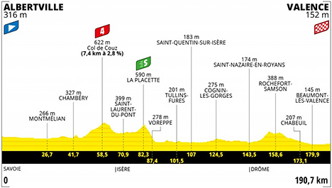 ![]() mardi 6 juillet 2021 ![]() 13h05 (Savoie) : D1090 Albertville (km 0) - Frontenex (près de) (km 1.5) - Arbin (près de) (km 25.7) - Montmélian (km 26.7) - Chignin (km 32.2) - Saint-Jéoire-Prieuré (km 34.3) - D5 Challes-les-Eaux (km 35.6) - La Ravoire (km 37.6) - Barberaz (km 39.6) - Chambéry (km 41.7) - D1006 Cognin (km 46.3) - Saint-Thibaud-de-Couz (km 54.2) - Col de Couz (km 58.5-GPM4) - Saint-Jean-de-Couz (près de) (km 59.2) - Saint-Christophe-la-Grotte (km 64.1) - (Isère) : D520 Entre-Deux-Giers (près de) (km 68) - Saint-Laurent-du-Pont (km 70.9) - Saint-Joseph-de-Rivière (km 75.6) - D520a La Placette (km 82.3-sprint) - Voreppe (km 87.4) - D1092 Moirans (km 96.2) - Vourey (km 98.8) - Tullin-Fures (km 101.5) - D45 Saint-Quentin-sur-Isère (km 107) - D1532 La Rivière (près de) (km 112.9) - Saint-Gervais/Le port (près de) (km 117.9) - Cognin-les-Gorges (km 124.5) - Izeron (km 128.6) - Saint-Romans (km 133.5) - Saint-Just-de-Claix (km 139.6) - (Drôme) : D532 Saint-Nazaire-en-Royans (km 143.5) - La Baume-d'Hostun (près de) (km 146.1) - Hostun (km 149.2) - Rochefort-Samson (km 158.6) - Barbières (près de) (km 161) - Charpey (km 164.9) - D538 Chabeuil (près de) (km 173.1) - D236 Beaumont-lès-Valence (près de) (km 179.9) - D538a Les Quarts (km 183) - Malissard (près de) (km 184.3) - Valence/entrée (km 186.7) - Valence/Av. de Romans (km 190.7). ![]() ![]() ![]() Vidéo Tour de France/DailyMotion ![]() Étape : ![]() 1. Mark Cavendish (Gbr) en 4h14'07" (moy : 45.03 km/h) 2. Wout Van Aert (Bel) 3. Jasper Philipsen (Bel) 4. Nacer Bouhanni (Fra) 5. Michael Matthews (Aus) 6. Michael Mørkøv (Dan) 7. André Greipel (All) 8. Peter Sagan (Slq) 9. Anthony Turgis (Fra) 10. Cees Bol (Hol) 11. Boy Van Poppel (Hol) 12. Ivan Garcia (Esp) 13. Edward Theuns (Bel) 14. Christophe Laporte (Fra) 15. Cyril Barthe (Fra) 16. Franck Bonnamour (Fra) 17. Sonny Colbrelli (Ita) 18. Maximilian Walscheid (All) 19. Carlos Barbero (Esp) 20. Wilco Kelderman (Hol) 21. Stefan Bissegger (Sui) 22. Brent Van Moer (Bel) 23. Oliver Naesen (Bel) 24. Stefan Küng (Sui)) 25. Tadej Pogacar (Slo) 26. David Gaudu (Fra)) 27. Ruben Guerreiro (Por) 28. Silvan Dillier (Sui) 29. Jonas Vingegaard (Dan) 30. Greg Van Avermaet (Bel) 31. Philippe Gilbert (Bel) 32. Michael Schär (Sui) 33. Ben O'Connor (Aus) 34. Aurélien Paret-Peintre (Fra) 35. Kristian Sbaragli (Ita) 36. Harry Sweeny (Aus) 37. Daniel McLay (Gbr) 38. Vegard Stake Laengen (Nor) 39. Alexey Lutsenko (Kaz) 40. Pierre Latour (Fra) 41. Davide Ballerini (Ita) 42. Michael Valgren (Dan) 43. Richard Carapaz (Equ) 44. Jelle Wallays (Bel) 45. Pello Bilbao (Esp) 46. Esteban Chaves (Col) 47. Guillaume Martin (Fra) 48. Rigoberto Uran (Col) 49. Jonas Rutsch (All) 50. Magnus Cort (Dan) 51. Louis Meintjes (Afs) 52. Sergio Higuita (Col) 53. Jan Bakelants (Bel) 54. Imanol Erviti (Esp) 55. Enric Mas (Esp) 56. Steven Kruijswijk (Hol) 57. Patrick Konrad (Aut) 58. Davide Formolo (Ita) 59. Mike Teunissen (Hol) 60. Wout Poels (Hol) 61. Jonas Rickaert (Bel) 62. Maxime Chevalier (Fra) 63. Dorian Godon (Fra) 64. Mattia Cattaneo (Ita) 65. Dylan Teuns (Bel) 66. Pierre-Luc Périchon (Fra) 67. Fabien Doubey (Fra) 68. Warren Barguil (Fra) 69. Guillaume Boivin (Can) 70. Nils Politt (All) 71. Neilson Powless (Usa) 72. Sergio Henao (Col) 73. Xandro Meurisse (Bel) 74. Reto Hollenstein (Sui) 75. Jasper Stuyven (Bel) 76. Rick Zabel (All) 77. Connor Swift (Gbr) 78. Clément Russo (Fra) à 29" 79. Kasper Asgreen (Dan) à 32" 80. Joris Nieuwenhuis (Hol) 81. Matej Mohoric (Slo) 82. Daniel Oss (Ita) à 47" 83. Michal Kwiatkowski (Pol) 84. Dylan Van Baarle (Hol) 85. Luka Mezgec (Slo) 86. Petr Vakoc (Tch) 87. Fred Wright (Gbr) 88. Nairo Quintana (Col) 89. Simon Clarke (Aus) 90. Casper Pedersen (Dan) à 1'06" 91. Luke Durbridge (Aus) à 1'20" 92. Edvald Boasson Hagen (Nor) 93. Jorge Arcas (Esp) à 1'28" 94. Ide Schelling (Hol) 95. Julian Alaphilippe (Fra) à 1'51" 96. Mikkel Bjerg (Dan) à 1'55" 97. Dries Devenyns (Bel) à 2'15" 98. Miguel Angel Lopez (Col) à 3'46" 99. Cyril Gautier (Fra) 100. Quentin Pacher (Fra) 101. Georg Zimmermann (All) 102. Omer Goldstein (Isr) 103. Toms Skujins (Lat) 104. Tiesj Benoot (Bel) 105. Bauke Mollema (Hol) 106. Nils Eekhoff (Hol) 107. Marc Hirschi (Sui) 108. Luke Rowe (Gbr) 109. Tim Declercq (Bel) 110. Lukas Pöstlberger (Aut) 111. Marco Haller (Aut) 112. Jonathan Castroviejo (Esp) 113. Kenny Elissonde (Fra) à 4'38" 114. Simon Geschke (All) 115. Tao Geoghegan Hart (Gbr) 116. Cristian Rodriguez (Esp) 117. Miles Scotson (Aus)) 118. Julien Bernard (Fra) 119. Thomas De Gendt (Bel) 120. Alejandro Valverde (Esp) 121. Alex Aranburu (Esp) 122. Rafal Majka (Pol) 123. Hugo Houle (Can) 124. Jakob Fuglsang (Dan) 125. Jesus Herrada (Esp) 126. Ruben Fernandez (Esp) 127. Brandon McNulty (Usa) 128. Bruno Armirail (Fra)) 129. Geraint Thomas (Gbr) 130. Vincenzo Nibali (Ita) 131. Søren Kragh Andersen (Dan) 132. Richie Porte (Aus) 133. Chris Froome (Gbr) 134. Daniel Martin (Irl) 135. Elie Gesbert (Fra) 136. Omar Fraile (Esp) 137. Ion Izagirre (Esp) 138. Valentin Madouas (Fra)) 139. Pierre Rolland (Fra) 140. Victor De la Parte (Esp) 141. Benoit Cosnefroy (Fra) 142. Rui Costa (Por) 143. Emanuel Buchmann (All) 144. Tony Martin (All) 145. Sepp Kuss (Usa) 146. Michael Woods (Can) 147. Dmitriy Gruzdev (Kaz) 148. Mark Donovan (Gbr) 149. Jeremy Cabot (Fra) 150. Michael Gogl (Aut) 151. Lorenzo Rota (Ita) 152. Lucas Hamilton (Aus) 153. Simon Yates (Gbr) 154. Christopher Juul-Jensen (Dan) 155. Anthony Perez (Fra) 156. Amund Grøndahl Jansen (Nor) 157. Sean Bennett (Usa) 158. Roger Kluge (All) 159. Carlos Verona (Esp) 160. Tosh Van der Sande (Bel) à 7'59" 161. Mads Pedersen (Dan) 162. Julien Simon (Fra) 163. Victor Campenaerts (Bel) 164. Danny Van Poppel (Hol) Bonifications étape : Mark Cavendish (Gbr) 10" Wout Van Aert (Bel) 6" Jasper Philipsen (Bel) 4" Non-partant : Jonas Koch (All) Prix de la combativité : Hugo Houle (Can) Classement général : ![]() 1. Tadej Pogacar (Slo) en 38h25'17" 2. B