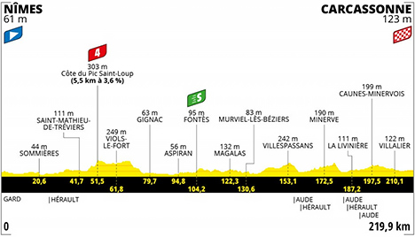 ![]() vendredi 9 juillet 2021 ![]() 12h15 (Gard) : D40 Nîmes (km 0) - Caveirac (km 2) - Langlade (près de) (km 5.1) - Saint-Dionisy (km 6.3) - Calvisson (près de) (km 9.2) - Congénies (km 14.1) - Aujargues (près de) (km 17.7) - Villevielle (km 19.9) - Sommières (km 20.6) - (Hérault) : D1 Galargues (km 27.9) - Buzignargues (km 29.8) - Saint-Bauzille-de-Montmel (km 33.7) - Saint-Mathieu-de-Tréviers (km 41.7) - D113e4 Saint-Jean-de-Cuculles (km 45.8) - Côte du Pic-Saint-Loup (km 51.5-GPM4) - Viols-en-Laval (km 59.5) - D32 Viols-le-Fort (km 61.8) - Puéchabon (km 70.7) - Aniane (près de) (km 75.4) - Gignac (km 79.7) - Pouzols (près de) (km 85.2) - D2 Canet (km 89.9) - D130 Aspiran (km 94.8) - D30 Adissan (km 94.8) - D174 Fontès (km 104.2-sprint) - Neffiès (km 109.1) - D15 Roujan (km 112.9) - Pouzolles (km 117.2) - D30 Magalas (km 122.3) - D18 Saint-Geniès-de-Fontedit (km 126.14) - D16 Murviels-lès-Béziers (km 130.6) - Cazedarnes (km 141.3) - Cébazan (km 146.7) - D20 Villespassans (km 153.1) - D20 Agel (km 161.4) - Aigues-Vives (km 165.1) - D10e5 La Caunette (près de) (km 169.5) - D10 Minerve (km 172.5) - D182 Cesseras (km 180.3) - D168 Siran (km 185.2) - (Aude) : Trause-Minervois (km 194) - Caunes-Minervois (km 197.5) - D620 Villegly (km 205.9) - Villalier (km 210.1) - Carcassonne/Bd. Marcou (km 219.9). ![]() ![]() ![]() Vidéo Tour de France/DailyMotion ![]() Étape : ![]() 1. Mark Cavendish (Gbr) en 5h04'29" (moy : 43.33 km/h) 2. Michael Mørkøv (Dan) 3. Jasper Philipsen (Bel) 4. Ivan Garcia (Esp) 5. Danny Van Poppel (Hol) 6. Alex Aranburu (Esp) 7. Christophe Laporte (Fra) 8. André Greipel (All) 9. Magnus Cort (Dan) 10. Jasper Stuyven (Bel) 11. Nacer Bouhanni (Fra) 12. Michael Matthews (Aus) 13. Cyril Barthe (Fra) 14. Maximilian Walscheid (All) 15. Wout Van Aert (Bel) 16. Jonas Rickaert (Bel) 17. Philippe Gilbert (Bel) 18. Davide Ballerini (Ita) 19. Cees Bol (Hol) 20. Anthony Turgis (Fra) 21. Greg Van Avermaet (Bel) 22. Rigoberto Uran (Col) 23. Ruben Guerreiro (Por) 24. Sonny Colbrelli (Ita) 25. Wilco Kelderman (Hol) 26. Tadej Pogacar (Slo) 27. Valentin Madouas (Fra) 28. Daniel Oss (Ita) 29. Enric Mas (Esp) 30. Aurélien Paret-Peintre (Fra) 31. Jonas Vingegaard (Dan) 32. Alexey Lutsenko (Kaz) 33. Richard Carapaz (Equ) 34. David Gaudu (Fra) 35. Nils Eekhoff (Hol) 36. Ben O'Connor (Aus) 37. Edward Theuns (Bel) 38. Silvan Dillier (Sui) 39. Guillaume Martin (Fra) 40. Jonas Rutsch (All) 41. Georg Zimmermann (All) 42. Fabien Doubey (Fra) 43. Steven Kruijswijk (Hol) 44. Pello Bilbao (Esp) 45. Lorenzo Rota (Ita) 46. Louis Meintjes (Afs) 47. Esteban Chaves (Col) 48. Imanol Erviti (Esp) 49. Alejandro Valverde (Esp) 50. Mike Teunissen (Hol) 51. Harry Sweeny (Aus) 52. Michael Schär (Sui) 53. Dylan Teuns (Bel) 54. Bauke Mollema (Hol) 55. Patrick Konrad (Aut) 56. Mattia Cattaneo (Ita) 57. Julien Simon (Fra) 58. Connor Swift (Gbr) à 18" 59. Guillaume Boivin (Can) 60. Stefan Bissegger (Sui) 61. Cyril Gautier (Fra) 62. Matej Mohoric (Slo) 63. Rick Zabel (All) 64. Jan Bakelants (Bel) 65. Maxime Chevalier (Fra) 66. Kristian Sbaragli (Ita) 67. Xandro Meurisse (Bel) 68. Sergio Henao (Col) 69. Oliver Naesen (Bel) 70. Miguel Angel Lopez (Col) 71. Boy Van Poppel (Hol) 72. Luka Mezgec (Slo) 73. Jelle Wallays (Bel) 74. Elie Gesbert (Fra) 75. Sergio Higuita (Col) 76. Edvald Boasson Hagen (Nor) à 28" 77. Kasper Asgreen (Dan) à 32" 78. Brandon McNulty (Usa) à 35" 79. Vegard Stake Laengen (Nor) à 36" 80. Lukas Pöstlberger (Aut) à 1'07" 81. Brent Van Moer (Bel) à 1'11" 82. Fred Wright (Gbr) à 1'13" 83. Marco Haller (Aut) 84. Omar Fraile (Esp) 85. Neilson Powless (Usa) à 1'28" 86. Michael Valgren (Dan) 87. Pierre-Luc Périchon (Fra) 88. Davide Formolo (Ita) à 1'31" 89. Vincenzo Nibali (Ita) 90. Toms Skujins (Let) à 1'32" 91. Jorge Arcas (Esp) à 2'17" 92. Jonathan Castroviejo (Esp) 93. Franck Bonnamour (Fra) 94. Michal Kwiatkowski (Pol) à 2'23" 95. Tao Geoghegan Hart (Gbr) 96. Dorian Godon (Fra) 97. Sepp Kuss (Usa) 98. Jakob Fuglsang (Dan) 99. Rui Costa (Por) 100. Geraint Thomas (Gbr) 101. Jeremy Cabot (Fra) 102. Nils Politt (All) à 4'03" 103. Simon Geschke (All) 104. Michael Woods (Can) 105. Omer Goldstein (Isr) 106. Nairo Quintana (Col) 107. Cristian Rodriguez (Esp) 108. Richie Porte (Aus) 109. Wout Poels (Hol) 110. Julien Bernard (Fra) 111. Marc Hirschi (Sui) 112. Pierre Rolland (Fra) 113. Kenny Elissonde (Fra) 114. Mads Pedersen (Dan) 115. Dylan van Baarle (Hol) 116. Simon Clarke (Aus) 117. Warren Barguil (Fra) 118. Christopher Juul-Jensen (Dan) 119. Quentin Pacher (Fra) à 4'49" 120. Emanuel Buchmann (All) 121. Stefan Küng (Sui) 122. Jesus Herrada (Esp) 123. Mikkel Bjerg (Dan) 124. Pierre Latour (Fra) 125. Ruben Fernandez (Esp) 126. Ion Izagirre (Esp) 127. Luke Durbridge (Aus) 128. Ide Schelling (Hol) à 4'53" 129. Casper Pedersen (Dan) à 5'17" 130. Dries Devenyns (Bel) à 5'25" 131. Thomas De Gendt (Bel) à 6'15" 132. Chris Froome (Gbr) 133. Mark Donovan (Gbr) 134. Reto Hollenstein (Sui) 135. Hugo Houle (Can) 136. Petr Vakoc (Tch) 137. Daniel Martin (Irl) 138. Amund Grøndahl Jansen (Nor) 139. Sean Bennett (Usa) 140. Carlos Barbero (Esp) 141. Benoit Cosnefroy (Fra) à 6'19" 142. Anthony Perez (Fra) 143. Dmitriy Gruzdev (Kaz) 144. Victor De la Parte (Esp) 145. Carlos Verona (Esp) 146. Rafal Majka (Pol) à 6'21" 147. Bruno Armirail (Fra) 148. Joris Nieuwenhuis (Hol) à 6'33" 149. Julian Alaphilippe (Fra) 150. Søren Kragh Andersen (Dan) à 16'28" 151. Tim Declercq (Bel) à 21'38" Abandon : Roger Kluge (All) Lucas Hamilton (Aus) Simon Yates (Gbr) Michael Gogl (Aut) Bonifications étape : Mark Cavendish (Gbr) 10" Michael Mørkøv (Dan) 6" Jasper Philipsen (Bel) 4" Prix de la combativité : Quentin Pacher (Fra) Classement général : ![]() 1. Tadej Pogacar (Slo) en 52h27'12" 2. Rigoberto Uran (Col) à 5'18" 3. Jonas Vingegaard (Dan) à 5'32" 4. Richard Carapaz (Equ) à 5'33" 5. Ben O'Connor (Aus) à 5'58" 6. Wilco Kelderman (Hol) à 6'16" 7. Alexey Lutsenko (Kaz) à 6'30" 8. Enric Ma