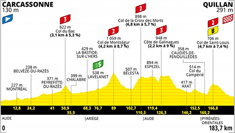 ![]() samedi 10 juillet 2021 ![]() 12h25 (Aude) : D119 Carcassonne (km 0) - Montréal (km 12.8) - D21 Villeneuve-lès-Montréal (km 17.5) - D18 Belvèze-du-Razès (km 24.2) - Bellegarde-du-Razès (près de) (km 29.5) - D626 Perrefitte-du-Razès (km 41) - D30 Courtauly (km 44) - Saint-Benoît (km 47.3) - D620 Col du Bac (km 50.9-GPM3) - Montjardin (près de) (km 54.7) - Chalabre (km 55.5) - Sainte-Colombe-sur-L'Hers (km 62.9) - (Ariège) : Le Peyrat (km 67.5) - La-Bastide-sur-L'Hers (km 68.3) - L'Aiguillon (km 73.2) - D117 Saint-Jean d'Aigues-Vives (près de) (km 76) - Lavelanet (km 76.7) - Villeneuve d'Olmes (81.2) - D9 Montferrier (km 83.1) - Col de Montségur (km 89-GPM2) - Montségur (km 90.2) - Fougax-et-Barrineuf (km 98.2) - Bélesta (km 102.7) - D16 Col de la Croix-des-Morts (km 110.3) - (Aude) : D29 Roquefeuil (près de) (km 117.6) - D613 Espezel (km 119.4) - D20 Côte de Galinagues (km 126.3) - Rodome (km 127.6) - Aunat (km 129.8) - Bessède-de-Sault (près de) (km 132.8) - D118 Axat (km 146.2) - D117 Col du Campérié (km 152.5) - (Pyrénées-Orientales) : Caudiès-de-Fenouillèdes (km 160.2) - D9 Col de Saint-Louis (km 166.8) - (Aude) : D109 Laval (km 178.2) - D117 Quillan/Bd. Charles De Gaulle (km 183.7). ![]() ![]() ![]() Vidéo Tour de France/DailyMotion ![]() Étape : ![]() 1. Bauke Mollema (Hol) en 4h16'16" (moy : 43.01 km/h) 2. Patrick Konrad (Aut) à 1'04" 3. Sergio Higuita (Col) 4. Mattia Cattaneo (Ita) à 1'06" 5. Michael Woods (Can) à 1'10" 6. Omar Fraile (Esp) à 1'25" 7. Elie Gesbert (Fra) 8. Quentin Pacher (Fra) 9. Louis Meintjes (Afs) à 1'26" 10. Esteban Chaves (Col) à 1'28" 11. Guillaume Martin (Fra) 12. Valentin Madouas (Fra) à 3'32" 13. Wout Poels (Hol) 14. Pierre Rolland (Fra) à 6'23" 15. Brandon McNulty (Usa) à 6'53" 16. Rui Costa (Por) 17. Rafal Majka (Pol) 18. Tadej Pogacar (Slo) 19. Dylan Van Baarle (Hol) 20. Richard Carapaz (Equ) 21. Richie Porte (Aus) 22. Jonathan Castroviejo (Esp) 23. Jasper Stuyven (Bel) 24. Kenny Elissonde (Fra) 25. Enric Mas (Esp) 26. Ruben Guerreiro (Por) 27. Alejandro Valverde (Esp) 28. Emanuel Buchmann (Ger) 29. Mark Donovan (GBr) 30. Wilco Kelderman (Hol) 31. Rigoberto Uran (Col) 32. Dylan Teuns (Bel) 33. Steven Kruijswijk (Hol) 34. Jan Bakelants (Bel) 35. Sepp Kuss (Usa) 36. Cyril Gautier (Fra) 37. Jonas Vingegaard (Dan) 38. Ion Izagirre (Esp) 39. Lorenzo Rota (Ita) 40. Cristian Rodriguez (Esp) 41. Neilson Powless (Usa) 42. Alexey Lutsenko (Kaz) 43. Ben O'Connor (Aus) 44. David Gaudu (Fra) 45. Aurélien Paret-Peintre (Fra) 46. Vincenzo Nibali (Ita) 47. Pello Bilbao (Esp) 48. Michal Kwiatkowski (Pol) 49. Sergio Henao (Col) 50. Davide Formolo (Ita) 51. Julien Bernard (Fra) à 9'15" 52. Michael Schär (Sui) à 9'52" 53. Tao Geoghegan Hart (Gbr) 54. Jorge Arcas (Esp) 55. Miguel Angel Lopez (Col) 56. Hugo Houle (Can) 57. Daniel Martin (Irl) 58. Georg Zimmermann (Gbr) 59. Nils Politt (Gbr) 60. Christopher Juul-Jensen (Dan) 61. Jakob Fuglsang (Dan) à 12'57" 62. Kasper Asgreen (Dan) à 13'15" 63. Jesus Herrada (Esp) 64. Michael Valgren (Dan) 65. Nairo Quintana (Col) 66. Ruben Fernandez (Esp) 67. Sonny Colbrelli (Ita) 68. Dmitriy Gruzdev (Kaz) 69. Carlos Verona (Esp) 70. Stefan Küng (Sui) 71. Julian Alaphilippe (Fra) 72. Wout Van Aert (Bel) 73. Franck Bonnamour (Fra) 74. Marc Hirschi (Sui) 75. Simon Geschke (Gbr) 76. Ide Schelling (Hol) 77. Toms Skujins (Lat) 78. Geraint Thomas (Gbr) 79. Jonas Rutsch (Gbr) à 16'47" 80. Magnus Cort (Dan) 81. Michael Matthews (Aus) à 17'04" 82. Luka Mezgec (Slo) 83. Luke Durbridge (Aus) 84. Mikkel Bjerg (Dan) 85. Thomas De Gendt (Bel) à 17'42" 86. Kristian Sbaragli (Ita) 87. André Greipel (Gbr) 88. Maxime Chevalier (Fra) 89. Mike Teunissen (Hol) 90. Rick Zabel (Gbr) 91. Simon Clarke (Aus) 92. Dorian Godon (Fra) 93. Daniel Oss (Ita) 94. Chris Froome (Gbr) 95. Christophe Laporte (Fra) 96. Silvan Dillier (Sui) 97. Omer Goldstein (Isr) 98. Connor Swift (Gbr) 99. Cyril Barthe (Fra) 100. Jasper Philipsen (Bel) 101. Fred Wright (Gbr) 102. Xandro Meurisse (Bel) 103. Greg Van Avermaet (Bel) 104. Alex Aranburu (Esp) 105. Philippe Gilbert (Bel) 106. Danny Van Poppel (Hol) 107. Pierre-Luc Périchon (Fra) 108. Brent Van Moer (Bel) 109. Pierre Latour (Fra) 110. Harry Sweeny (Aus) 111. Matej Mohoric (Slo) 112. Ivan Garcia (Esp) 113. Fabien Doubey (Fra) 114. Lukas Pöstlberger (Aut) 115. Marco Haller (Aut) 116. Jelle Wallays (Bel) 117. Oliver Naesen (Bel) 118. Imanol Erviti (Esp) 119. Guillaume Boivin (Can) 120. Boy Van Poppel (Hol) 121. Vegard Stake Laengen (Nor) 122. Petr Vakoc (Tch) 123. Sean Bennett (Usa) 124. Bruno Armirail (Fra) 125. Benoit Cosnefroy (Fra) 126. Anthony Perez (Fra) 127. Jeremy Cabot (Fra) 128. Davide Ballerini (Ita) à 25'34" 129. Casper Pedersen (Dan) 130. Nils Eekhoff (Hol) 131. Reto Hollenstein (Sui) 132. Edvald Boasson Hagen (Nor) 133. Michael Mørkøv (Dan) 134. Anthony Turgis (Fra) 135. Dries Devenyns (Bel) 136. Julien Simon (Fra) 137. Tim Declercq (Bel) 138. Edward Theuns (Bel) 139. Maximilian Walscheid (Gbr) 140. Joris Nieuwenhuis (Hol) 141. Victor De la Parte (Esp) 142. Stefan Bissegger (Sui) 143. Carlos Barbero (Esp) 144. Mark Cavendish (Gbr) 145. Mads Pedersen (Dan) 146. Jonas Rickaert (Bel) 147. Nacer Bouhanni (Fra) à 36'46" 148. Amund Grøndahl Jansen (Nor) 149. Cees Bol (Hol) Abandon : Warren Barguil (Fra) Søren Kragh Andersen (Dan) Point-bonus - km 168.8 - Col de Saint-Louis Bauke Mollema (Hol) 8" Michael Woods (Can) 5" Sergio Higuita (Col) 2" Bonifications étape : Bauke Mollema (Hol) 10" Patrick Konrad (Aut) 6" Sergio Higuita (Col) 4" Prix de la combativité : Bauke Mollema (Hol) Classement général : ![]() 1. Tadej Pogacar (Slo) en 56h50'21" 2. Guillaume Martin (Fra) à 4'04" 3. Rigoberto Uran (Col) à 5'18" 4. Jonas Vingegaard (Dan) à 5'32" 5. Richard Carapaz (Equ) à 5'33" 6. Ben O'Connor (Aus) à 5'58" 7. Wilco Kelderman (Hol) à 6'16" 8. Alexey Lutsenko (Kaz) à 6'30" 9. Enric Mas (Esp) à 7'11" 10. Mattia Cattaneo (Ita) à 9'48" 11. Pello Bilbao (Esp) à 10'28" 