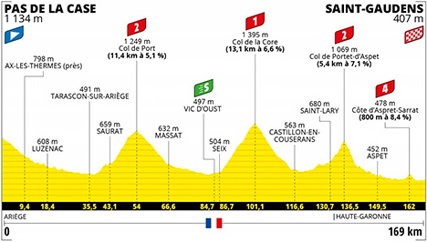 ![]() mardi 13 juillet 2021 ![]() 13h05 (ANDORRE) - CG2 Pas de la Case/Pas de la Casa - (FRANCE) - (Ariège) : N20 L'Hospitalet-près-l'Andorre - Pas-de-la-Case (km 0) - Mérens-les-Vals (km 2.4) - Ax-les-Thermes (près de) (km 9.4) - Luzenac (km 18.4) - Les Cabanes (près de) (km 26.6) - Ornolac (km 33.2) - Ussat-les-Bains (km 33.6) - Tarascon-sur-Ariège (km 35.5) - D618 Surba (km 38.6) - Saurat (km 43.1) - Col de Port (km 54-GPM2) - Massat (km 66.6) - Biert (km 69.6) - Castet d'Aleu (km 77.3) - D3 Vic d'Oust (km 84.7-sprint) - Seix (km 86.7) - D17 Sentenac d'Oust (km 89.9) - Col de la Core (km 101.1-GPM1) - Arrien-en-Bethmale (km 113.1) - D4 Castillon-en-Couserans (km 116.6) - D618 Audressein (km 118.3) - Aucazein (km 122.9) - Illartein (km 123.6) - Saint-Lary (km 130.7) - (Haute-Garonne) : Portet d'Aspet (km 134) - Col de Portet d'Aspet (km 136.5-GPM2) - Sengouagnet (km 146.3) - D5 Aspet (km 149.5) - Soueich (km 154.3) - D26 Encausse-les-Thermes (km 157) - D39 Aspret-Sarrat (km 161) - Côte d'Aspret-Sarrat (km 162-GPM4) - D39 Valentine (km 163.7) - D817 Saint-Gaudens/Av. René Dreyfus (km 169). ![]() ![]() ![]() Vidéo Tour de France/DailyMotion ![]() Étape : ![]() 1. Patrick Konrad (Aut) en 4h01'59" (moy : 41.09 km/h) 2. Sonny Colbrelli (Ita) à 42" 3. Michael Matthews (Aus) 4. Pierre-Luc Périchon (Fra) 5. Franck Bonnamour (Fra) 6. Alex Aranburu (Esp) 7. Toms Skujins (Let) à 45" 8. Jan Bakelants (Bel) 9. David Gaudu (Fra) à 47" 10. Lorenzo Rota (Ita) à 1'03" 11. Fabien Doubey (Fra) à 4'39" 12. Fred Wright (Gbr) à 4'41" 13. Richard Carapaz (Equ) à 13'49" 14. Tadej Pogacar (Slo) 15. Alexey Lutsenko (Kaz) 16. Jonas Vingegaard (Dan) 17. Rigoberto Uran (Col) 18. Wilco Kelderman (Hol) 19. Ben O'Connor (Aus) 20. Mattia Cattaneo (Ita) 21. Enric Mas (Esp) 22. Pello Bilbao (Esp) 23. Guillaume Martin (Fra) à 13'53" 24. Davide Formolo (Ita) à 14'12" 25. Wout Van Aert (Bel) à 14'22" 26. Dorian Godon (Fra) à 14'44" 27. Michael Schär (Sui) 28. Edward Theuns (Bel) 29. Magnus Cort (Dan) 30. Dylan Teuns (Bel) 31. Louis Meintjes (Afs) 32. Cyril Barthe (Fra) 33. Aurélien Paret-Peintre (Fra) 34. Julien Bernard (Fra) 35. Neilson Powless (Usa) 36. Quentin Pacher (Fra) 37. Silvan Dillier (Sui) 38. Ruben Guerreiro (Por) 39. Jonas Rutsch (All) 40. Mike Teunissen (Hol) 41. Xandro Meurisse (Bel) 42. Bauke Mollema (Hol) 43. Esteban Chaves (Col) 44. Sergio Henao (Col) 45. Alejandro Valverde (Esp) 46. Carlos Barbero (Esp) 47. Greg Van Avermaet (Bel) 48. Kenny Elissonde (Fra) 49. Ruben Fernandez (Esp) à 14'57" 50. Georg Zimmermann (All) 51. Emanuel Buchmann (All) 52. Jonathan Castroviejo (Esp) 53. Miguel Angel Lopez (Col) 54. Marc Hirschi (Sui) 55. Michael Valgren (Dan) 56. Tao Geoghegan Hart (Gbr) à 15'08" 57. Simon Geschke (All) 58. Dylan Van Baarle (Hol) 59. Oliver Naesen (Bel) 60. Hugo Houle (Can) à 15'14" 61. Matej Mohoric (Slo) à 15'17" 62. Brandon McNulty (Usa) à 15'20" 63. Nils Politt (All) 64. Ion Izagirre (Esp) à 15'24" 65. Sepp Kuss (Usa) à 15'40" 66. Anthony Perez (Fra) à 16'31" 67. Rafal Majka (Pol) à 16'33" 68. Rui Costa (Por) 69. Thomas De Gendt (Bel) à 16'42" 70. Jakob Fuglsang (Dan) 71. Ivan Garcia (Esp) 72. Richie Porte (Aus) 73. Philippe Gilbert (Bel) 74. Daniel Oss (Ita) 75. Julien Simon (Fra) 76. Omar Fraile (Esp) 77. Brent Van Moer (Bel) 78. Jasper Philipsen (Bel) 79. Nairo Quintana (Col) 80. Petr Vakoc (Tch) 81. Kasper Asgreen (Dan) 82. Imanol Erviti (Esp) 83. Kristian Sbaragli (Ita) 84. Jorge Arcas (Esp) 85. Cristian Rodriguez (Esp) 86. Victor De la Parte (Esp) 87. Joris Nieuwenhuis (Hol) 88. Jesus Herrada (Esp) 89. Carlos Verona (Esp) 90. Benoit Cosnefroy (Fra) 91. Maxime Chevalier (Fra) 92. Sergio Higuita (Col) 93. Pierre Latour (Fra) 94. Jonas Rickaert (Bel) 95. Valentin Madouas (Fra) 96. Luka Mezgec (Slo) 97. Stefan Bissegger (Sui) 98. Wout Poels (Hol) 99. Marco Haller (Aut) 100. Mark Donovan (Gbr) 101. Geraint Thomas (Gbr) 102. Daniel Martin (Irl) 103. Pierre Rolland (Fra) 104. Danny Van Poppel (Hol) 105. Stefan Küng (Sui) 106. Omer Goldstein (Isr) 107. Cyril Gautier (Fra) 108. Elie Gesbert (Fra) 109. Ide Schelling (Hol) à 16'50" 110. Mikkel Bjerg (Dan) à 17'56" 111. Harry Sweeny (Aus) 112. Steven Kruijswijk (Hol) 113. Luke Durbridge (Aus) 114. Vegard Stake Laengen (Nor) 115. Julian Alaphilippe (Fra) 116. Jasper Stuyven (Bel) 117. Mads Pedersen (Dan) 118. Michal Kwiatkowski (Pol) 119. Christophe Laporte (Fra) 120. Lukas Pöstlberger (Aut) 121. Casper Pedersen (Dan) 122. Bruno Armirail (Fra) 123. Anthony Turgis (Fra) 124. Dmitriy Gruzdev (Kaz) 125. Jeremy Cabot (Fra) 126. Connor Swift (Gbr) 127. Michael Woods (Can) 128. Christopher Juul-Jensen (Dan) à 18'02" 129. Reto Hollenstein (Sui) à 23'40" 130. Guillaume Boivin (Can) 131. Chris Froome (Gbr) 132. Maximilian Walscheid (All) 133. André Greipel (All) 134. Rick Zabel (All) 135. Mark Cavendish (Gbr) 136. Simon Clarke (Aus) 137. Sean Bennett (Usa) 138. Davide Ballerini (Ita) 139. Tim Declercq (Bel) 140. Michael Mørkøv (Dan) 141. Jelle Wallays (Bel) 142. Boy Van Poppel (Hol) 143. Dries Devenyns (Bel) 144. Cees Bol (Hol) 145. Nils Eekhoff (Hol) Non-partant : Vincenzo Nibali (Ita) Amund Grøndahl Jansen (Nor) Bonifications étape : Patrick Konrad (Aut) 10" Sonny Colbrelli (Ita) 6" Michael Matthews (Aus) 4" Prix de la combativité : Patrick Konrad (Aut) Classement général : ![]() 1. Tadej Pogacar (Slo) en 66h23'06" 2. Rigoberto Uran (Col) à 5'18" 3. Jonas Vingegaard (Dan) à 5'32" 4. Richard Carapaz (Equ) à 5'33" 5. Ben O'Connor (Aus) à 5'58" 6. Wilco Kelderman (Hol) à 6'16" 7. Alexey Lutsenko (Kaz) à 7'01" 8. Enric Mas (Esp) à 7'11" 9. Guillaume Martin (Fra) à 8'02" 10. Pello Bilbao (Esp) à 10'59" 11. David Gaudu (Fra) à 14'13" 12. Mattia Cattaneo (Ita) à 14'45" 13. Aurélien Paret-Peintre (Fra) à 22'10" 14. Esteban Chaves (Col) à 23'46" 15. Louis Meintjes (Afs) à 30'11" 16. Wout Van Aert (Bel) à 32'16" 17. Sergio Henao (Col) à 37'43" 18. Wout Poels (Hol) à 38'42" 19. Dylan Teuns (Bel) à 44'
